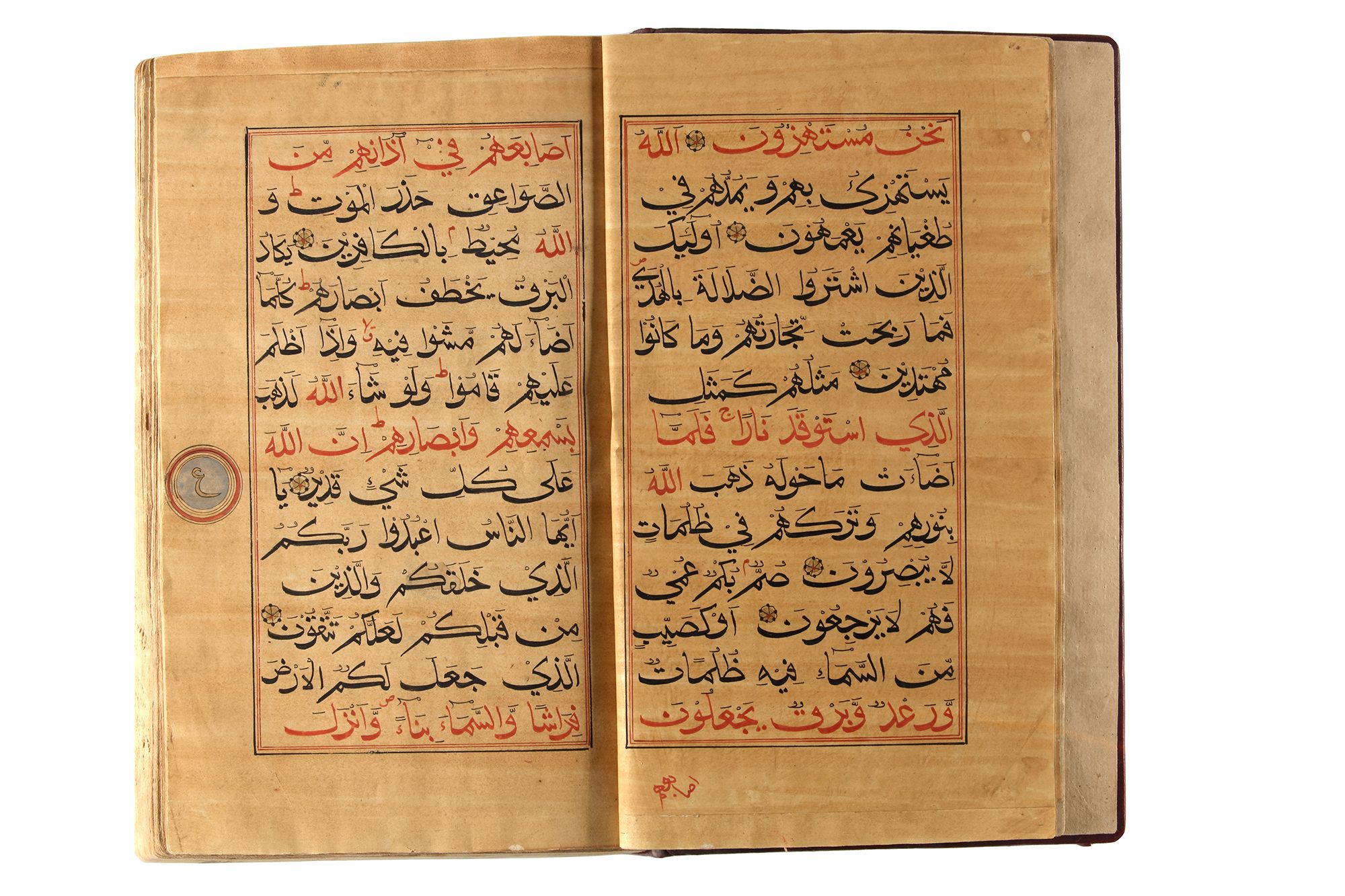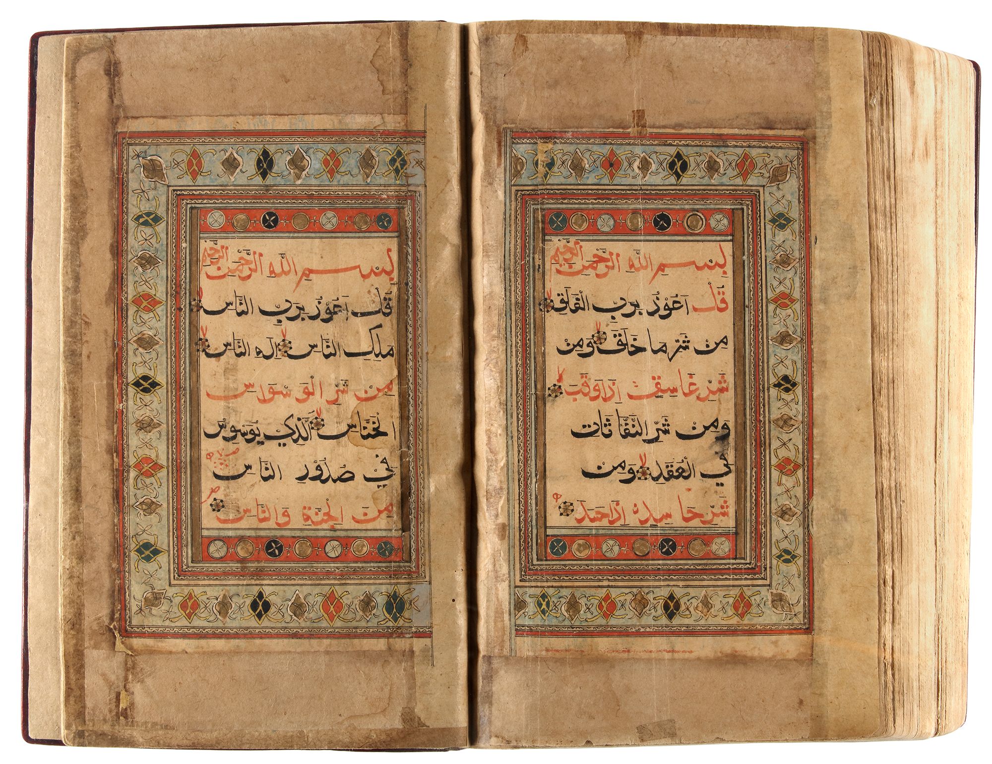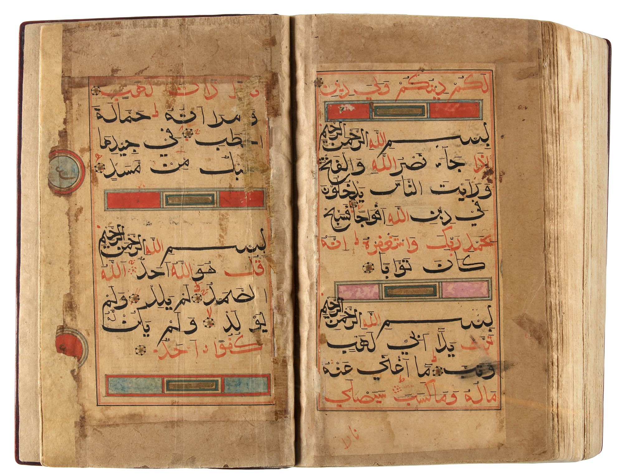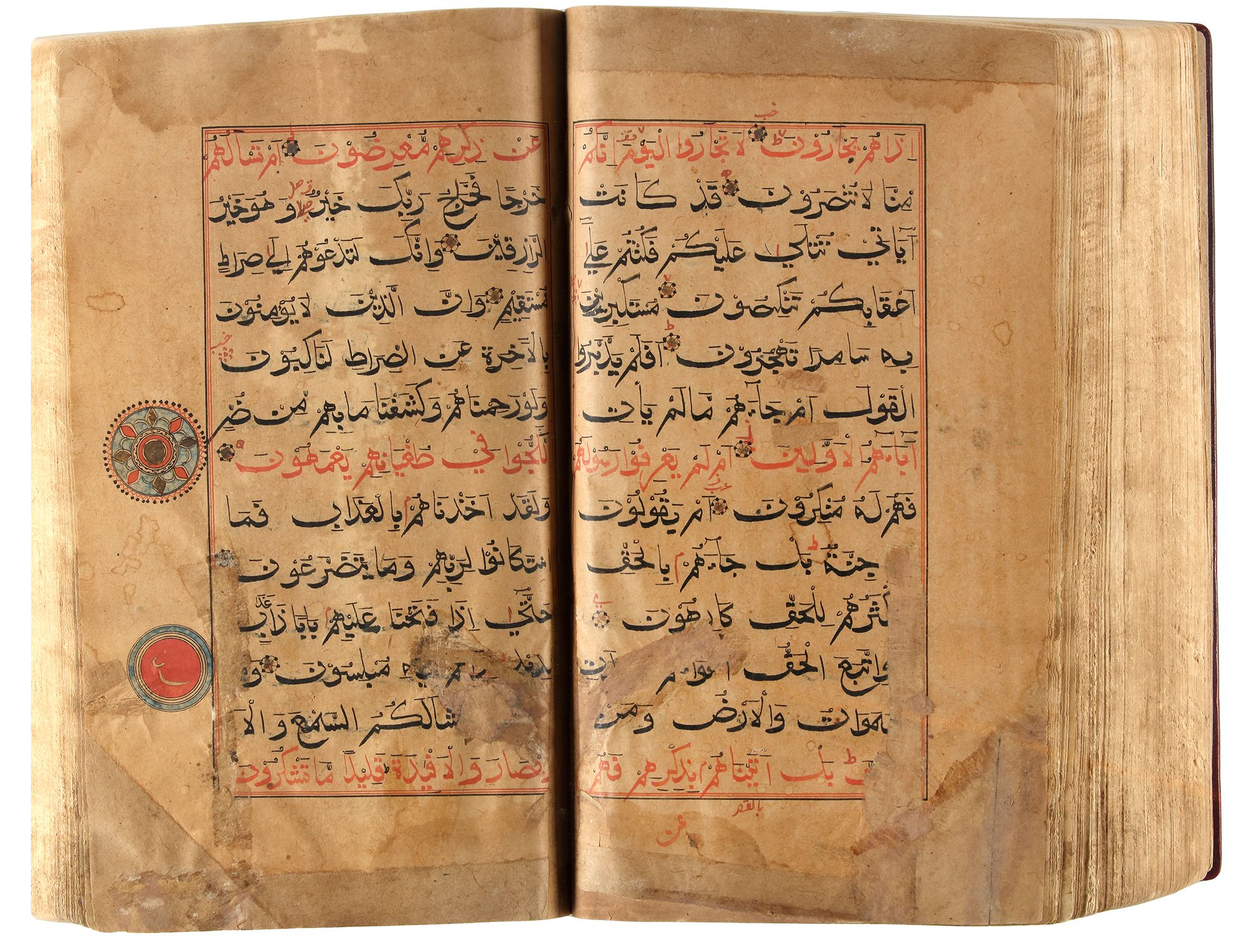 Arabic manuscript on cream-colored thin paper, 630 leaves, 13 lines to the page written in large and dispersed bihari script, first, seventh and thirteenth lines on each page written in red ink. Remaining lines written in black ink with diacritics and vowel points in black, the work Allah and some other significant words picked out in red, gold rosettes decorated with blue and red dots between verses, inner margins ruled in blue and red, catchwords, circular and pear-shaped devices in predominantly red, yellow and white colored panels between surahs left blank, two double pages of illumination at beginning and end with outer borders decorated with intertwining stylized floral and vegetal motifs interspersed with gold lozenges. 31 by 18 cm.