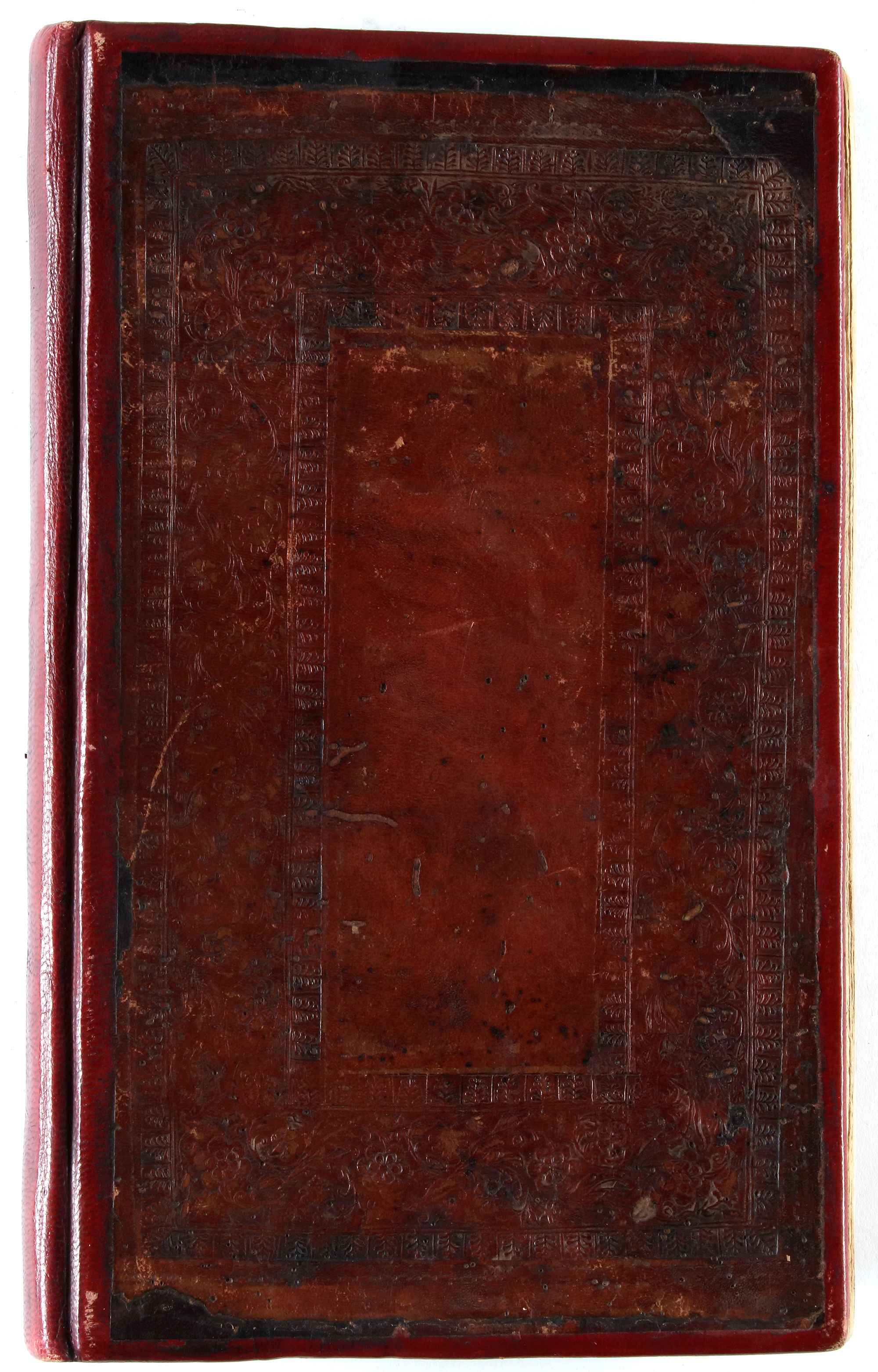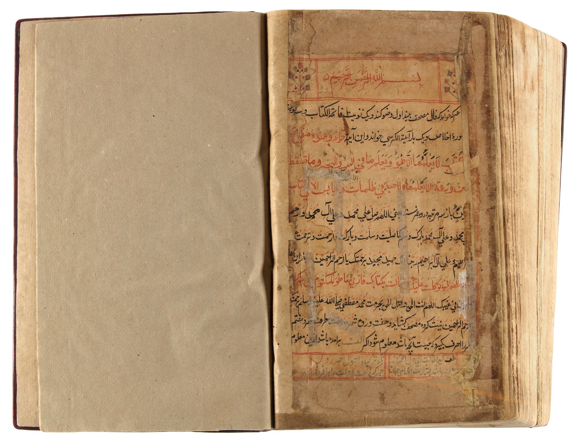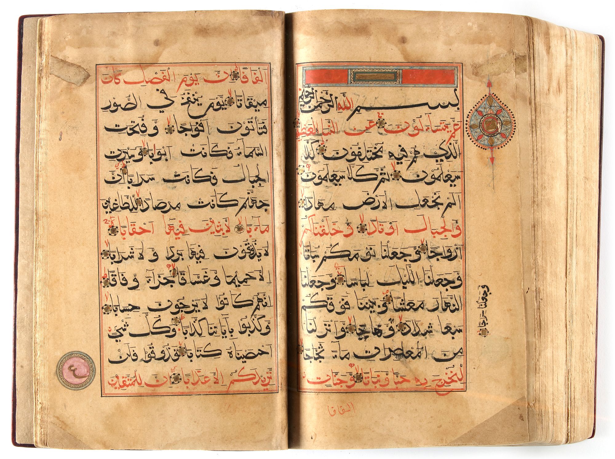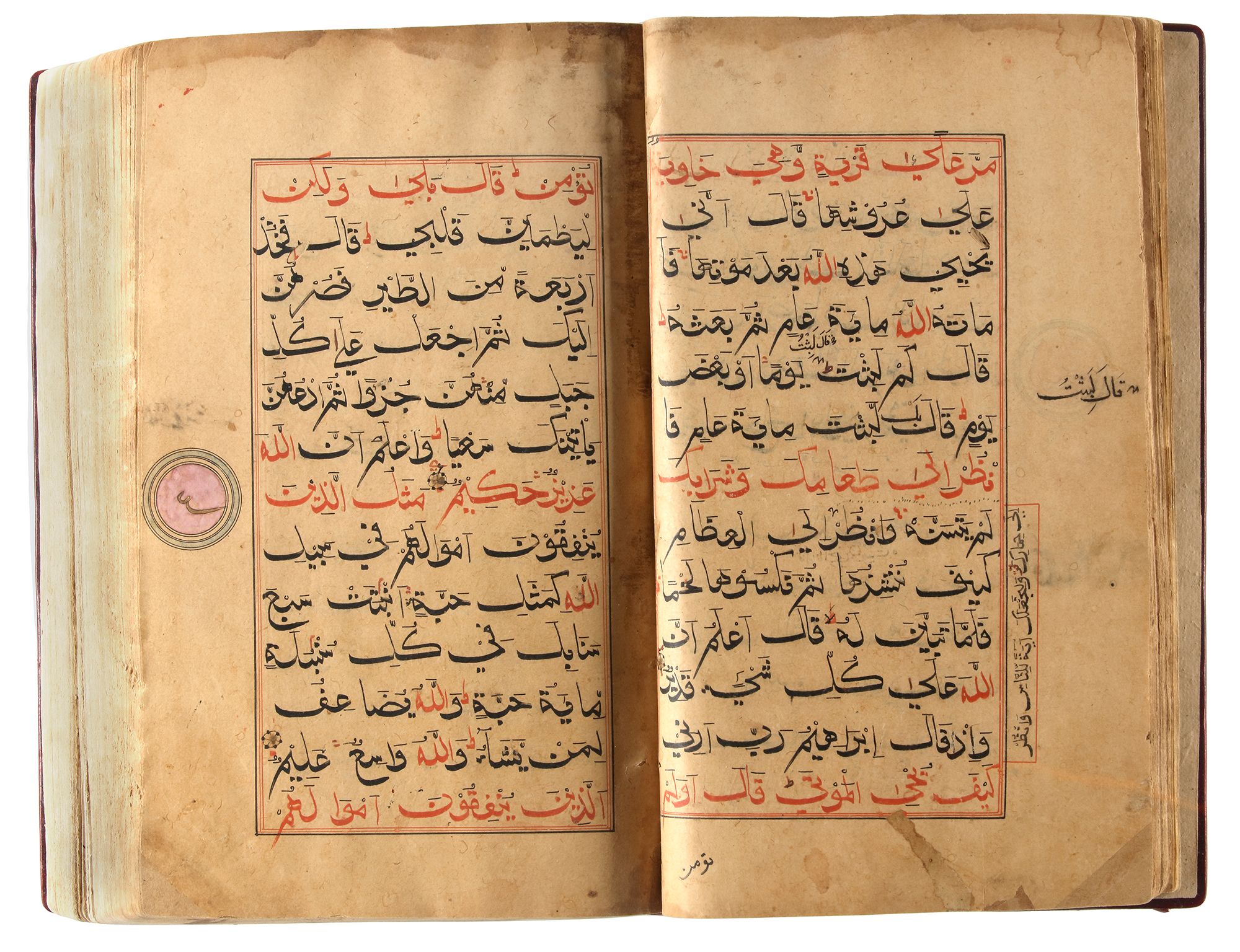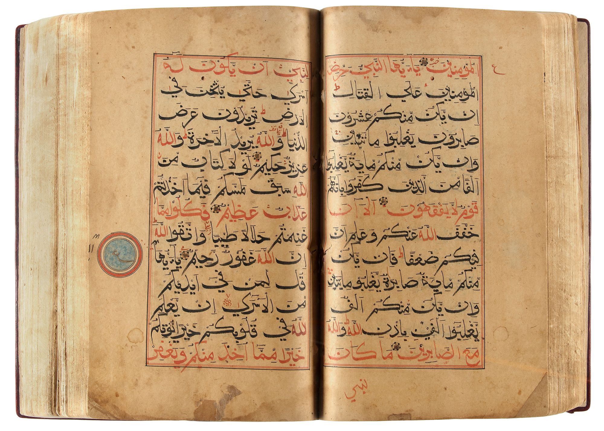 Arabic manuscript on cream-colored thin paper, 630 leaves, 13 lines to the page written in large and dispersed bihari script, first, seventh and thirteenth lines on each page written in red ink. Remaining lines written in black ink with diacritics and vowel points in black, the work Allah and some other significant words picked out in red, gold rosettes decorated with blue and red dots between verses, inner margins ruled in blue and red, catchwords, circular and pear-shaped devices in predominantly red, yellow and white colored panels between surahs left blank, two double pages of illumination at beginning and end with outer borders decorated with intertwining stylized floral and vegetal motifs interspersed with gold lozenges. 31 by 18 cm.