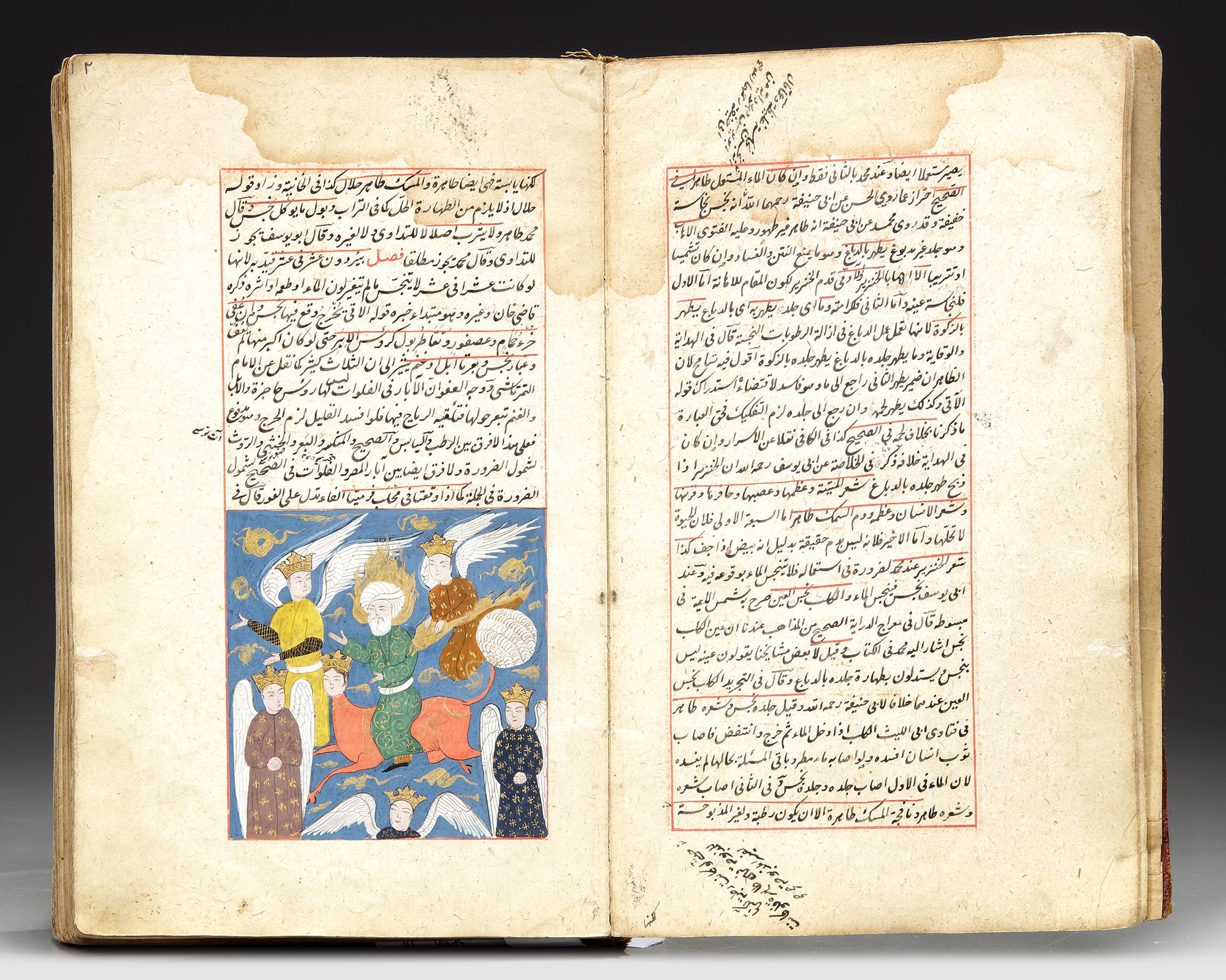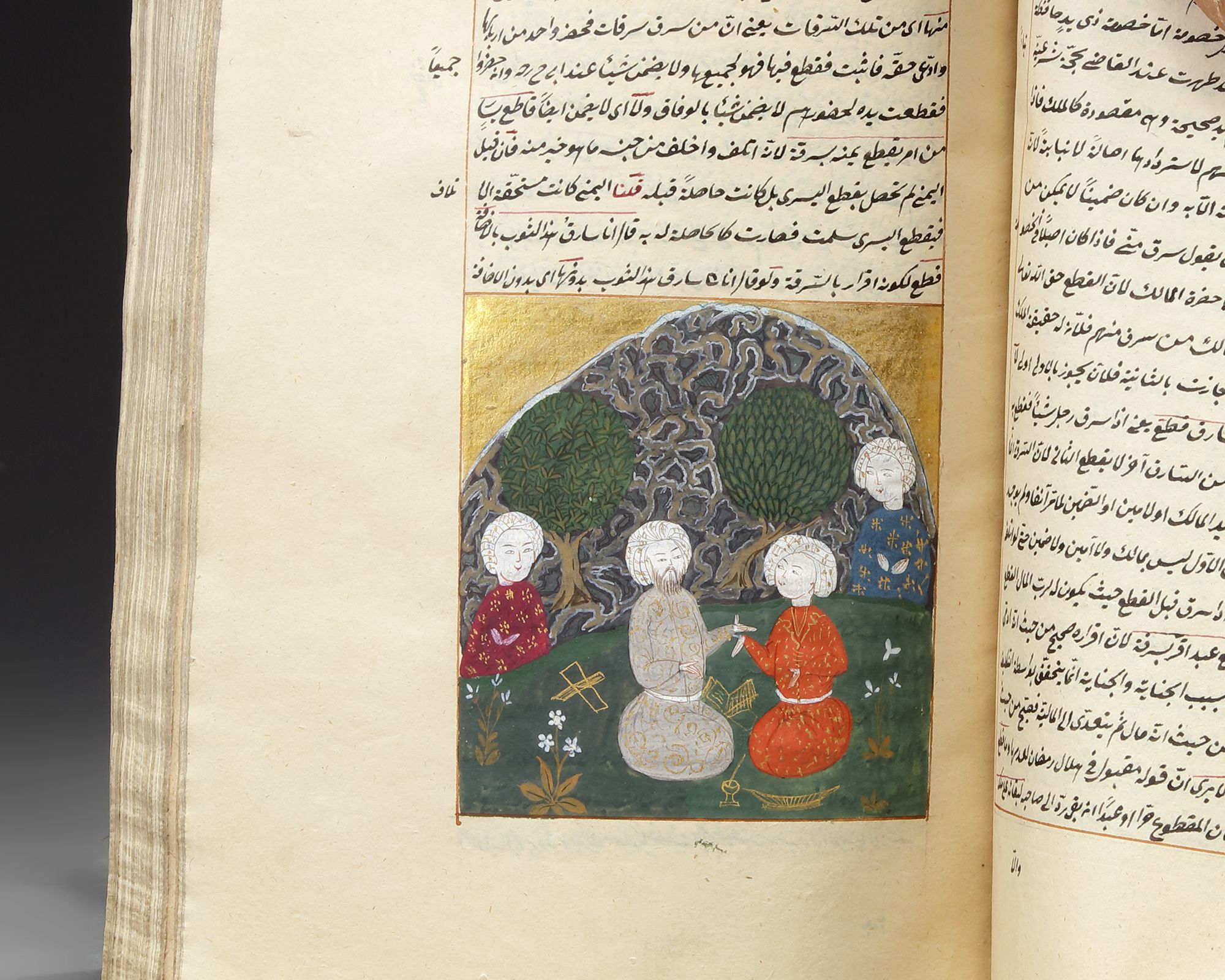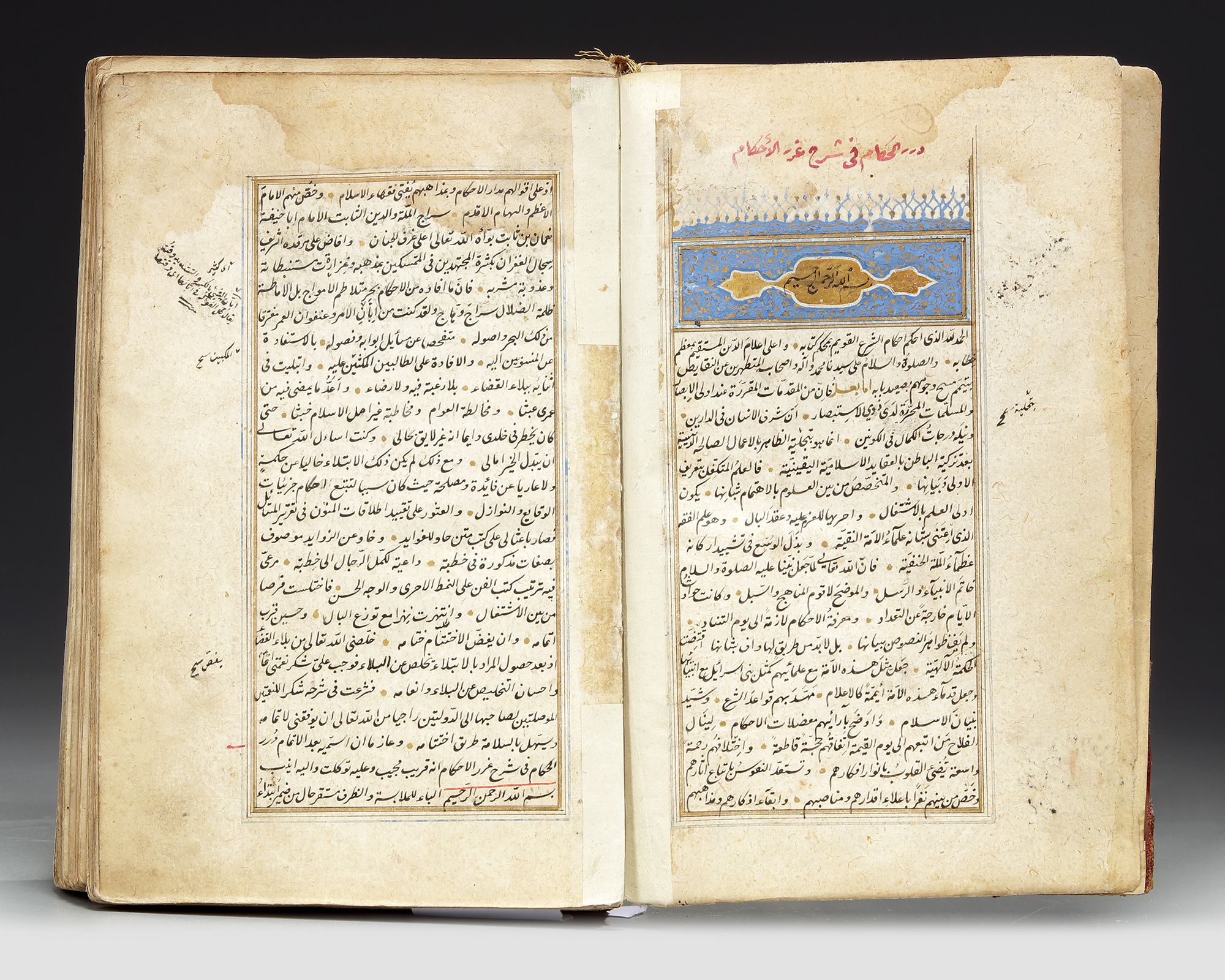 Muhammad bin Framers Mulla Khusrow Hanafi, 885 AH/1480 AD. Copied by Muhammad Amin, Istanbul,1253 AH/1832 AD. About Hanafi Fiqh: human understanding of the divine Islamic law as revealed in the Quran. An Arabic manuscript on paper, with 410 pages and 25 lines to a page. Written in clear naskh script in black ink with headings, keywords and annotations in red ink with five miniatures. Numerous neatly written marginal notes and insertions in different hands. Hardcover. 22 by 14.5 cm.