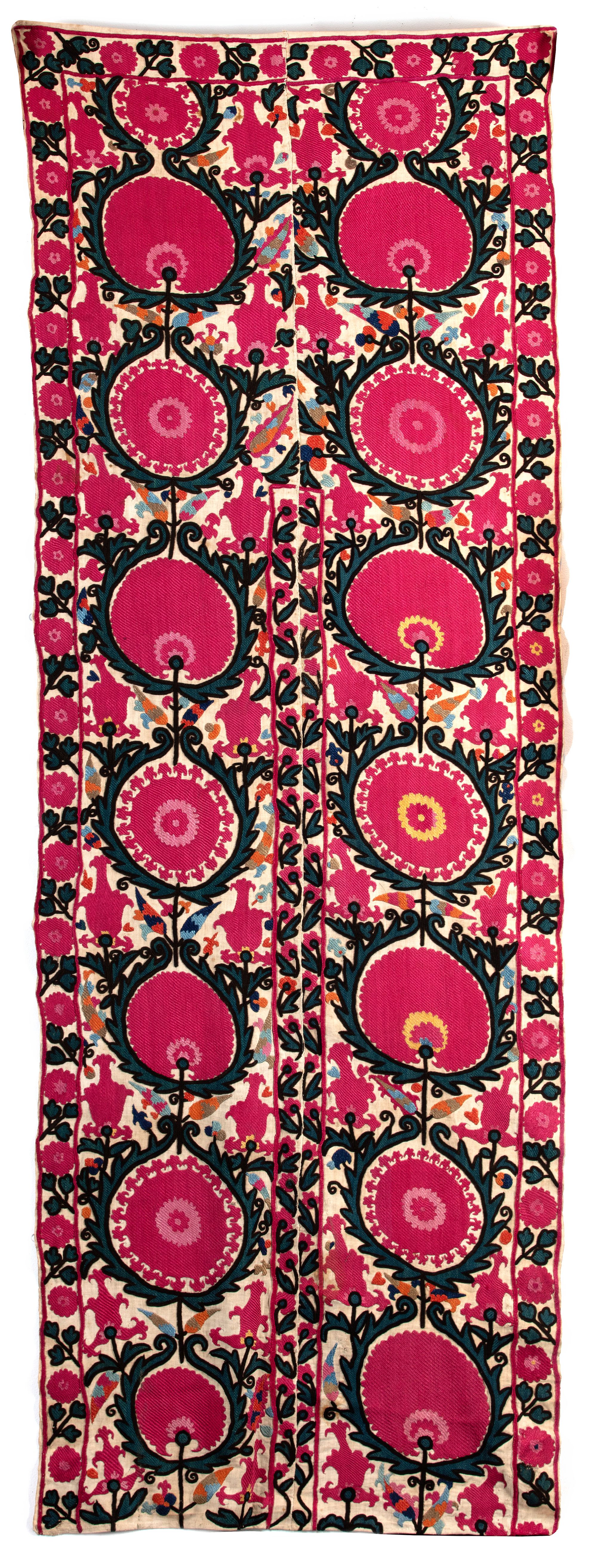Entirely couched in silk with two bands of large pomegranate shaped roundels enclosing different large heads of flowers and interspersed with flower sprays.