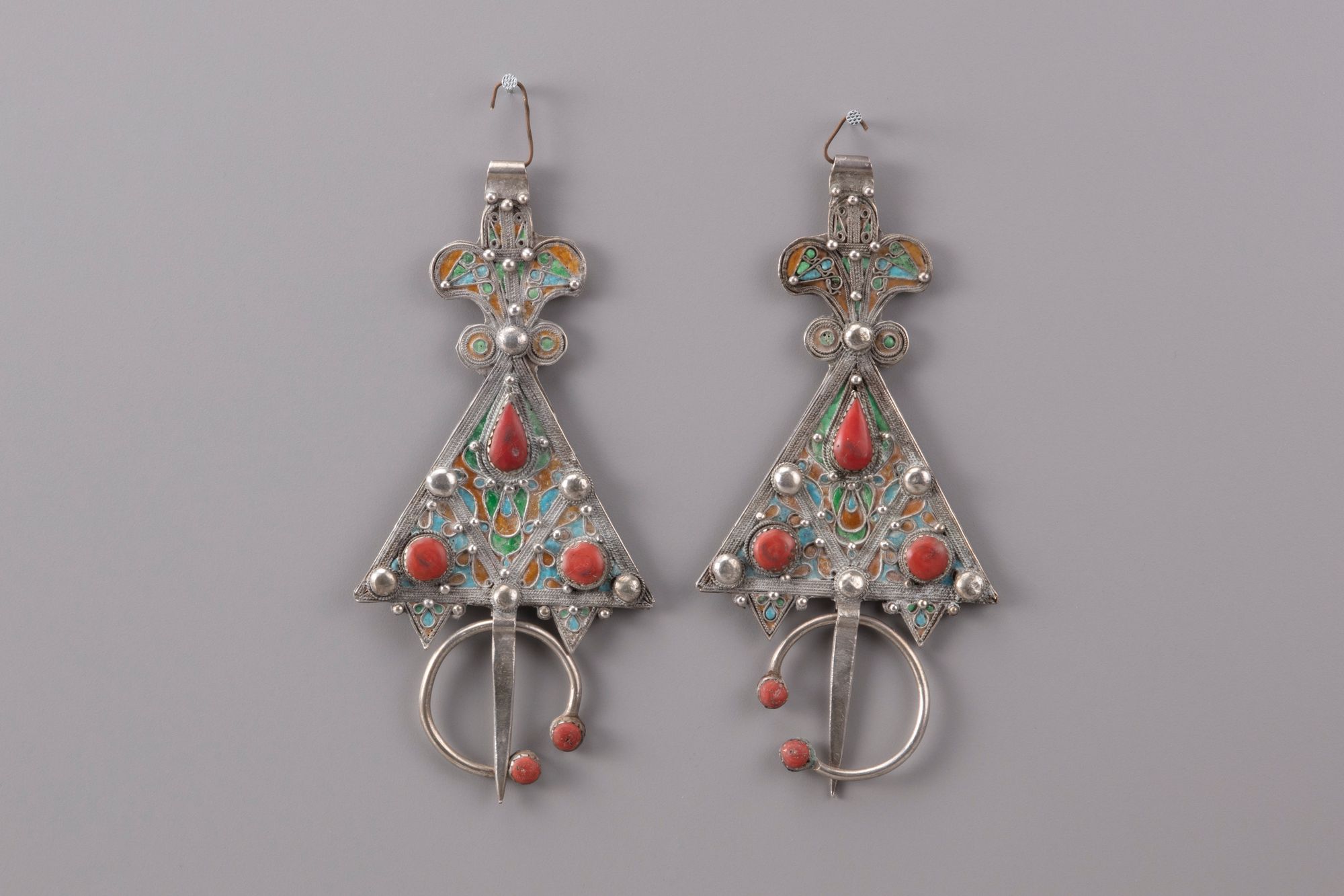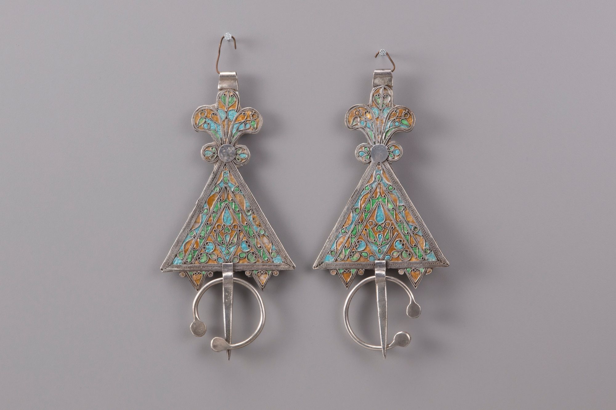 Triangular silver fibulae with chiseled and inlaid blue, green and yellow-enameled decoration and enhanced with red coral cabochons and silver beads, with long needle and movable ring which helps secure the fibula to the textile.