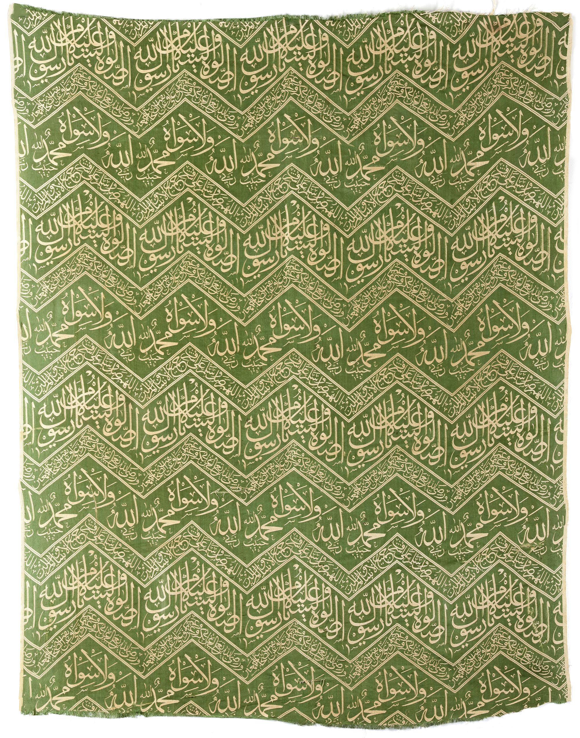 A fragment of hanging panel of the inner kiswa, with an inscribed weave in cream color over a light green silk ground. Embellished with a prominent inscription within a broad border in thuluth script of praise of the prophet ‘Prayer and peace be upon you, O Messenger of Allah’. Below with a narrow band containing prayers for the four righteous caliphs Abu Bakr, ‘Umar, ‘Uthman and ‘Ali as well as for the companions of the Prophet.