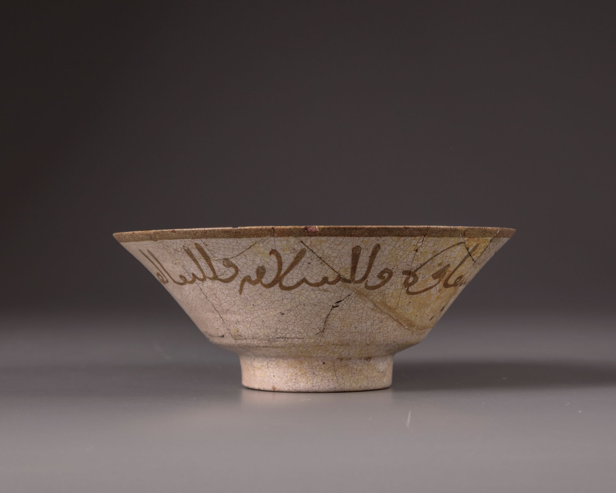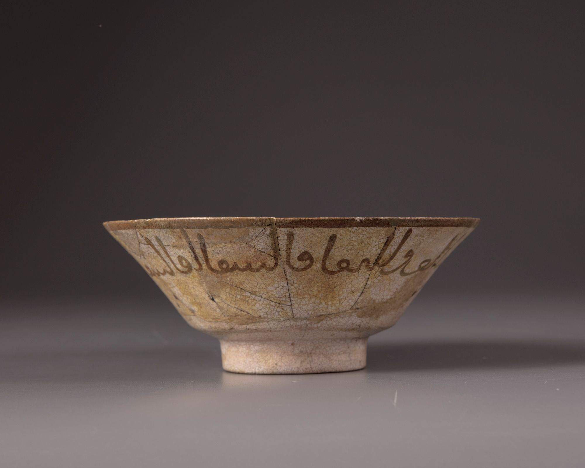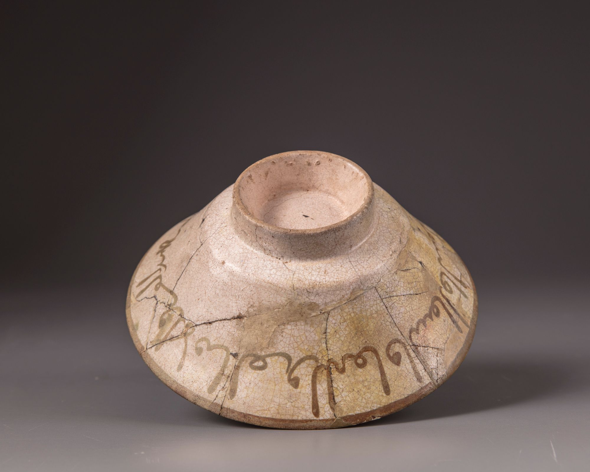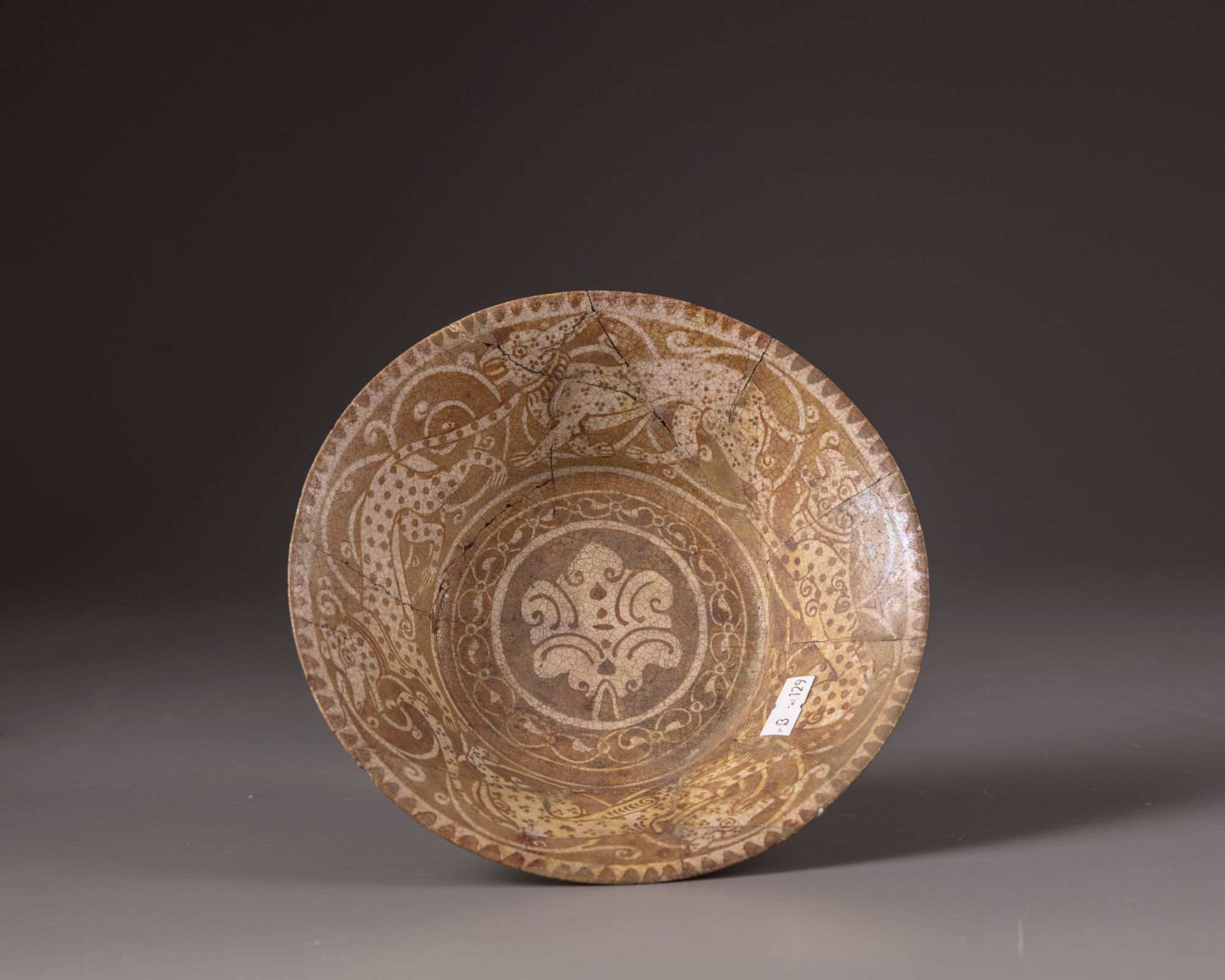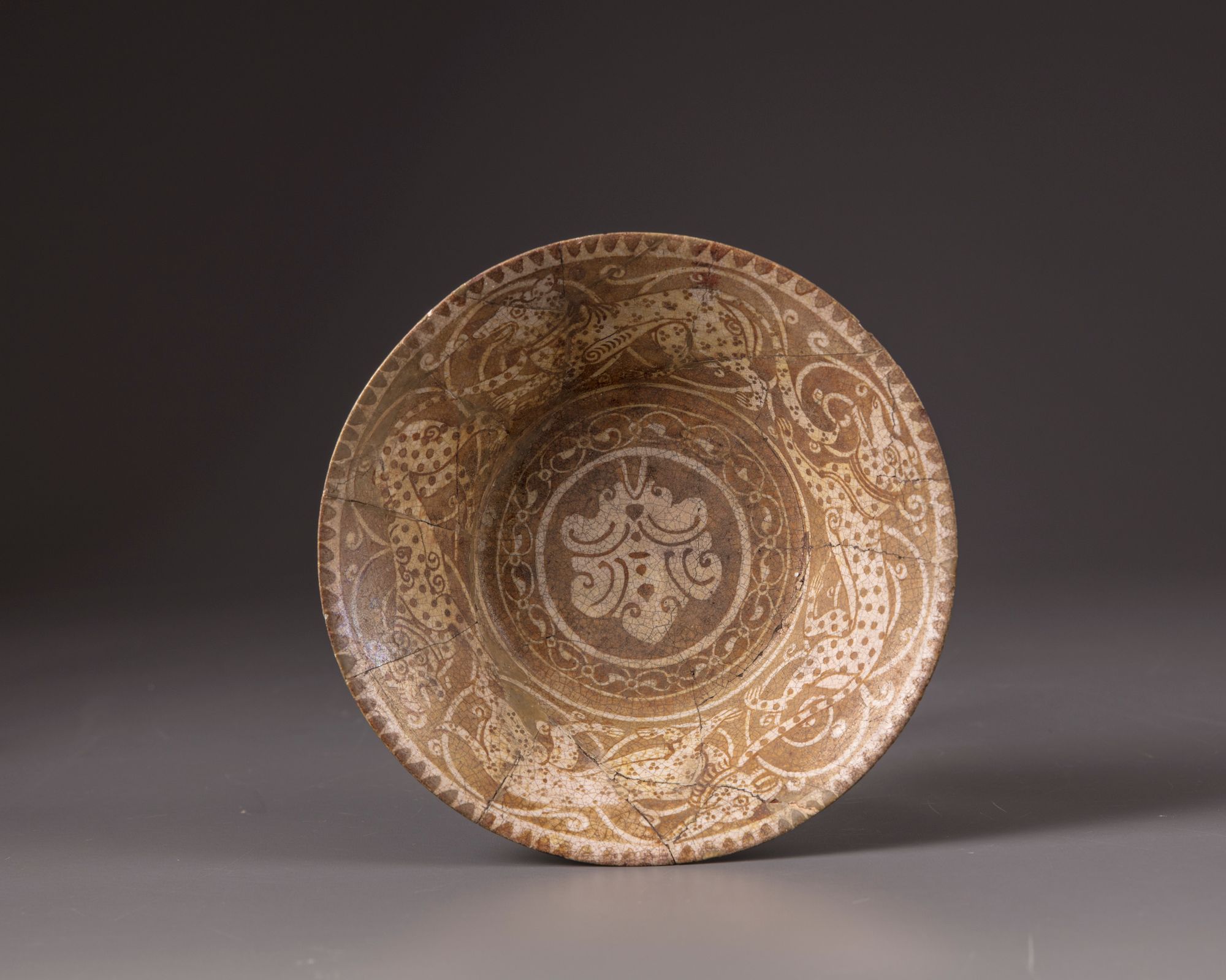 The bowl is with a small foot and flaing sides, decorated with a large flowerhead to the centre and animals to the sides on a brown ground,