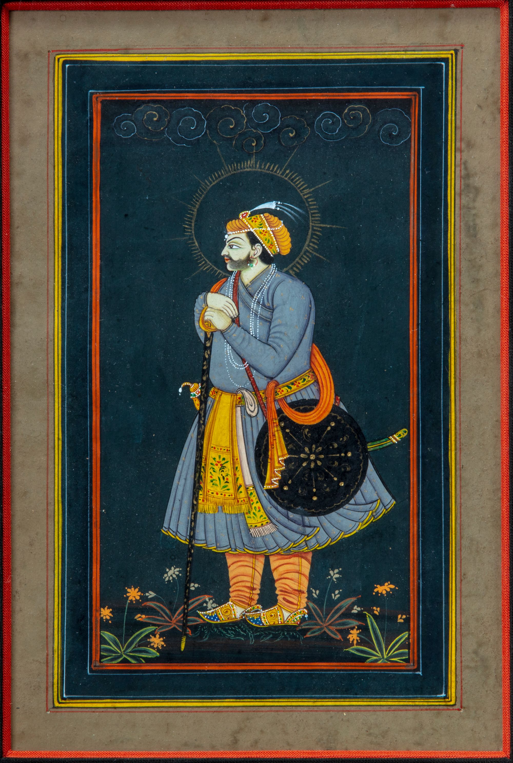 Gouache heightened with gold on paper, depicting a Mughal standing prince, wearing a jewelled red and gold turban, floral patka , holding a sword, a halo around his head, with a jewelled katar secured in his belt, laid down on an album page with leafy outer margins set with applied foliate cartouches in different colours, laid down within gold rules and minor borders of gold.