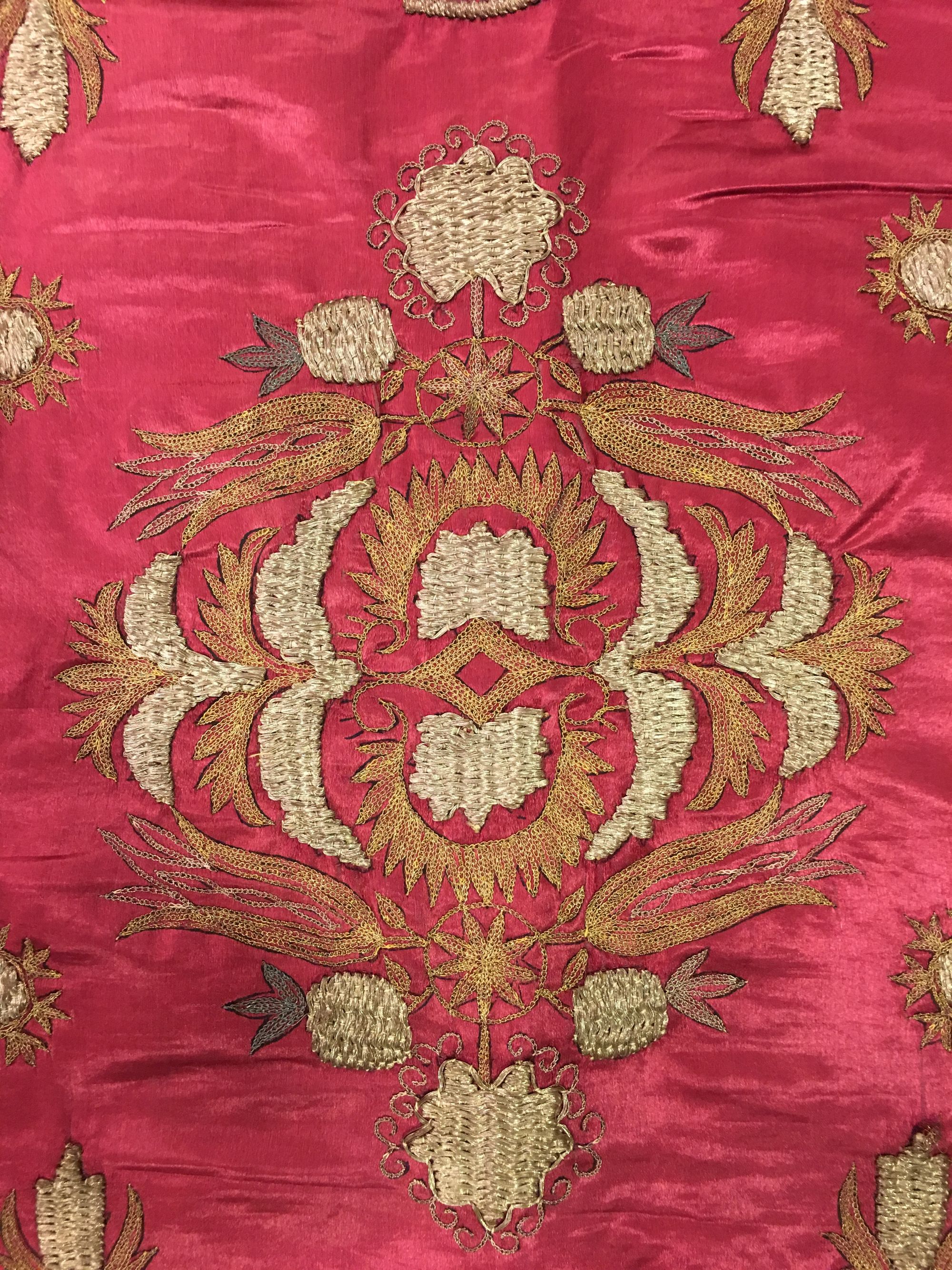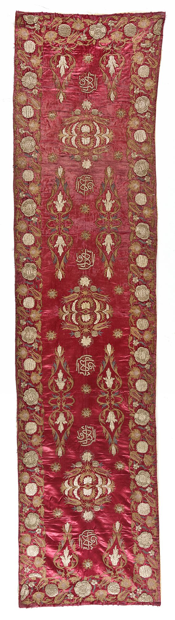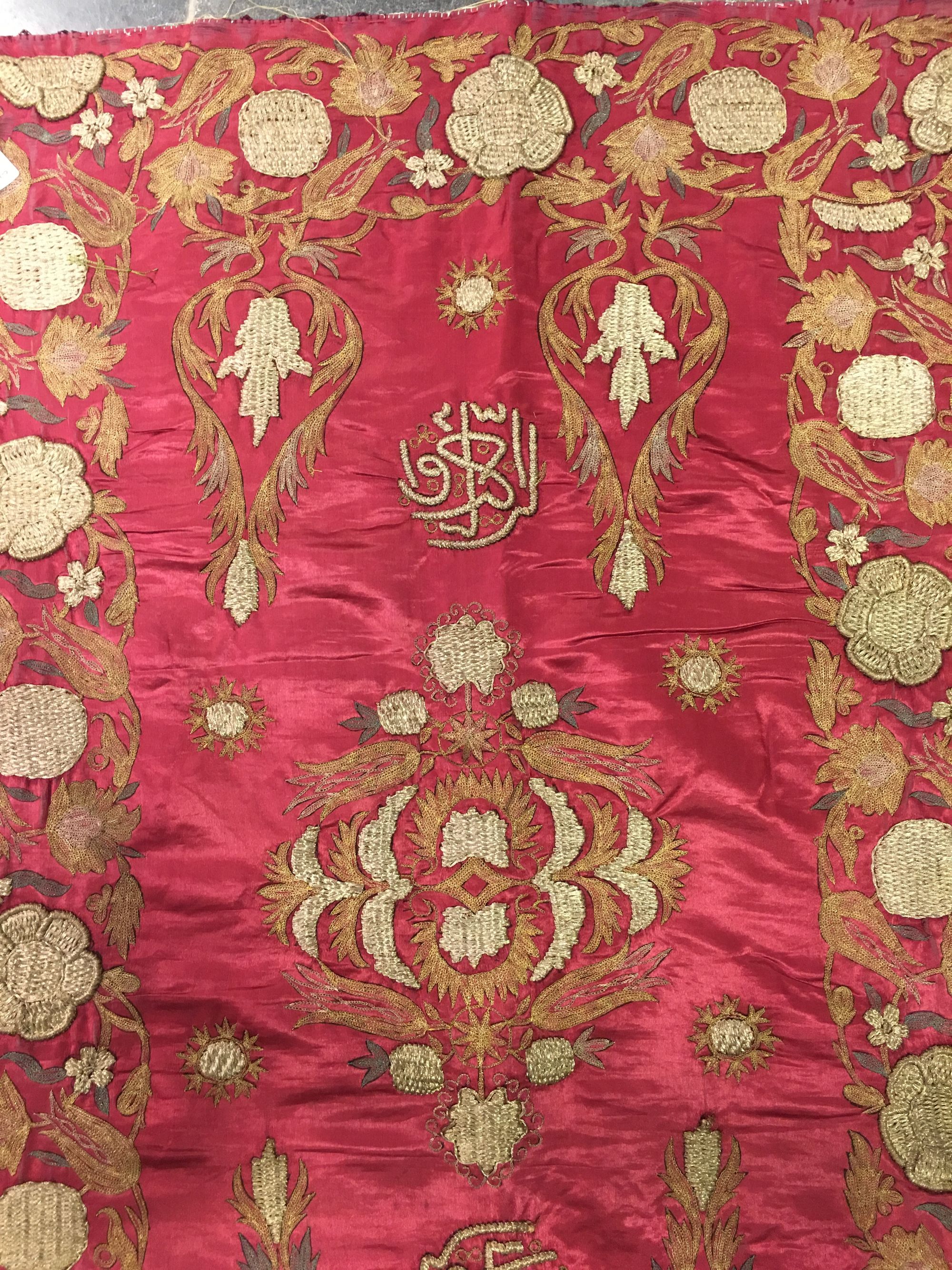 Of narrow rectangular form, embroidered in gilt threads with Arabic calligraphy, large flower heads surrounded by foliage with a border of flowers and foliage.