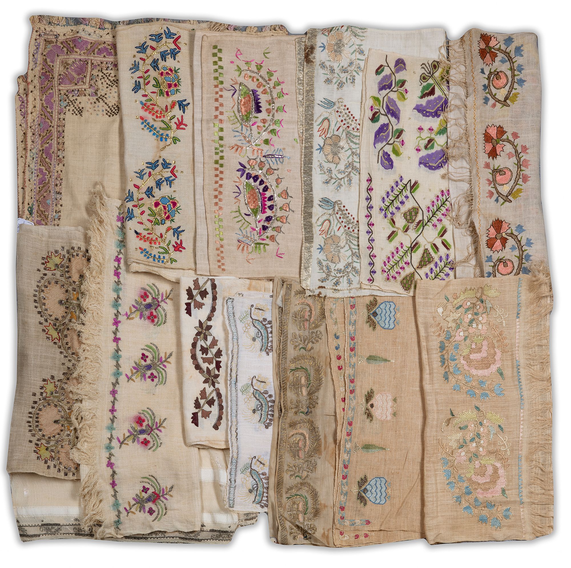 Ottoman brocades embroidered in gilt and silver threads with flower sprays and foliage. Ranging from 50 by 50 cm. to 210 by 42 cm.