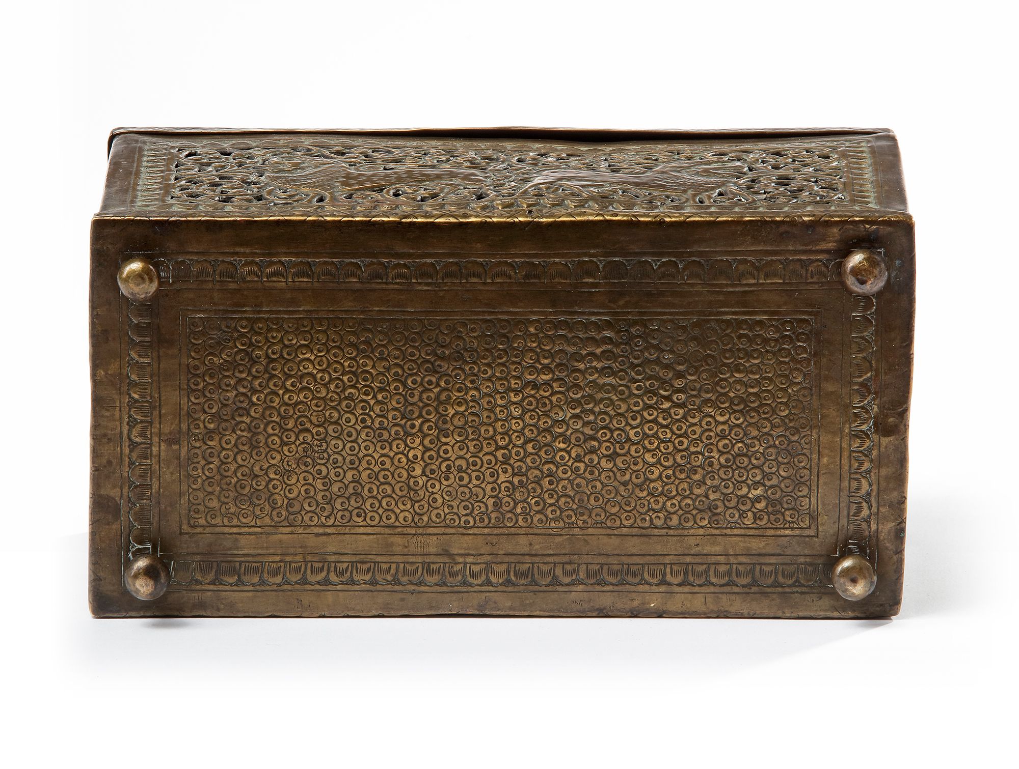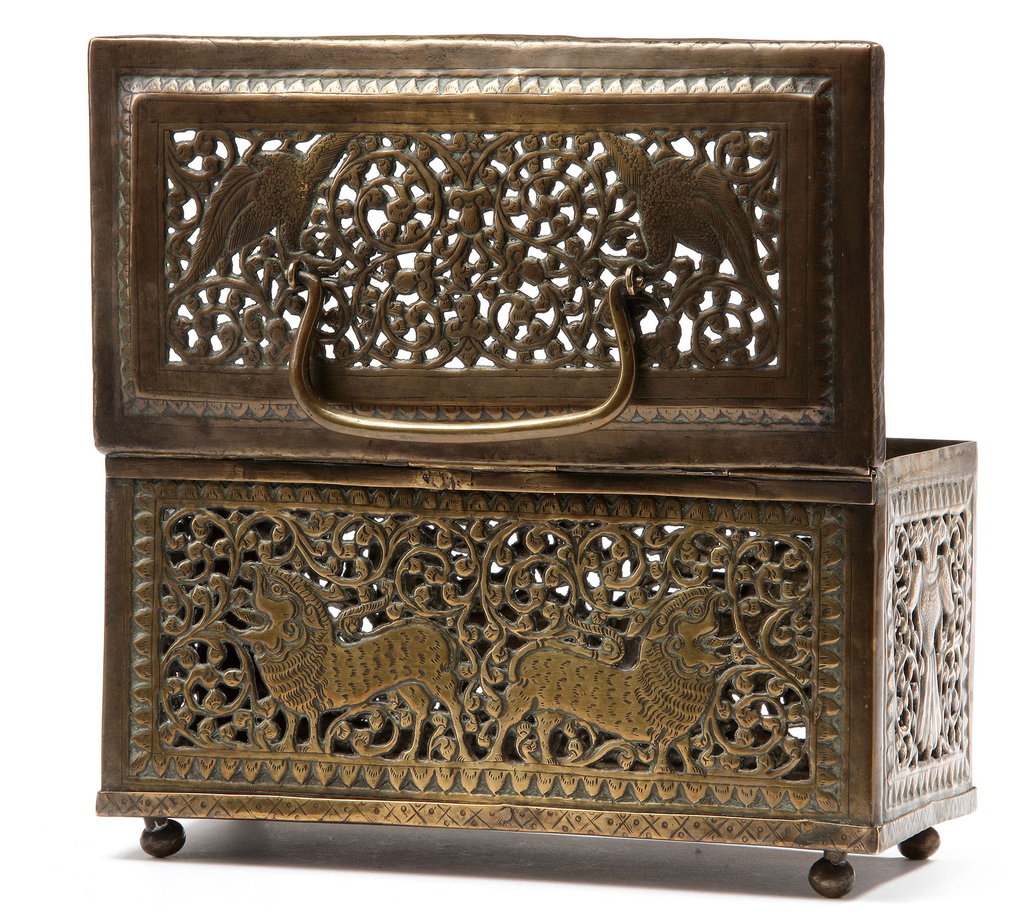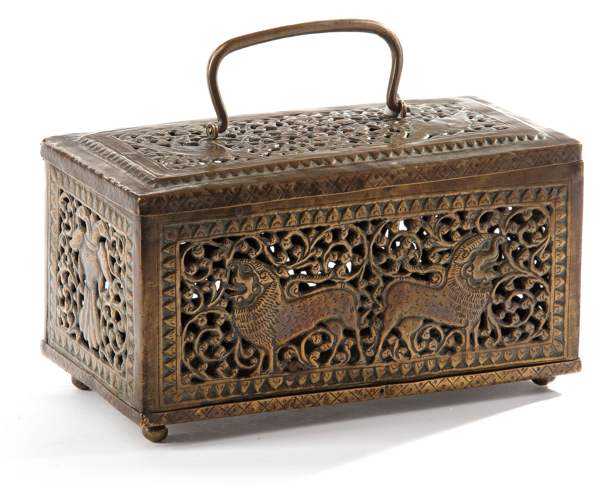 Decorated with animals and scrolling leaf patterns. 11 by 19 by 9.5 cm.