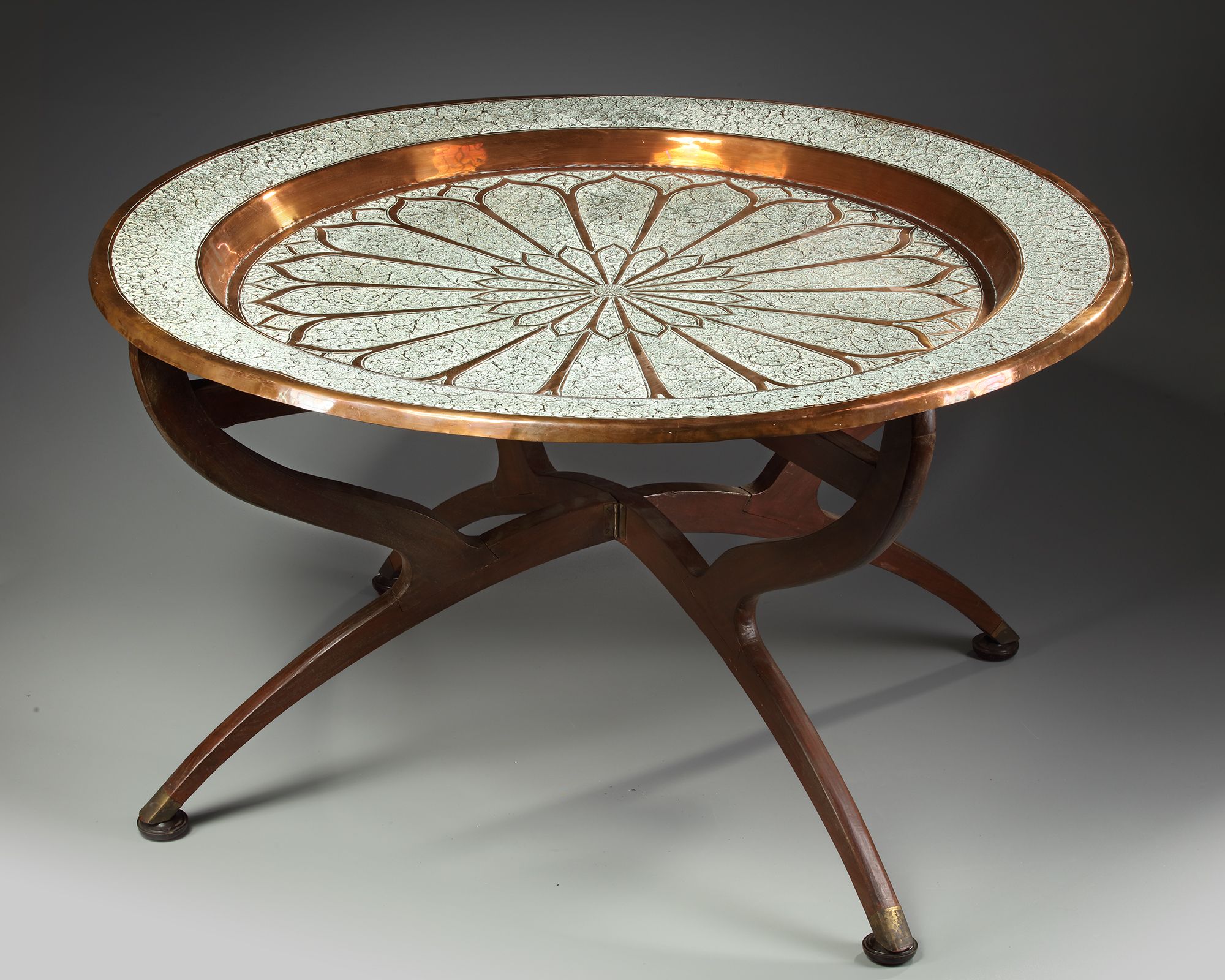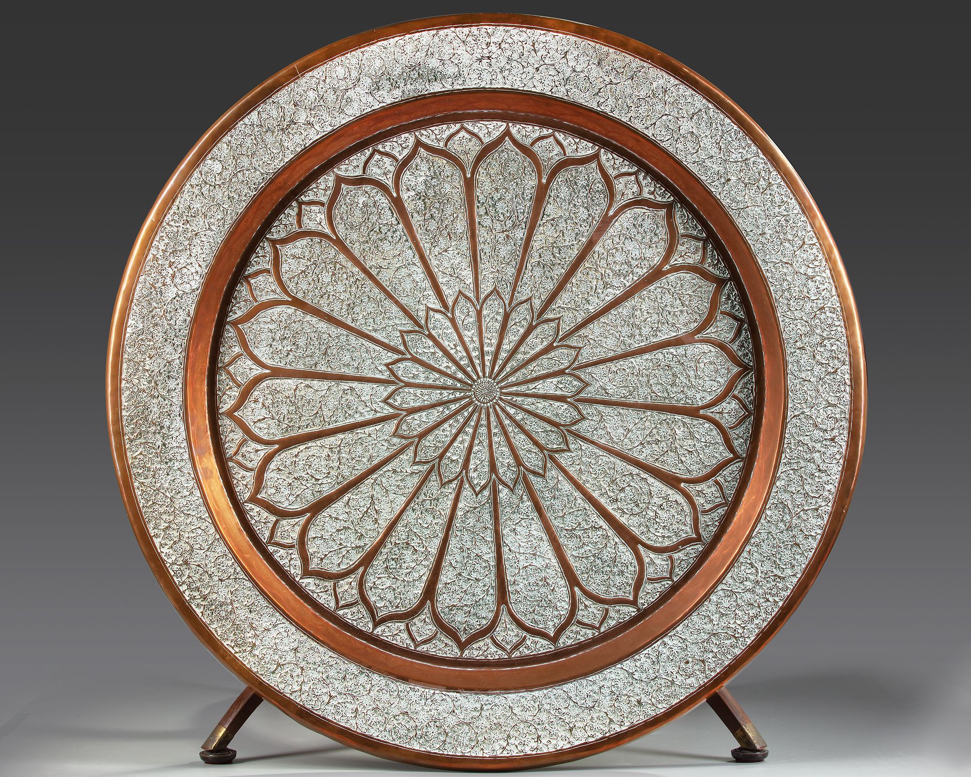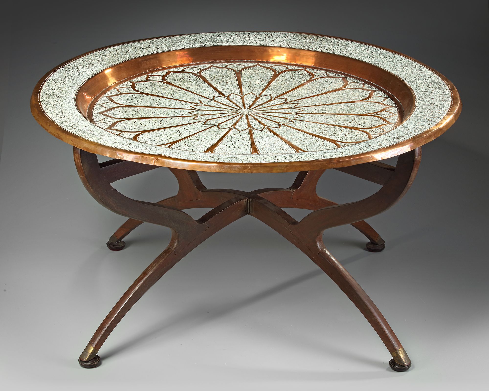 Decorated with white enameled flower patterns, on a foldable wooden stand which are secured by hooks. 50 cm. height, 88 cm. diam.