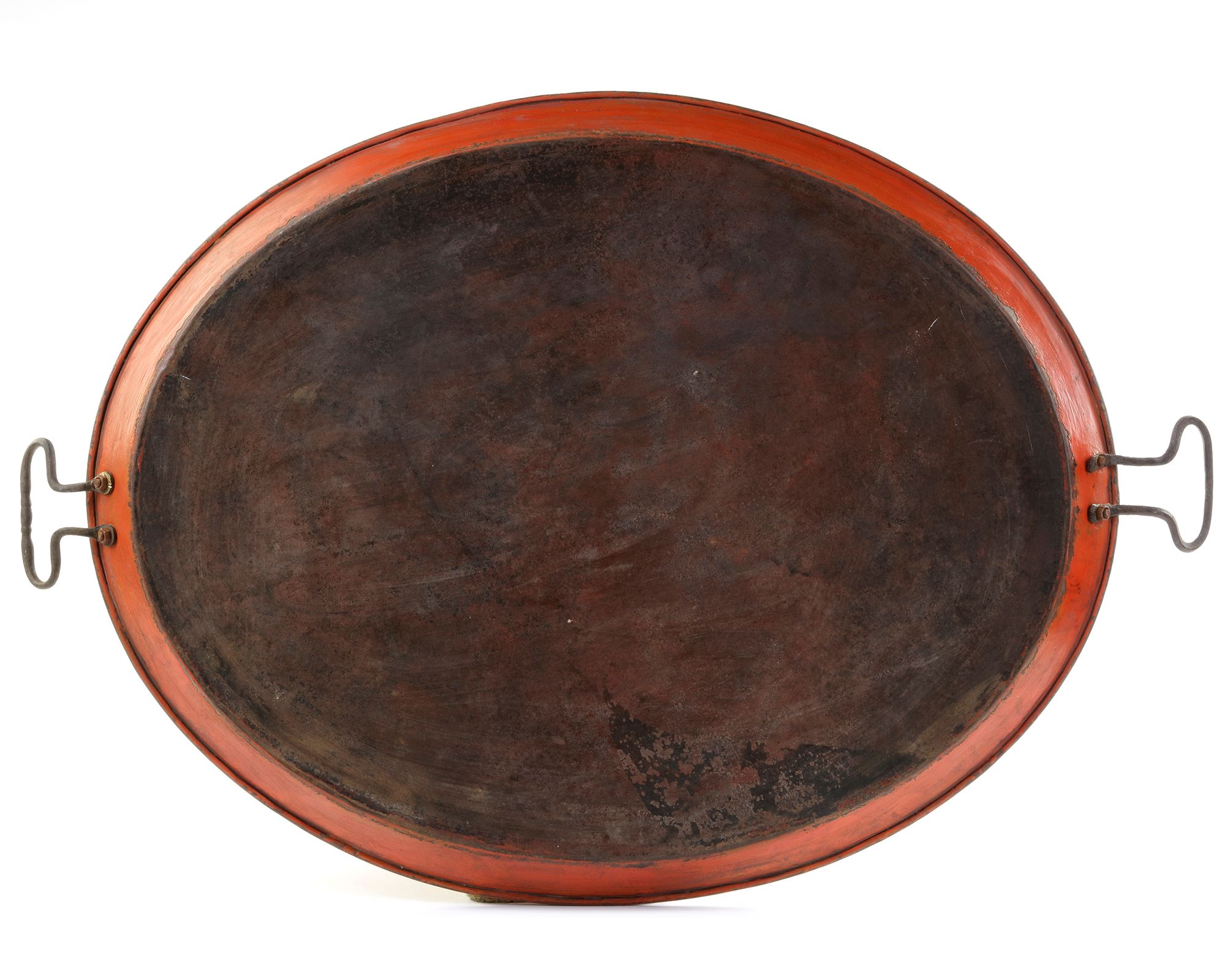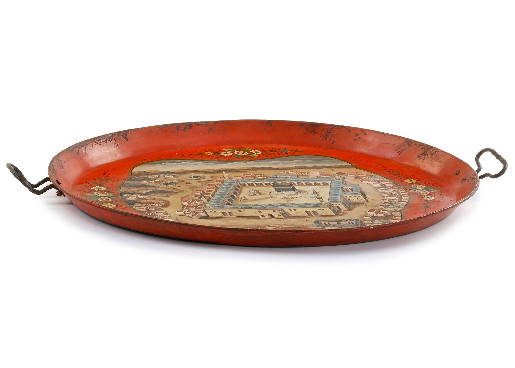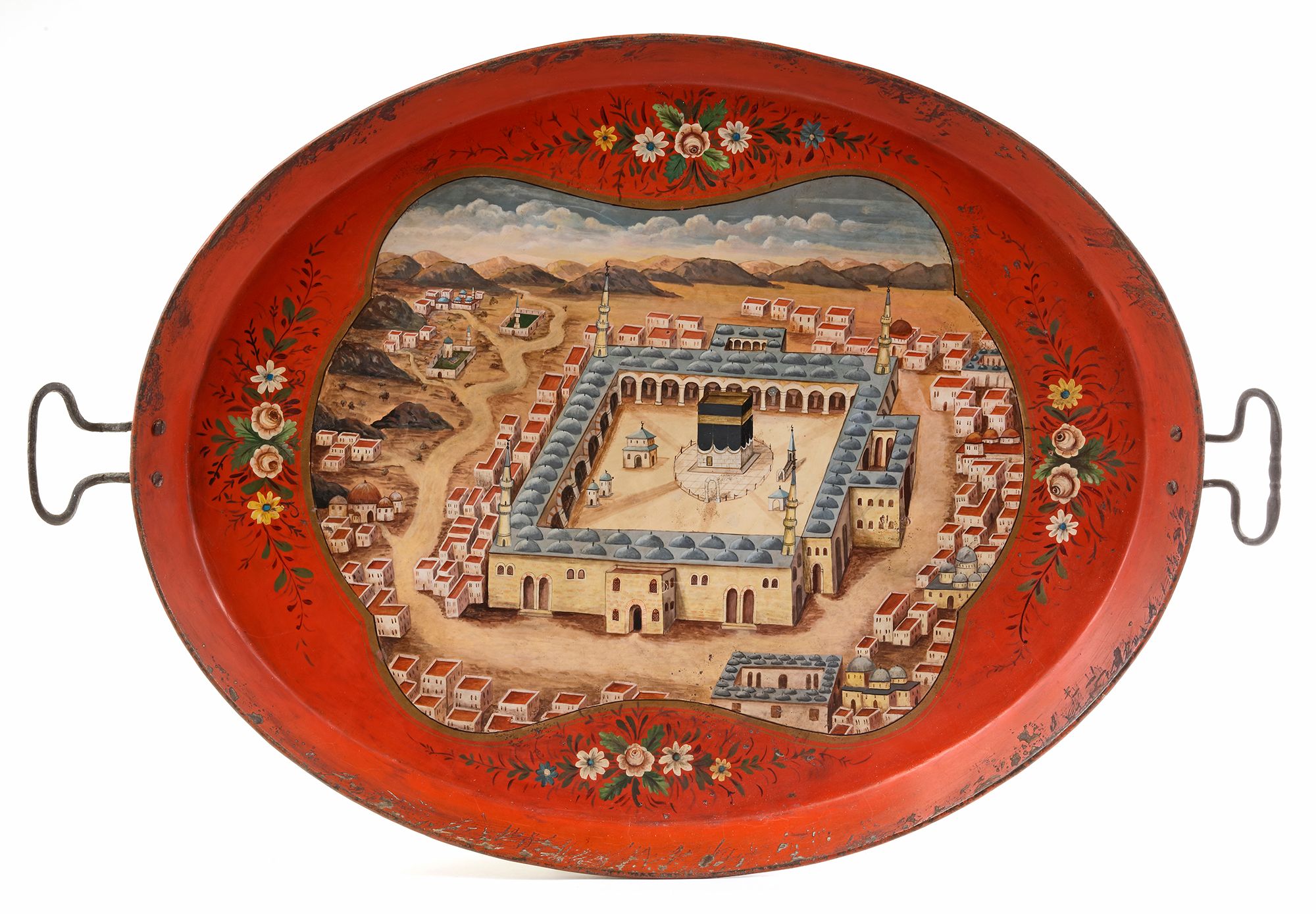 Of oval form with vertical sides and two handles, the centre with a painted depiction of the Kaaba and the Masjid al-Haram in Mecca within a cusped cartouche on a red ground with pink and white floral sprays, the sides with gold painted scrolling floral arabesques, the underside with traces of black paint and a maker's mark. 58 by 46 cm.