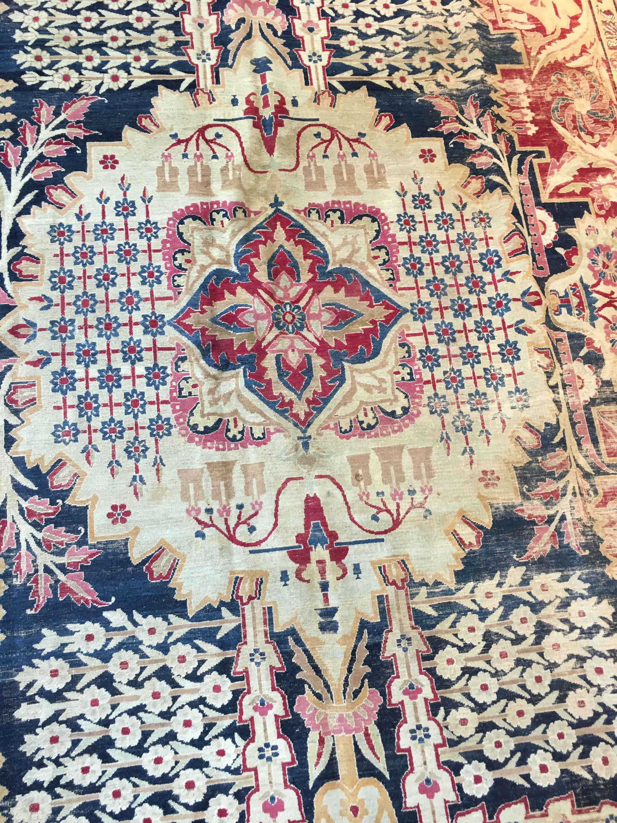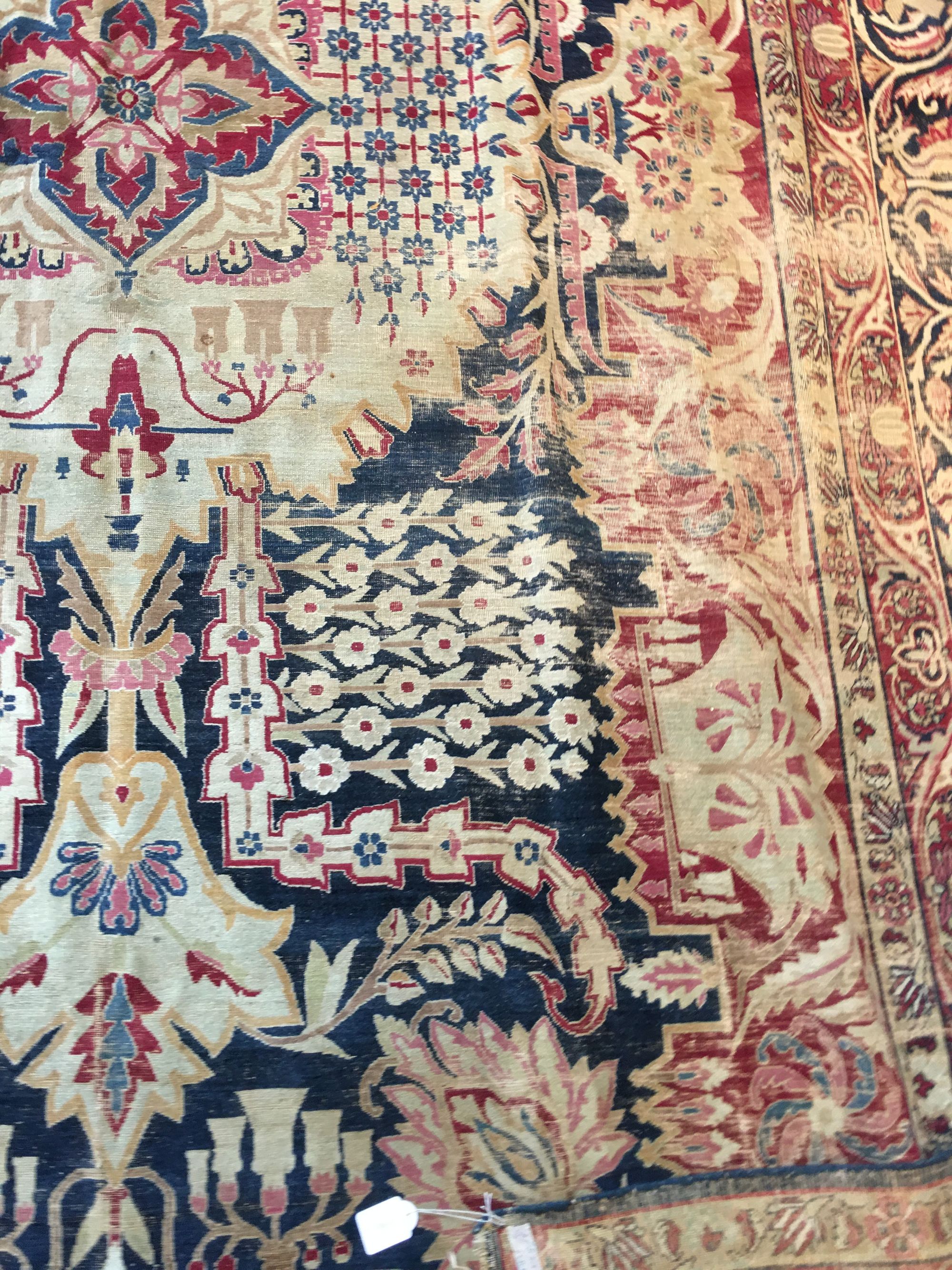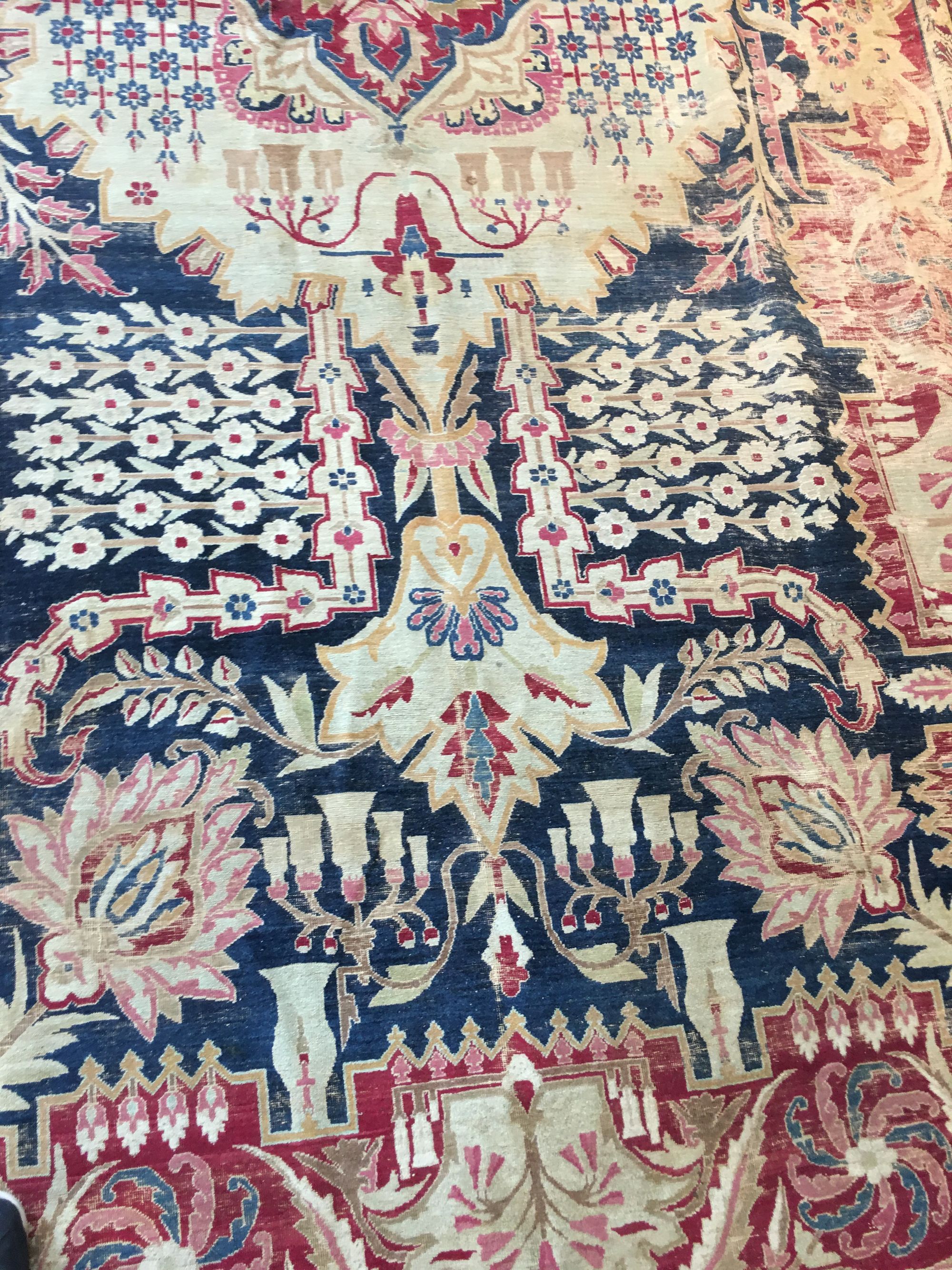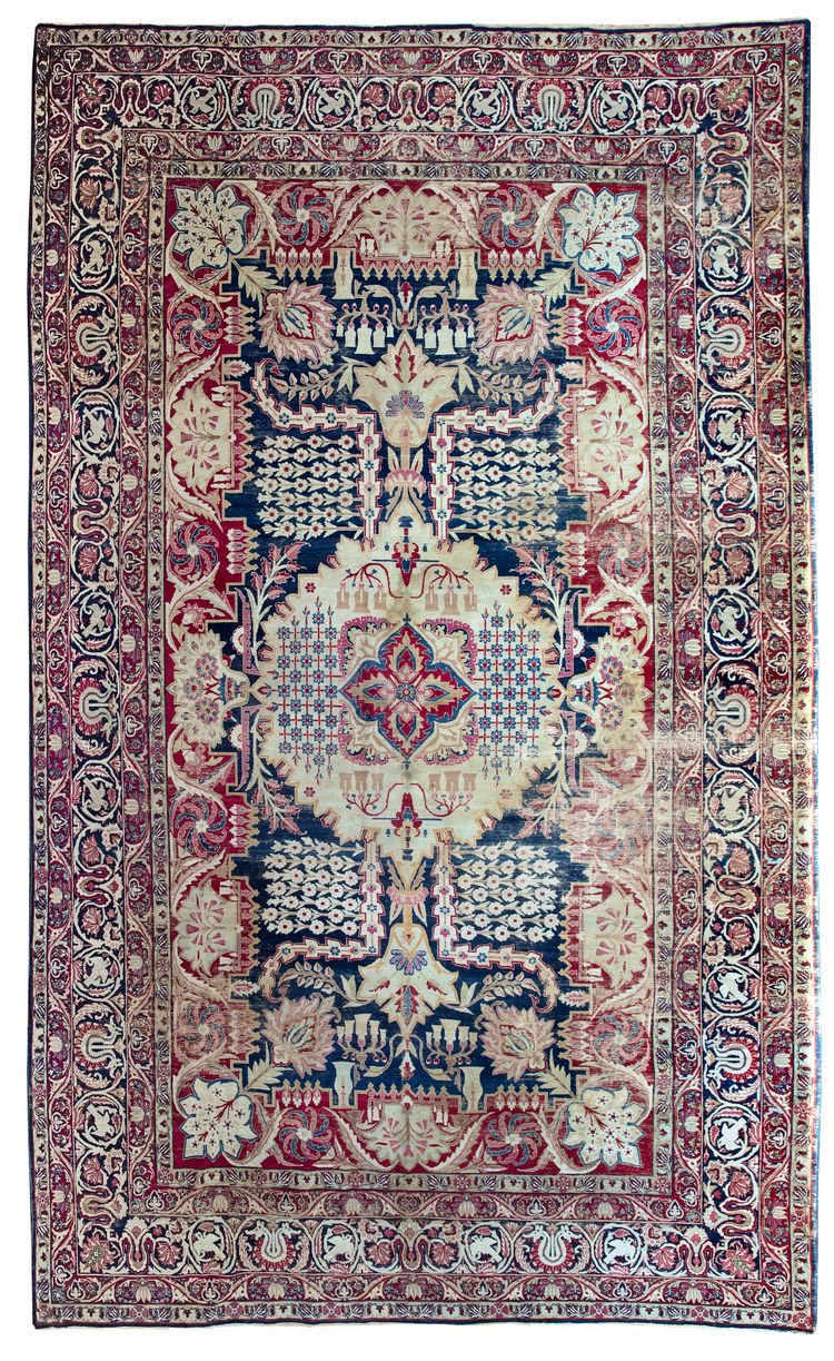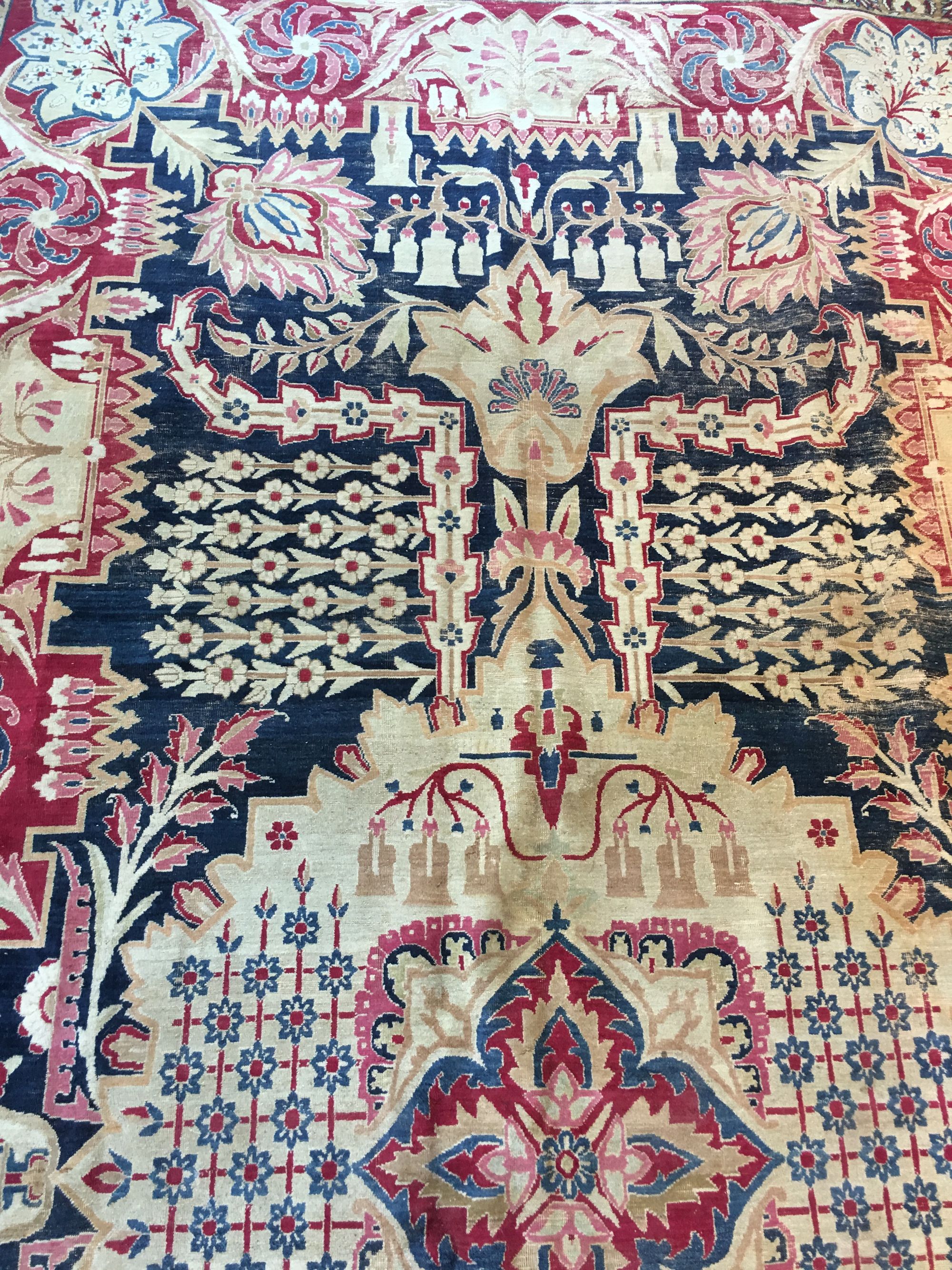 A large raver kirman wool rug, finely woven with large floral desgins, lotus and chrysanthemum flower heads, groups of floral sprays and foliage. Kerman is a city and as well as a province in south central Iran. With its 60,000 inhabitants and surrounding villages, it is one of the major rug producing areas of Iran. Unlike other parts of Persia, Kerman existed with relatively no interference from invasions, mostly due to its provincial isolation. As a result, the arts in Kerman flourished. Antique Kerman rugs are easily recognizable with curvilinear graceful floral designs in a brilliant assortment of colors. 535 by 315 cm.