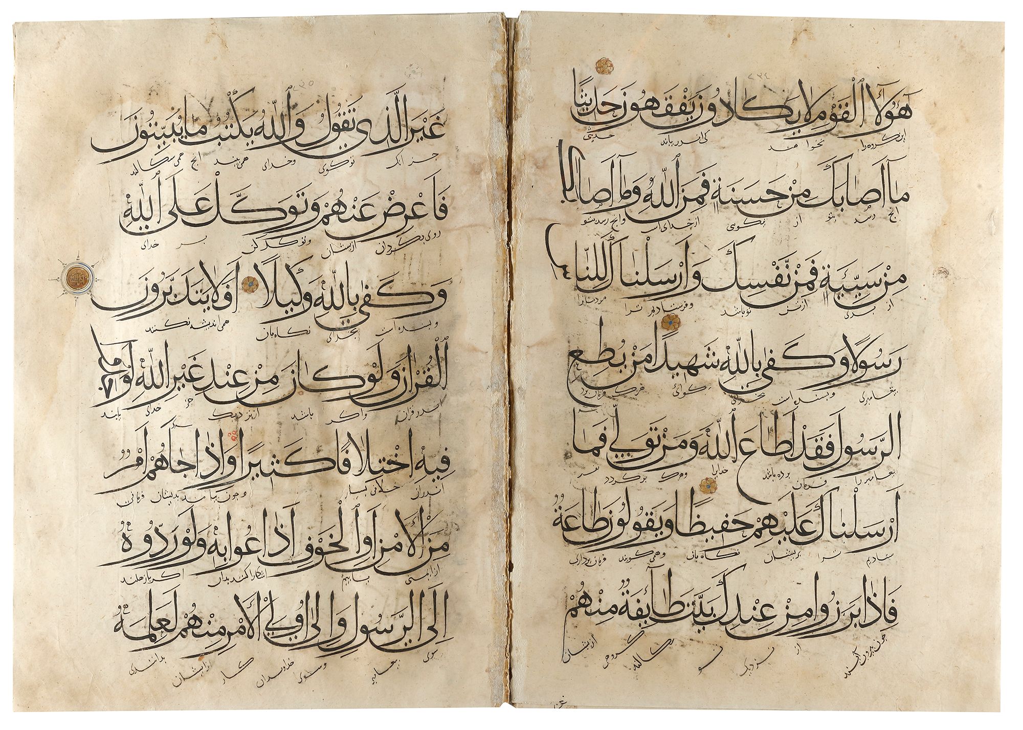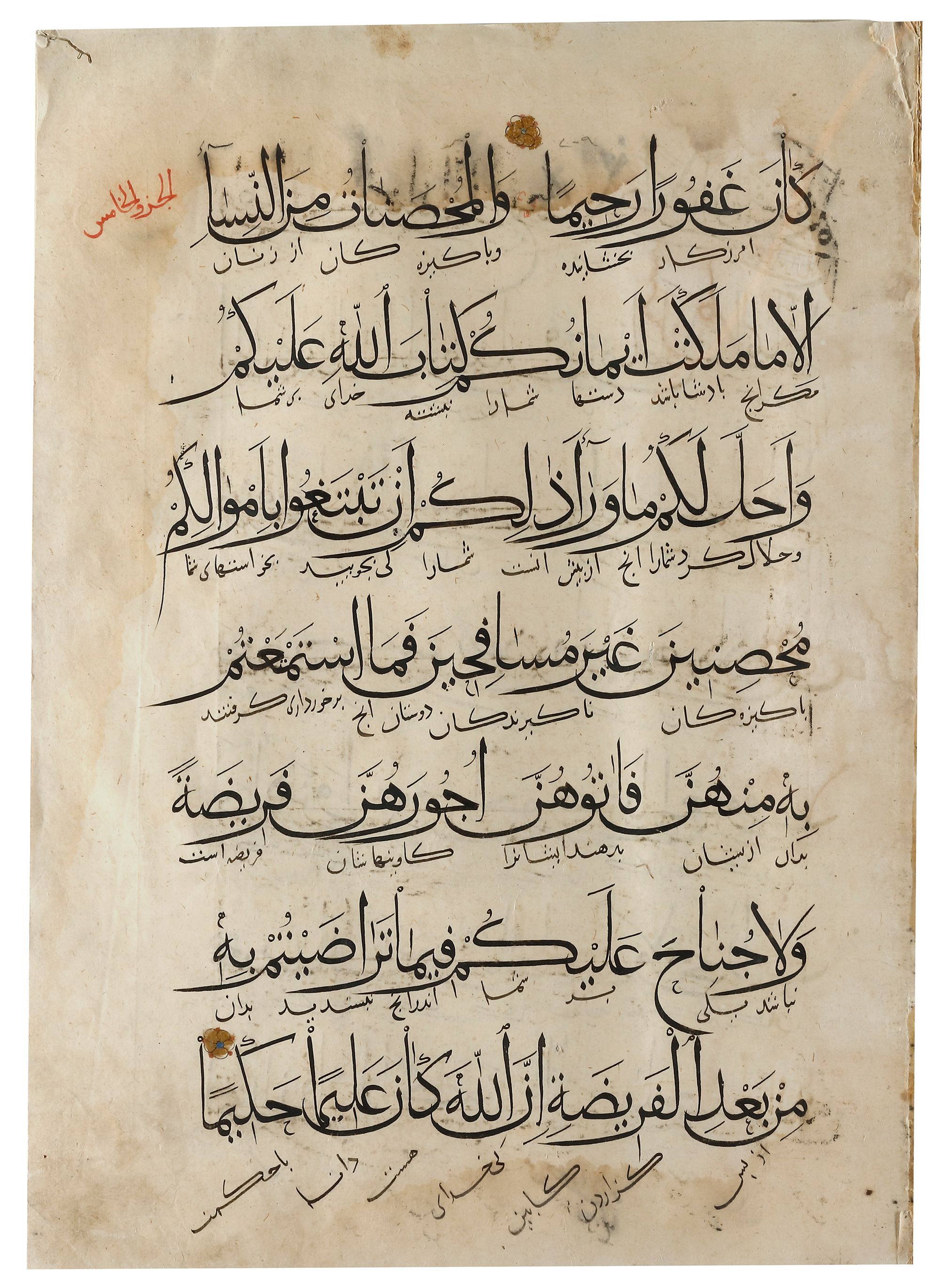 An Arabic manuscript on paper, 28 leaves with 7 lines to each page, written in black Muhaqqaq script. Comprising the 5th juz with the beginning of 6th Juz’, with gold rosette verse markers pointed by red dots. With illuminated marginal medallions indicating the khums ‘5th’ of the verse. With Persian translation. Quran 4 surah Al-Nisa v.23-v.150 32 by 45 cm.