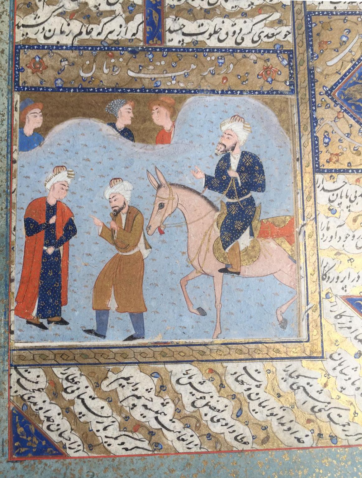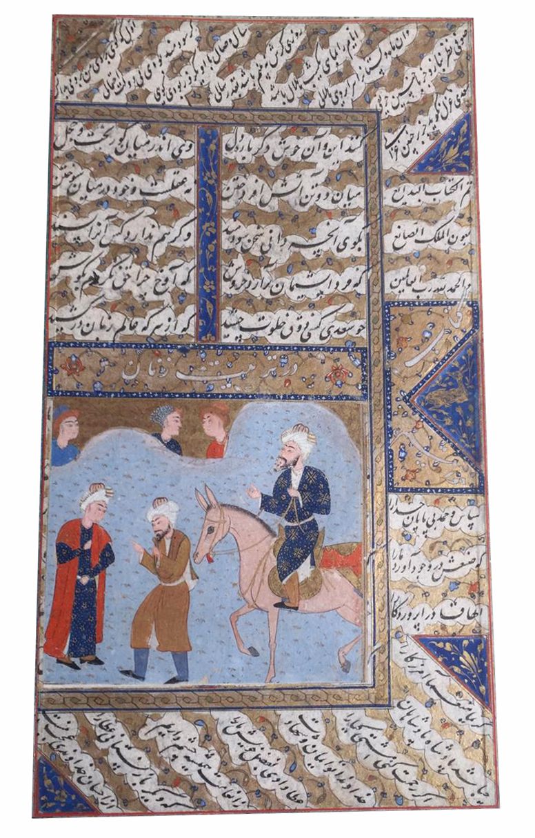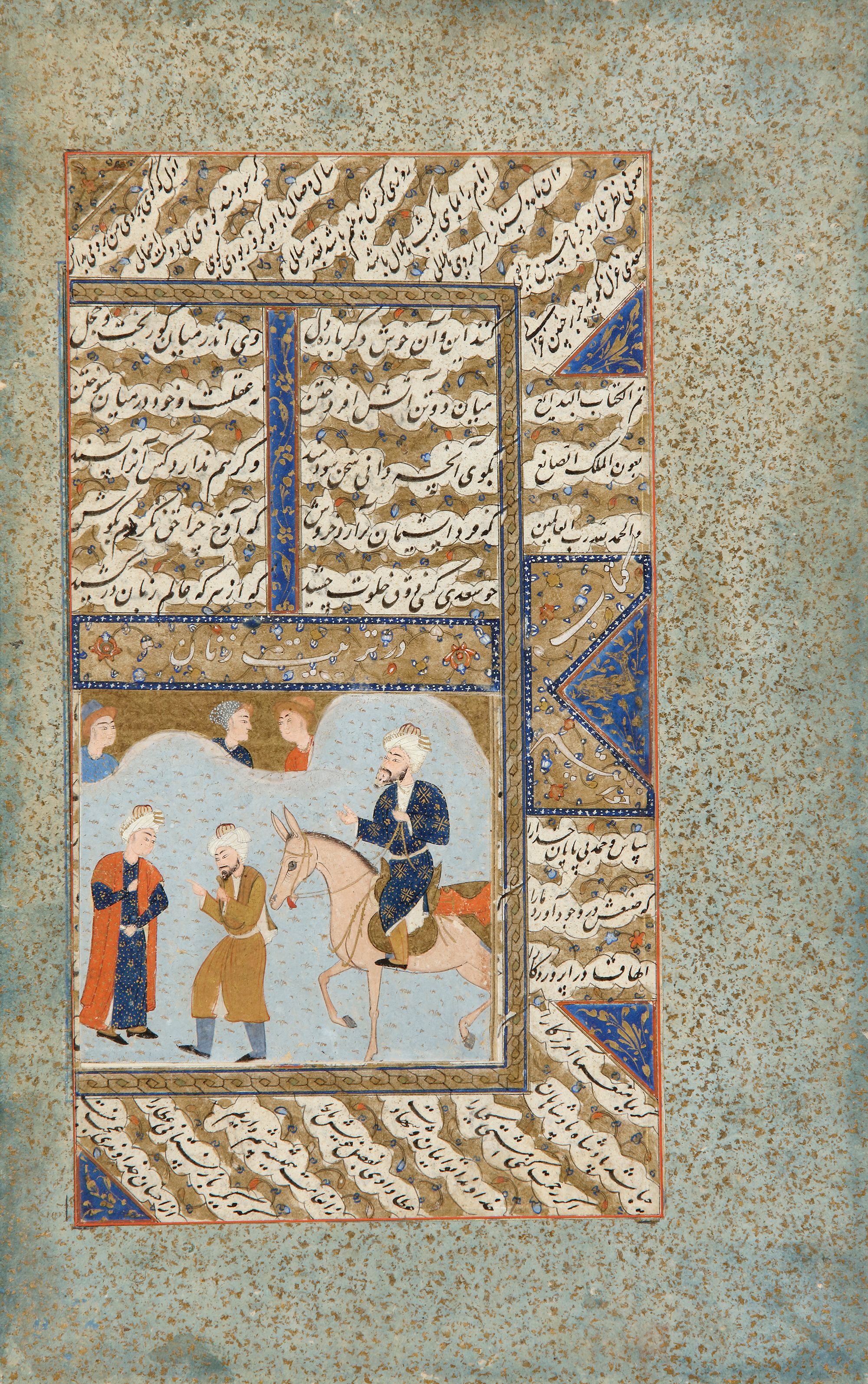 Persian manuscript on paper, gouache heightened with gold on paper by Sa’adi (1210-1292 AD), written horizontally and diagonally in black nastaliq script, reserved in clouds on a gold ground. Depicting Muhyiddin Ibn Arabi (d. 1240) with his students. Abu-Muhammad Muslih al-Din bin Abdallah Shirazi, better known by his pen-name Saadi, was a major Persian poet and prose writer of the medieval period. He is recognized for the quality of his writings and for the depth of his social and moral thoughts. Saadi is widely recognized as one of the greatest poets of the classical literary tradition, earning him the nickname ‘Master of Speech’ among Persian scholars. 16 by 25.5 cm.