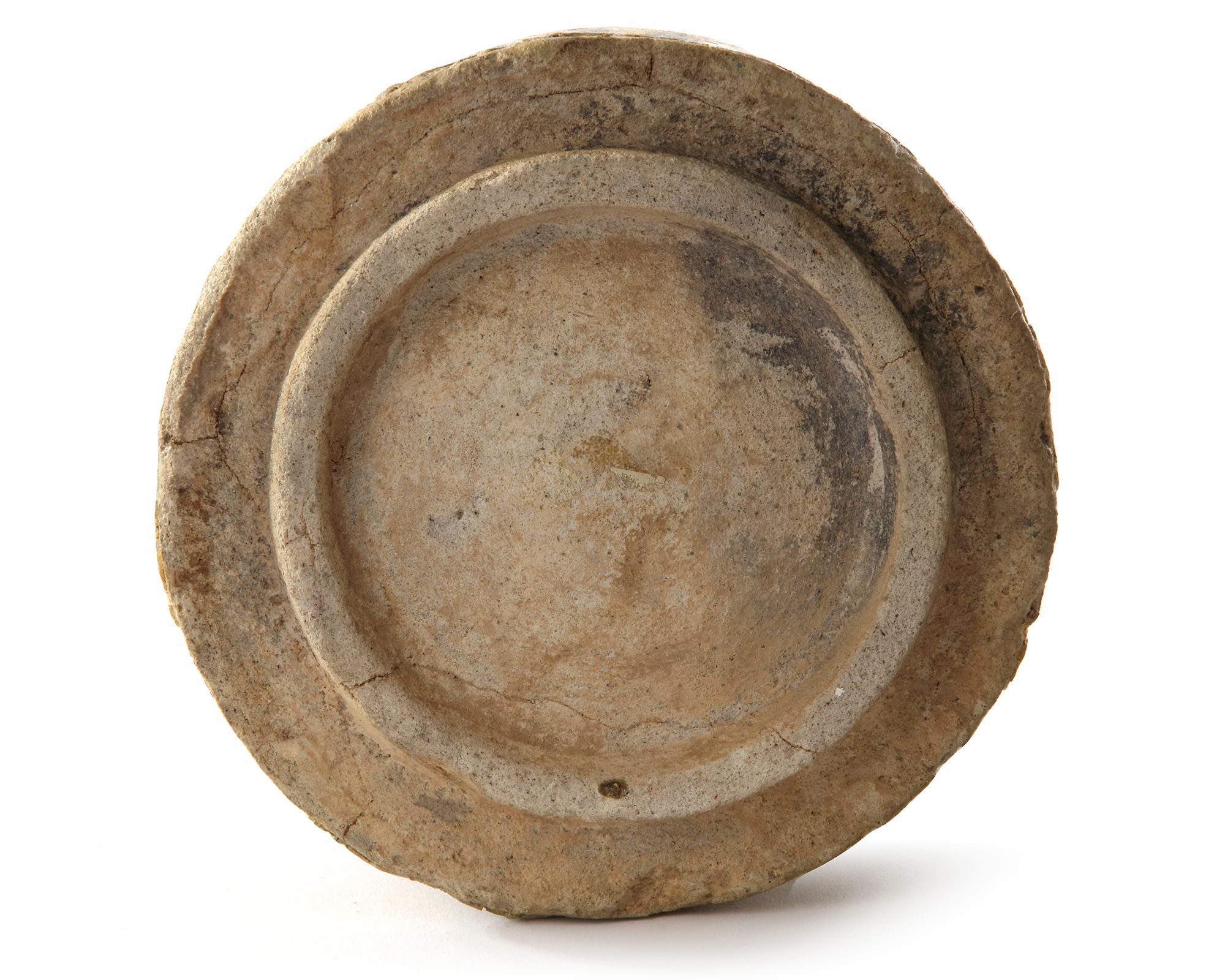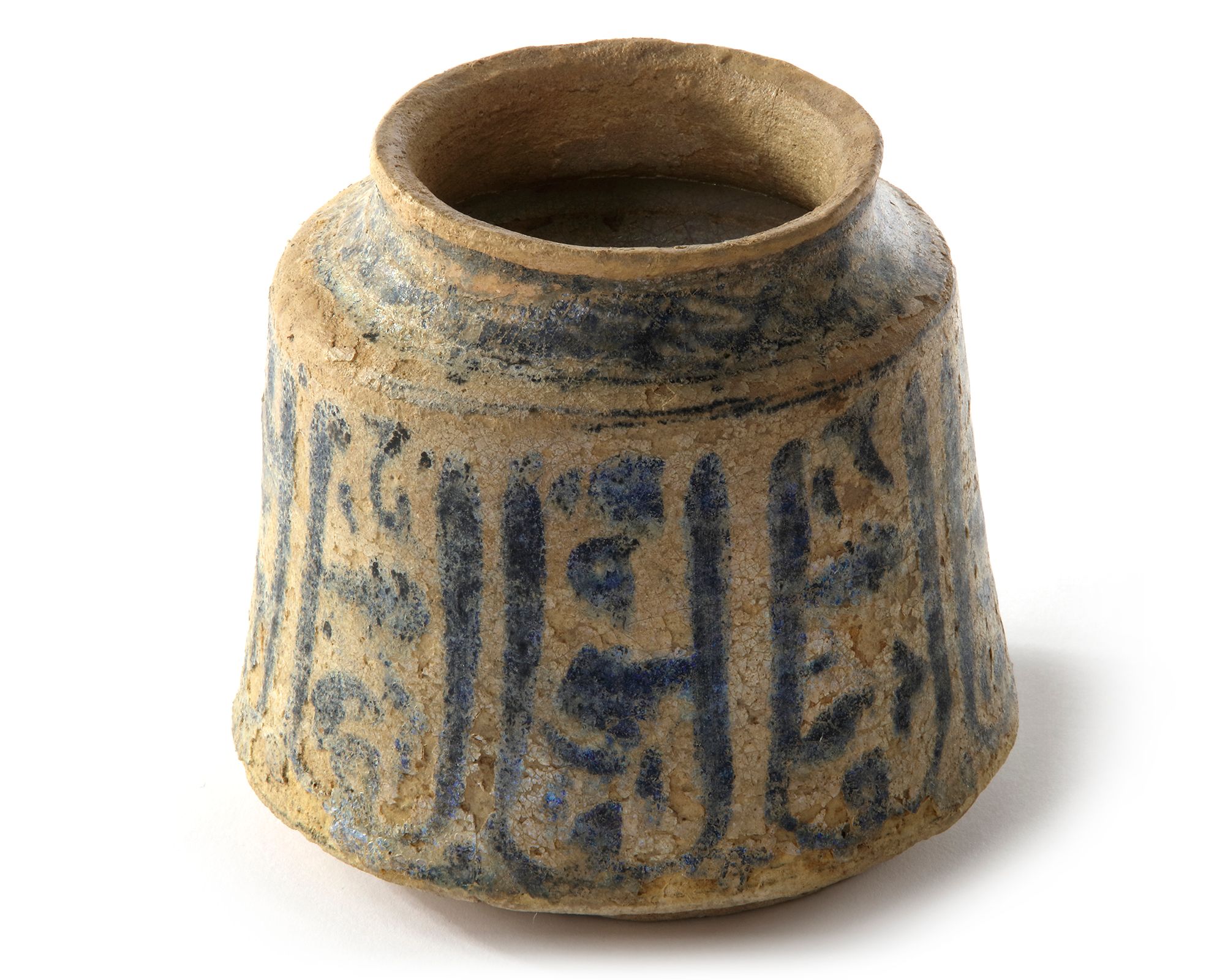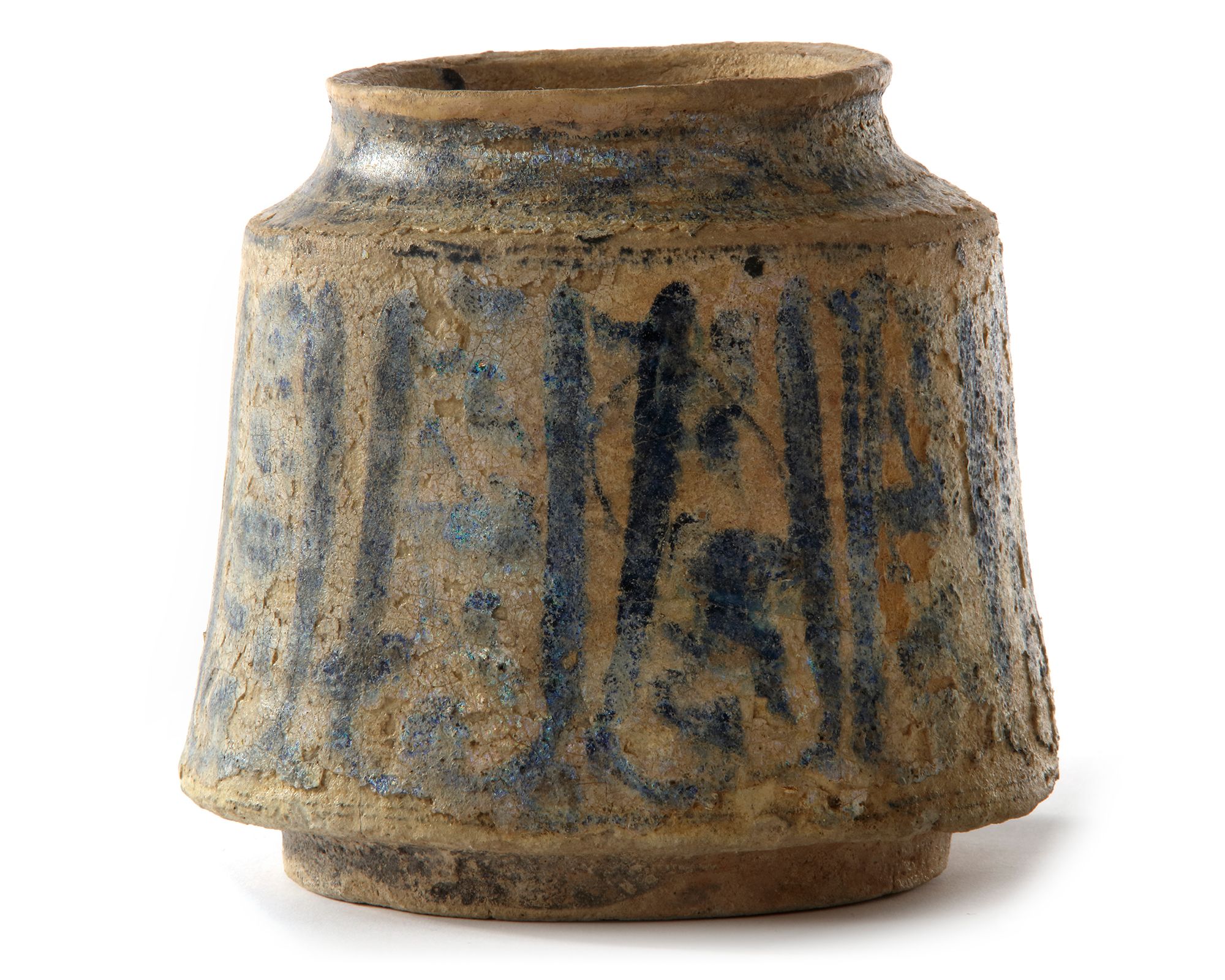 A small albarello of unusual shape, raised on a disc-shaped foot with slightly waisted walls and straight neck. A long yet illegible blue inscription runs along the entire length of the body creating a pleasing decorative effect, heightened by the choice of contrasting colors. 11.5 cm. diam. 10 cm. height