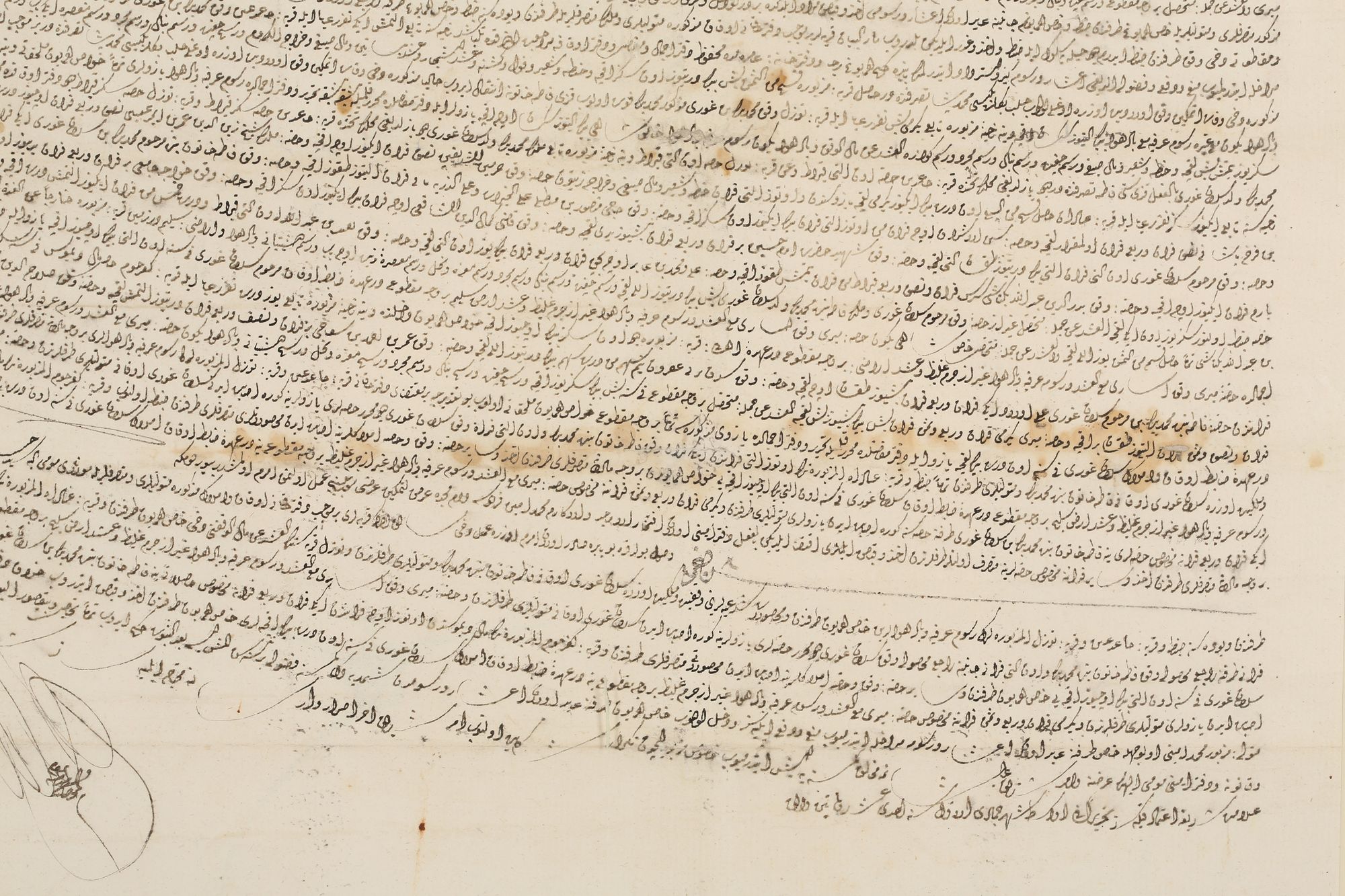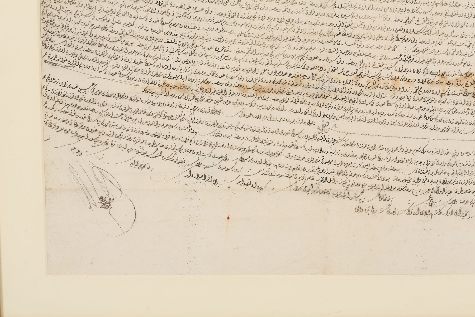 CATALOGUE NOTE The document relates to the transition of the rights over the waqf institution in the city of Antep, where the control of the institution was in the hands of Fatima Khatun, the daughter of Muhammad Beg bin Ghauri, and now being divided between the successors of Sultan Ghauri. 55.5 by 47 cm. excluding the frame, 72 by 62.5 cm. including the frame.