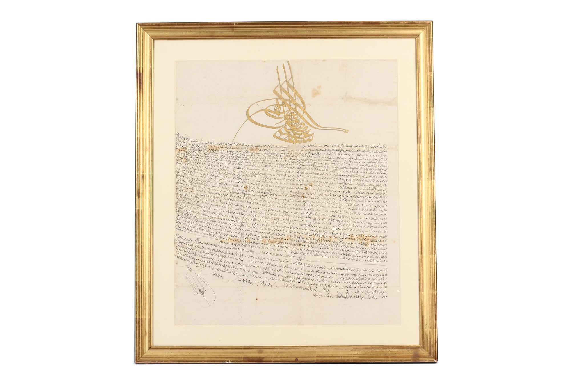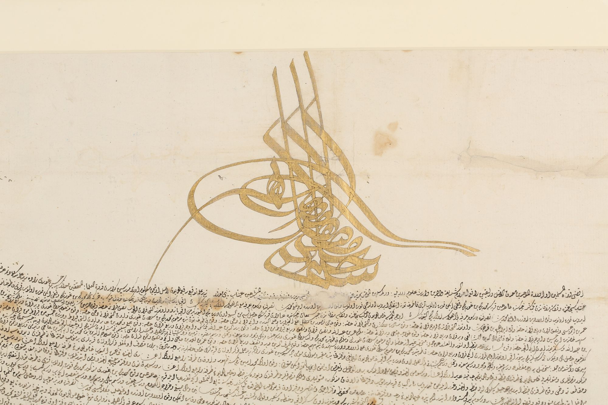A large firman with the tughra of sultan Selim II (reg. 1203-1222 AH/1789-1807 AD) relating to the riots of various parties in a Waqf endowment. Ottoman, Constantinople, dated 1211 AH/1796 AD, or 1221 AH/1806 AD Ottoman Turkish manuscript on paper, 37 lines to the page written in small divani script in black ink, a large tughra in gold above text, tears, some staining affecting small areas of text, creased, in mount