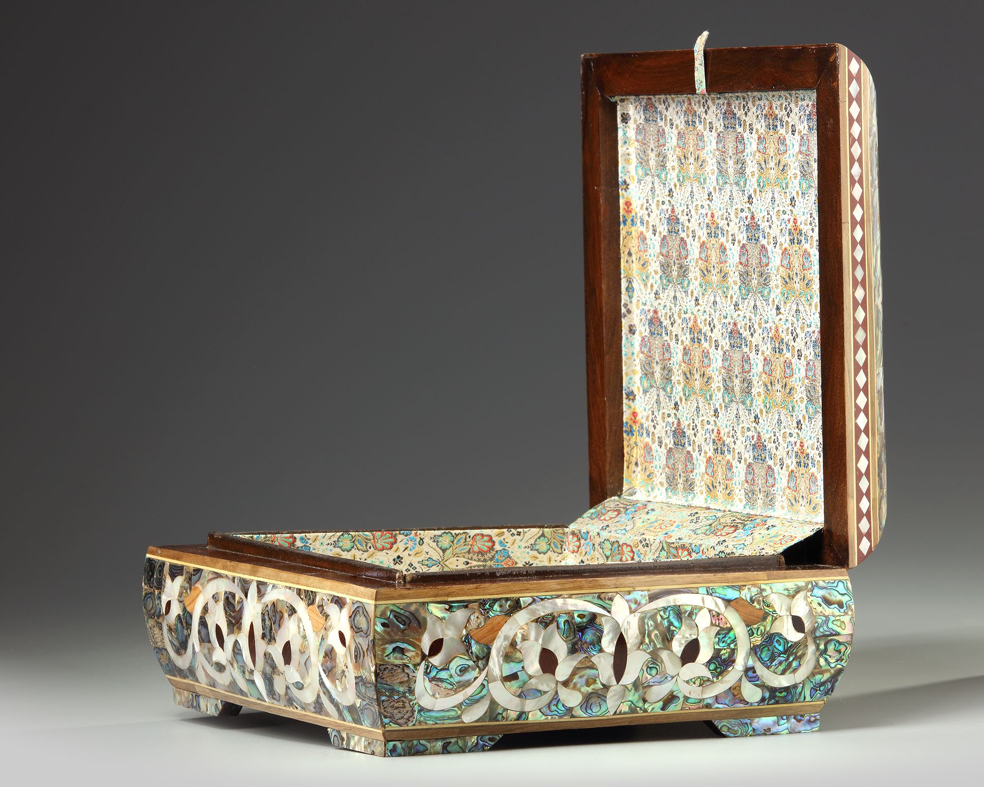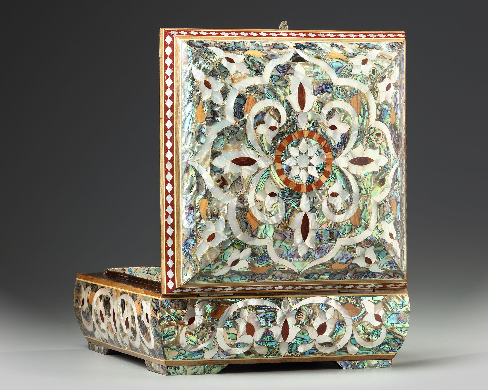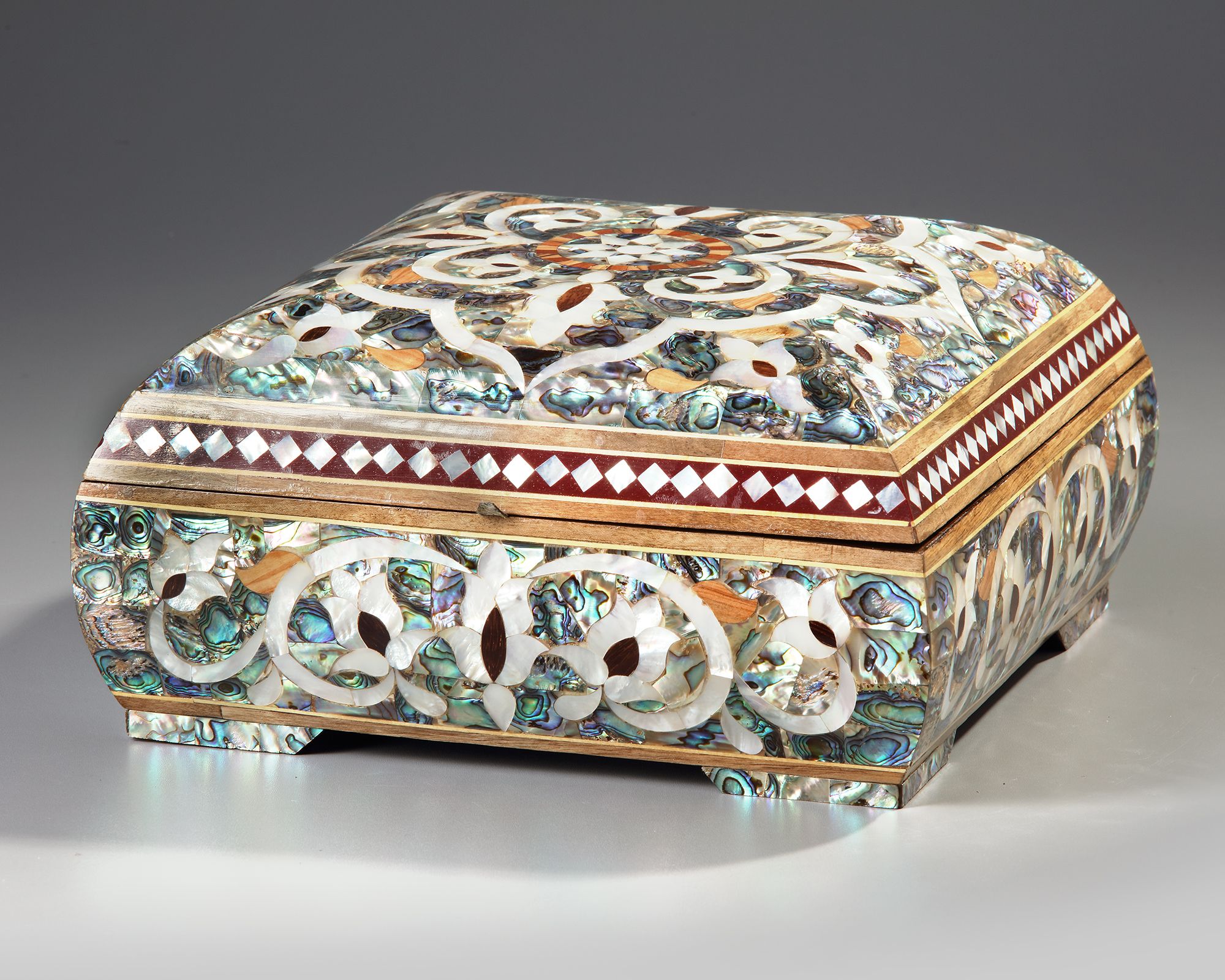 A Syrian wooden jewellery chest with mother-of-pearl inlaid flower scrolls surrounded by iridescent mother-of-pearl inlay.