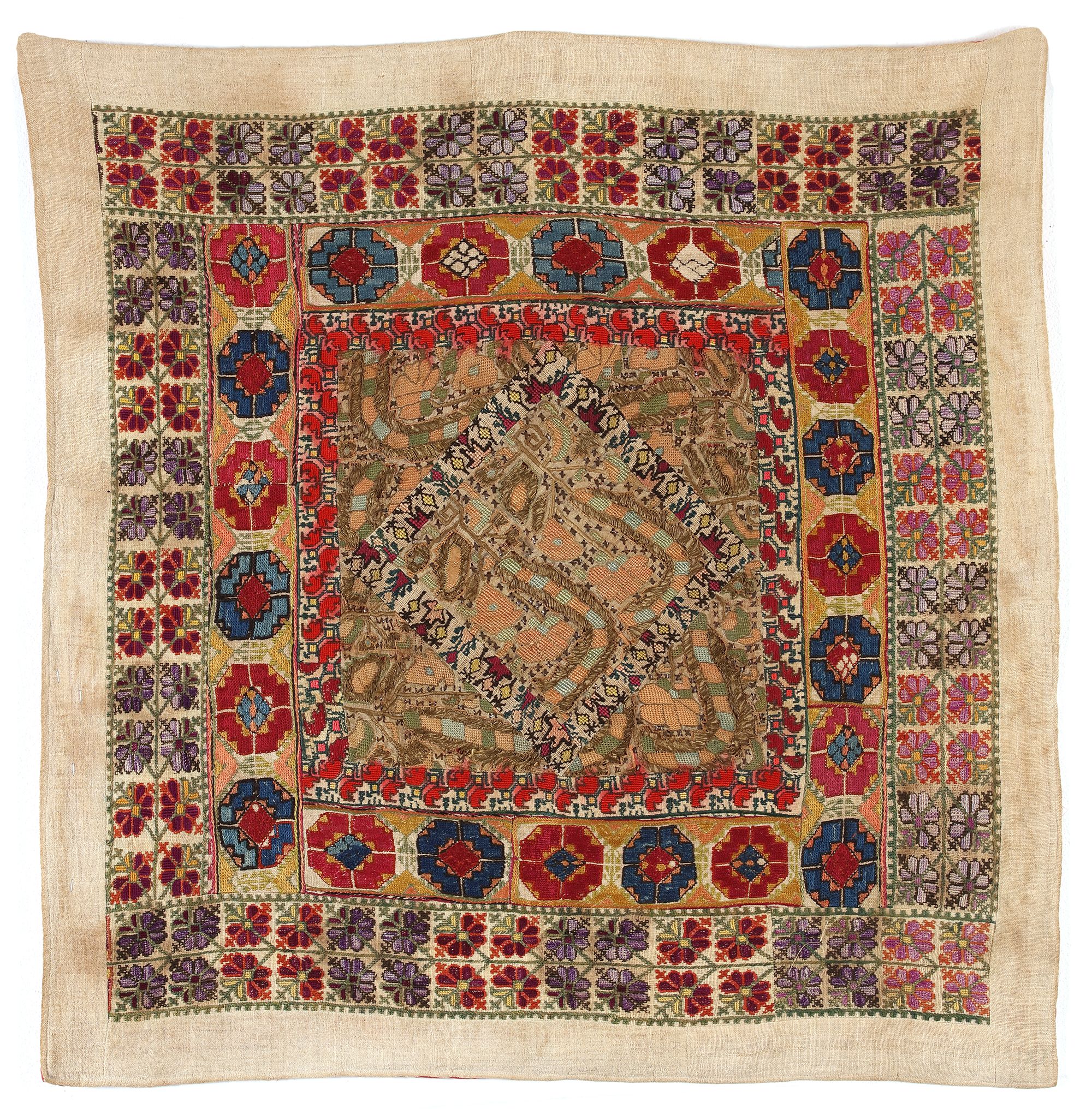 Of a square form and embroidered in threads with geometric designs and flower heads. 77 by 77 cm.