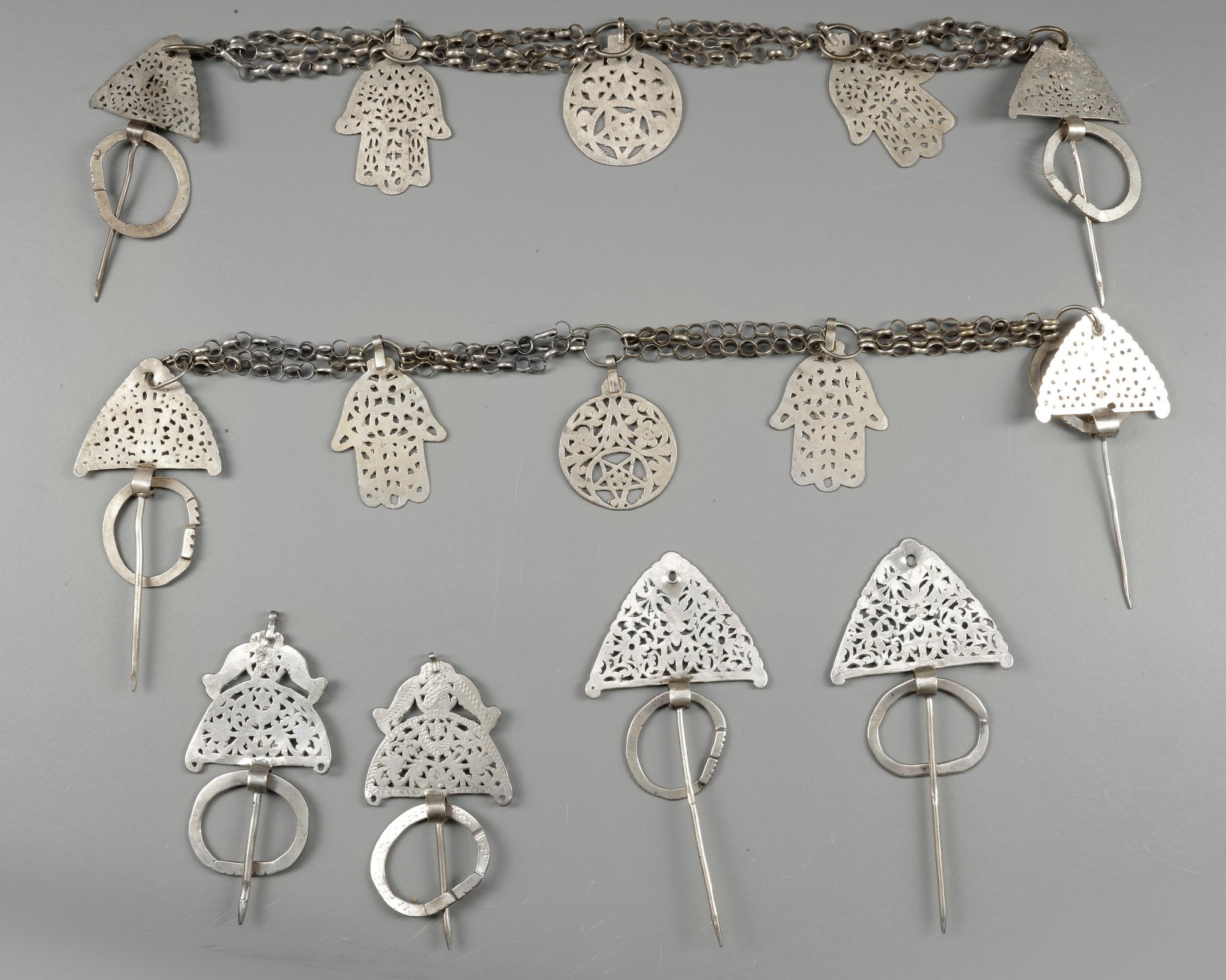 Fibulae were commonly worn by women as an everyday adornment whilst going about daily work as well as on special occasions. It is essentially a cloak fastener, comprising an ornate metal triangular, round or oval shape with detailed etchings in filigree or enamel, and a pin which serves to fasten two layers of material together. They were usually worn as a pair. These type of Fibulae are worn by Berbers, the indigenous ethnic group of North Africa.