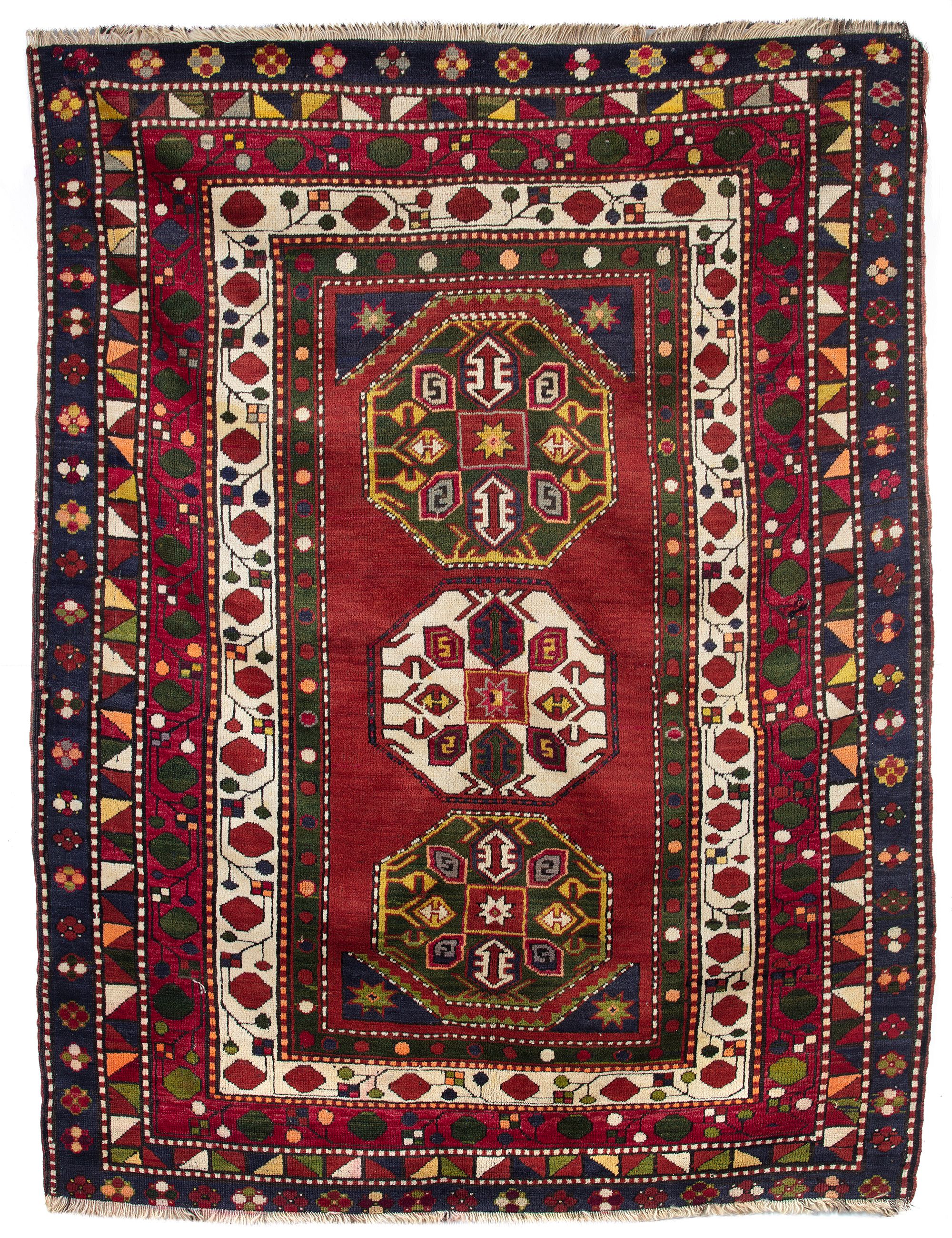 A Caucasian rug having a red ground with three hexagonal medallions containing geometric devices, surrounded by four borders having geometric devices, flower heads and vines.