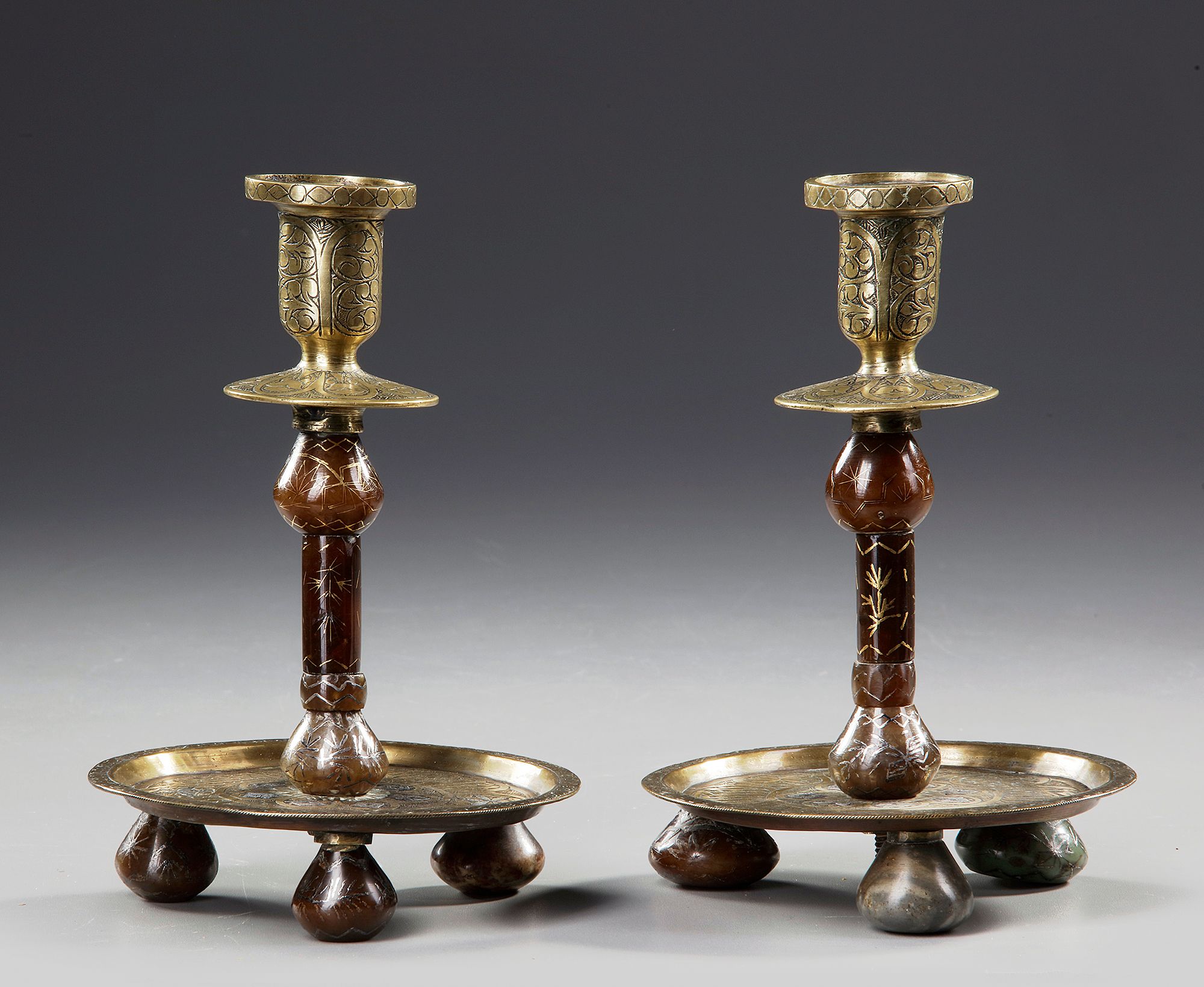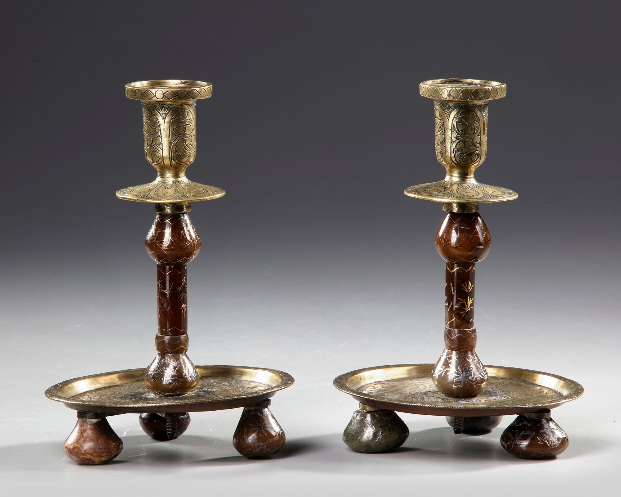 Comprising a pair of brass candlesticks, each of typical shape, with a circular silver-inlaid base with everted rim resting on bulbous engraved hard stone feet, the decoration consisting of floral roundels interspersed with thuluth calligraphic cartouches, the central stem made of brown agate segments inlaid in gold and enhanced with vegetal and floral motifs, the brass top decorated with Mamluk-inspired Y-shaped motifs, vegetal scrolls and stylized lotus buds. Each 18.5 cm.