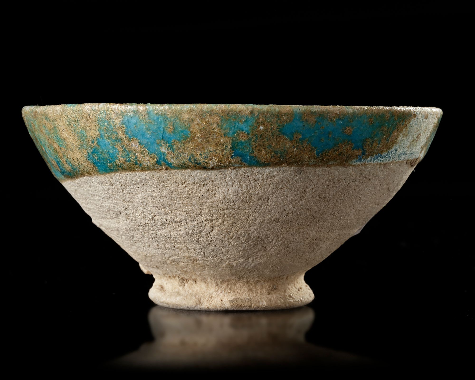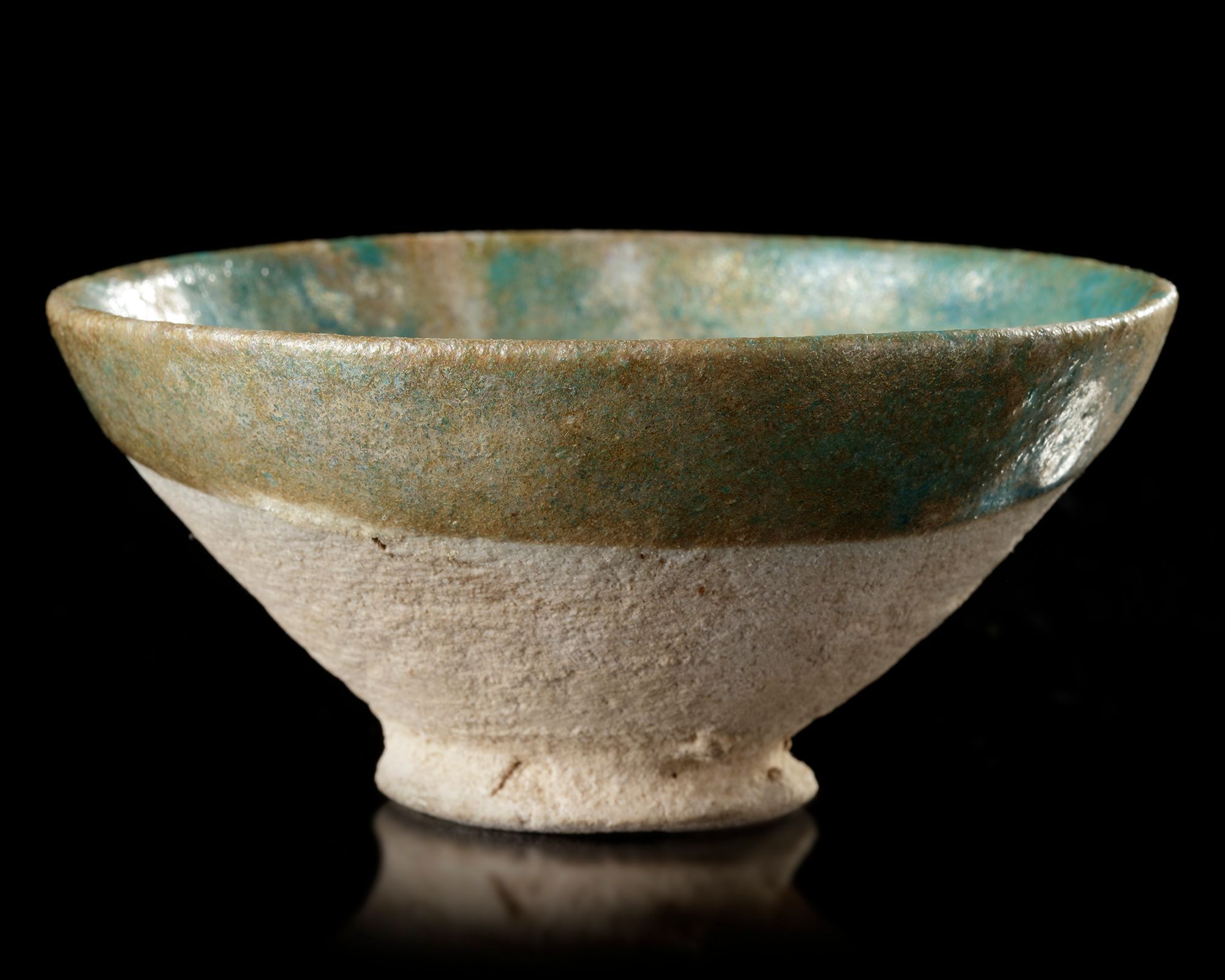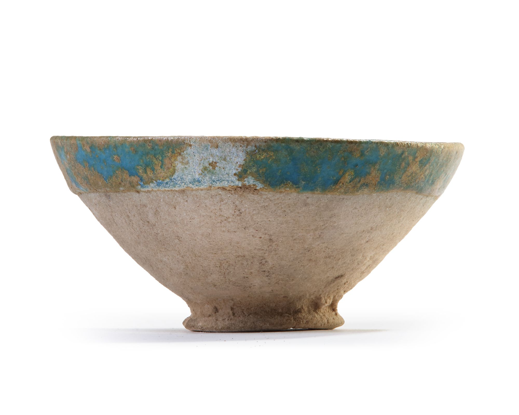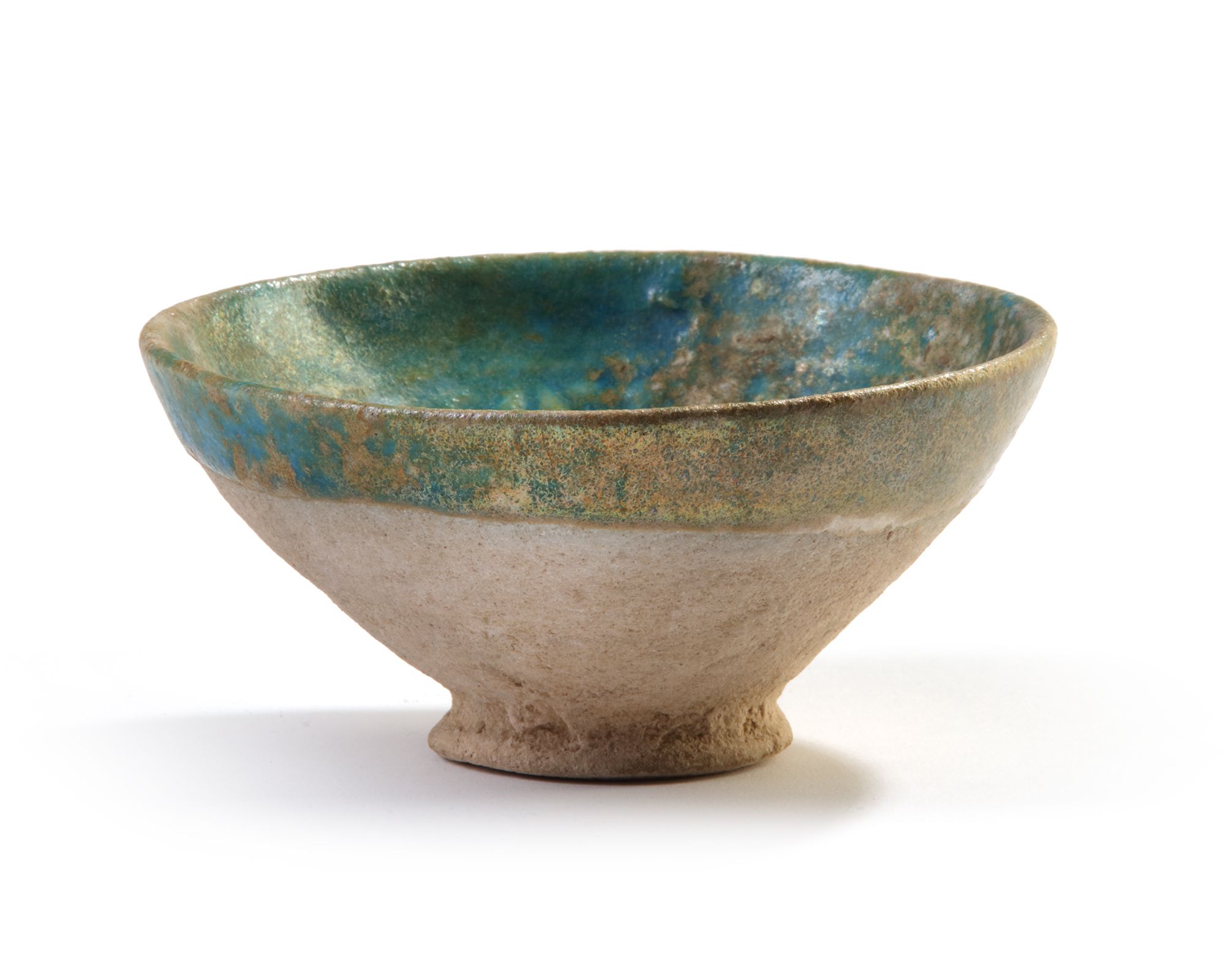 Of conical form, on short straight foot, the interior is covered with a greenish turquoise glaze while the exterior is partially unglazed.