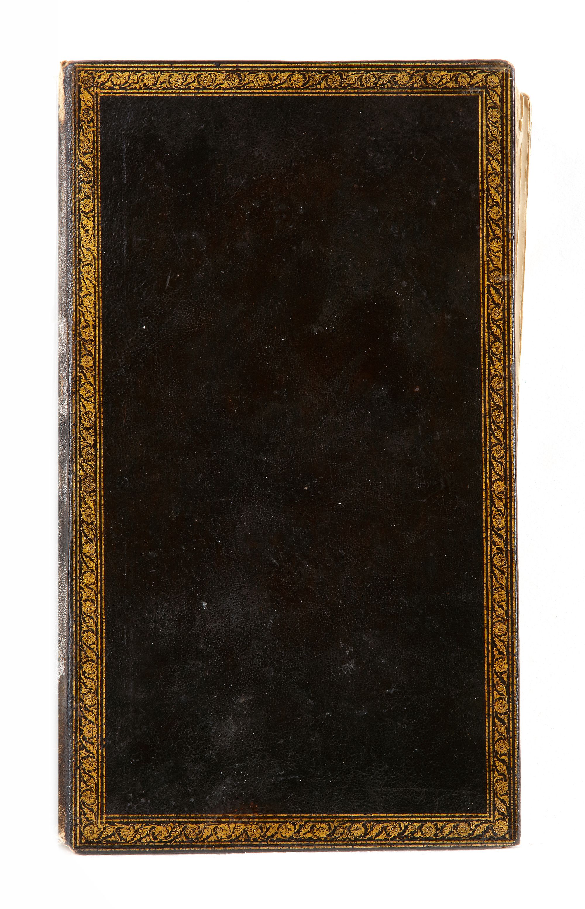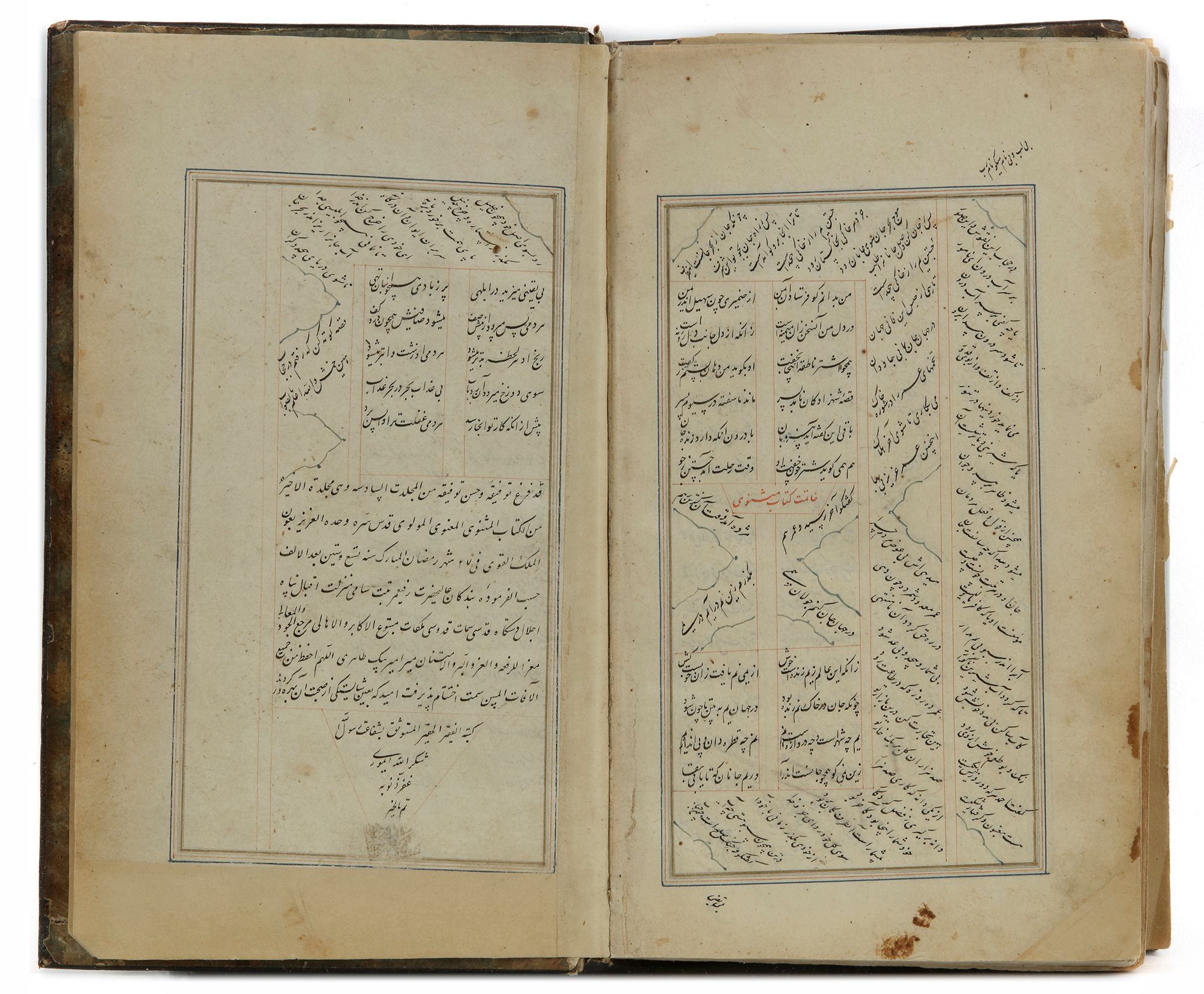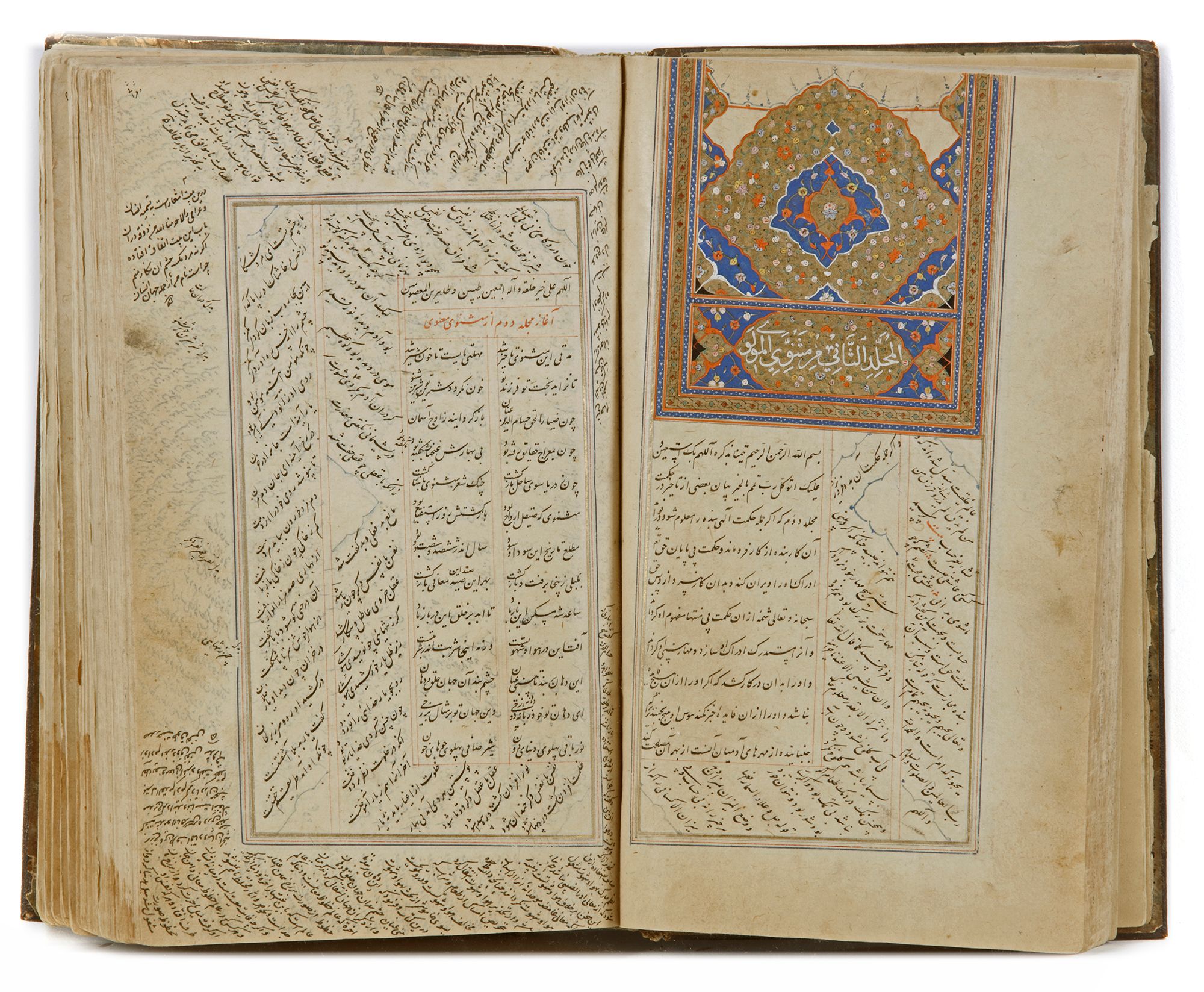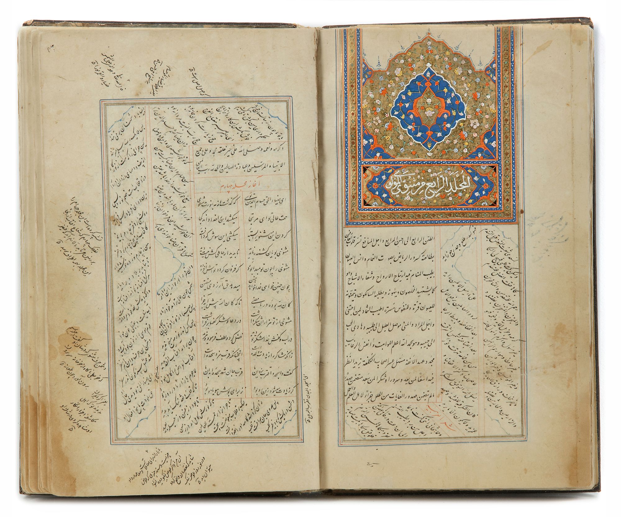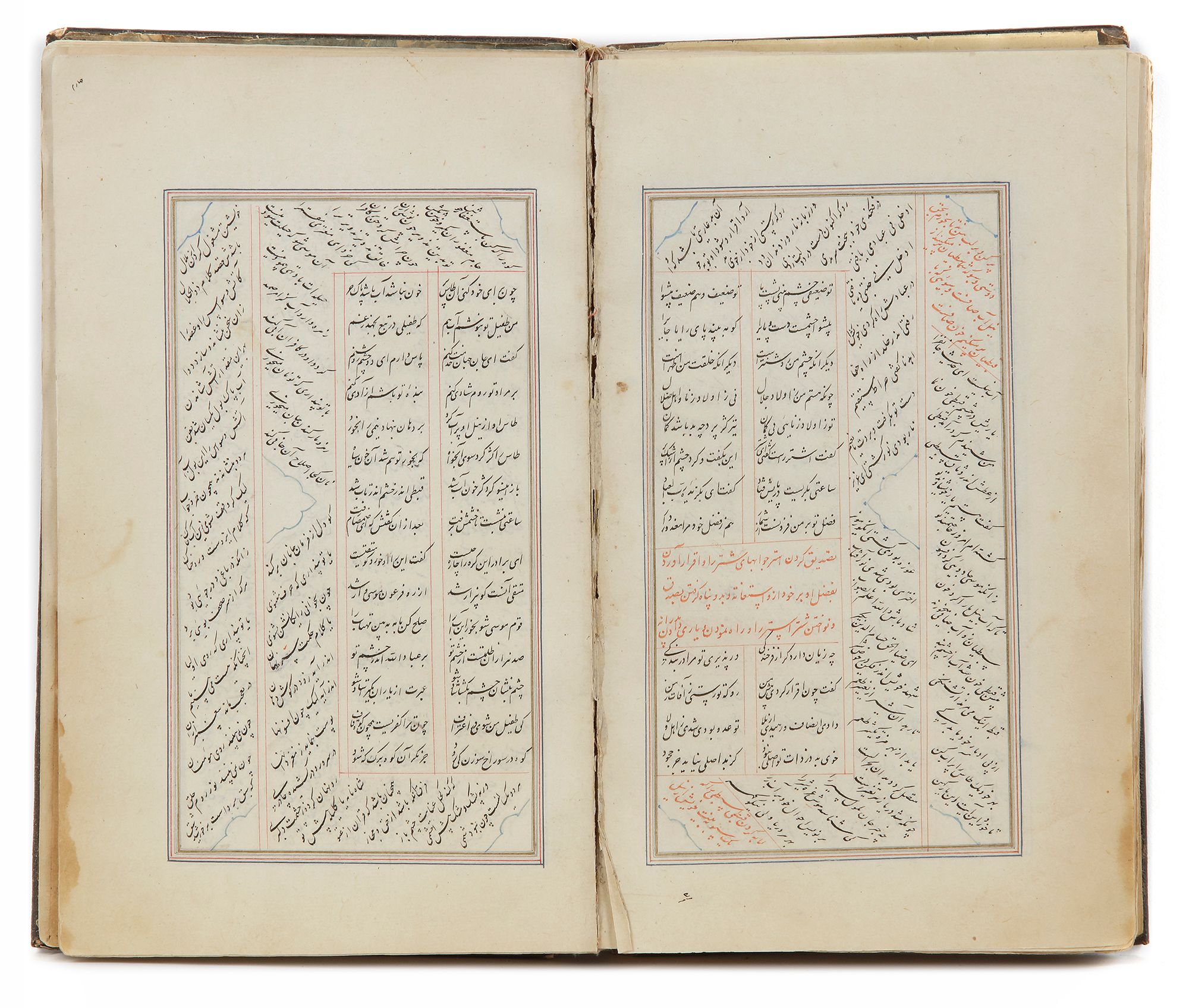 Persian manuscript on paper, very fine calligraphy nastaliq black on 14 lines per page on two columns surrounded by two other columns where the nastaliq is written obliquely, the titles noted in red, divided into 6 volumes 'mojeld' each opening with a beautiful illuminated unwan, with its preface in Arabic. Binding without flap in morocco. 27 by 17 cm.