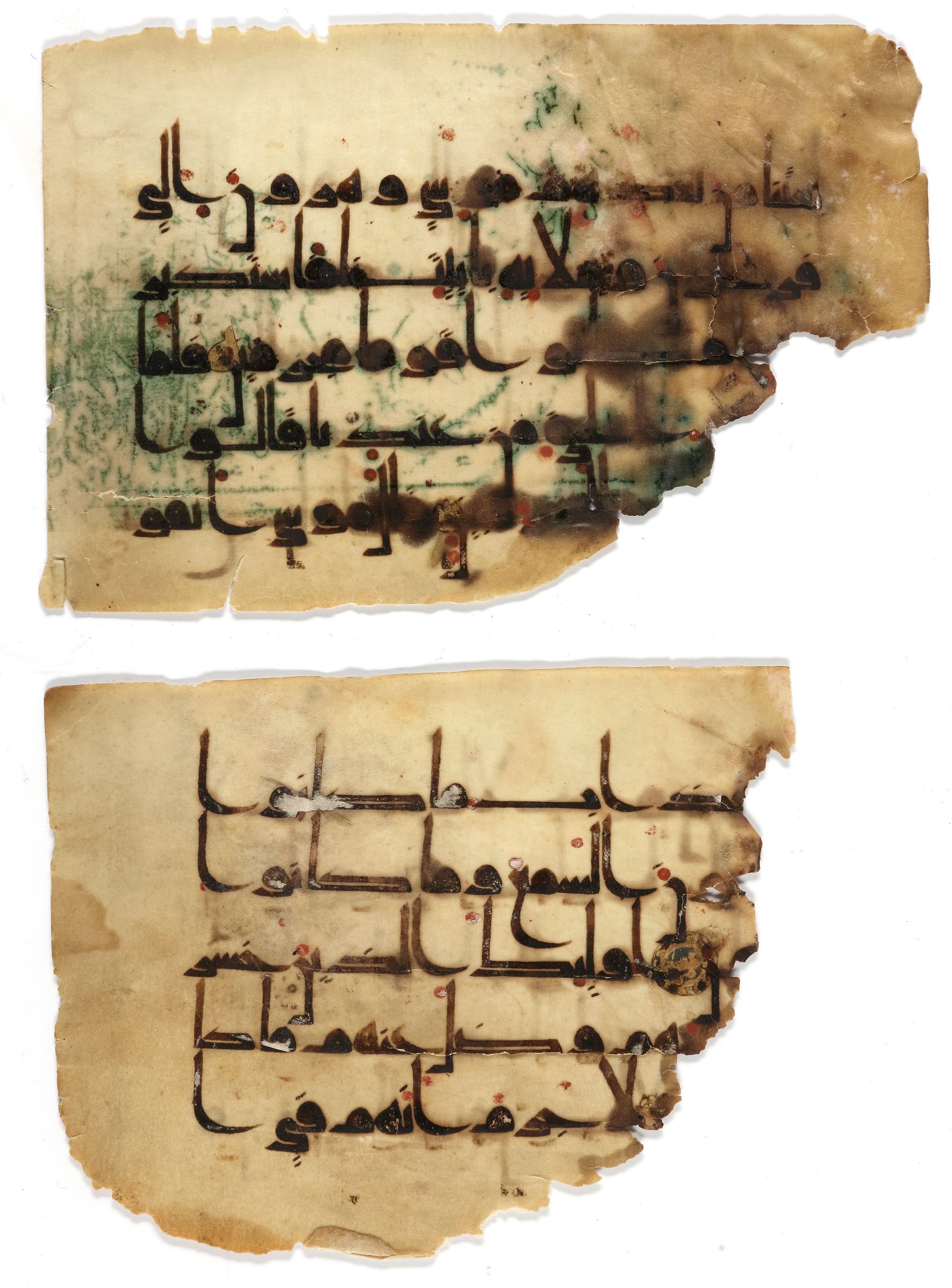 The first manuscript folio in Kufic script, black ink on vellum. Surah Yunus (Jonas), verses 73-76, marked with gold dots, fifth verse marked with a circular illuminated device in gold, with 5 lines, diacritics and vowel points in green and red. The folio slightly faded side and damaged either corroded or burned. 18 by 12 cm.