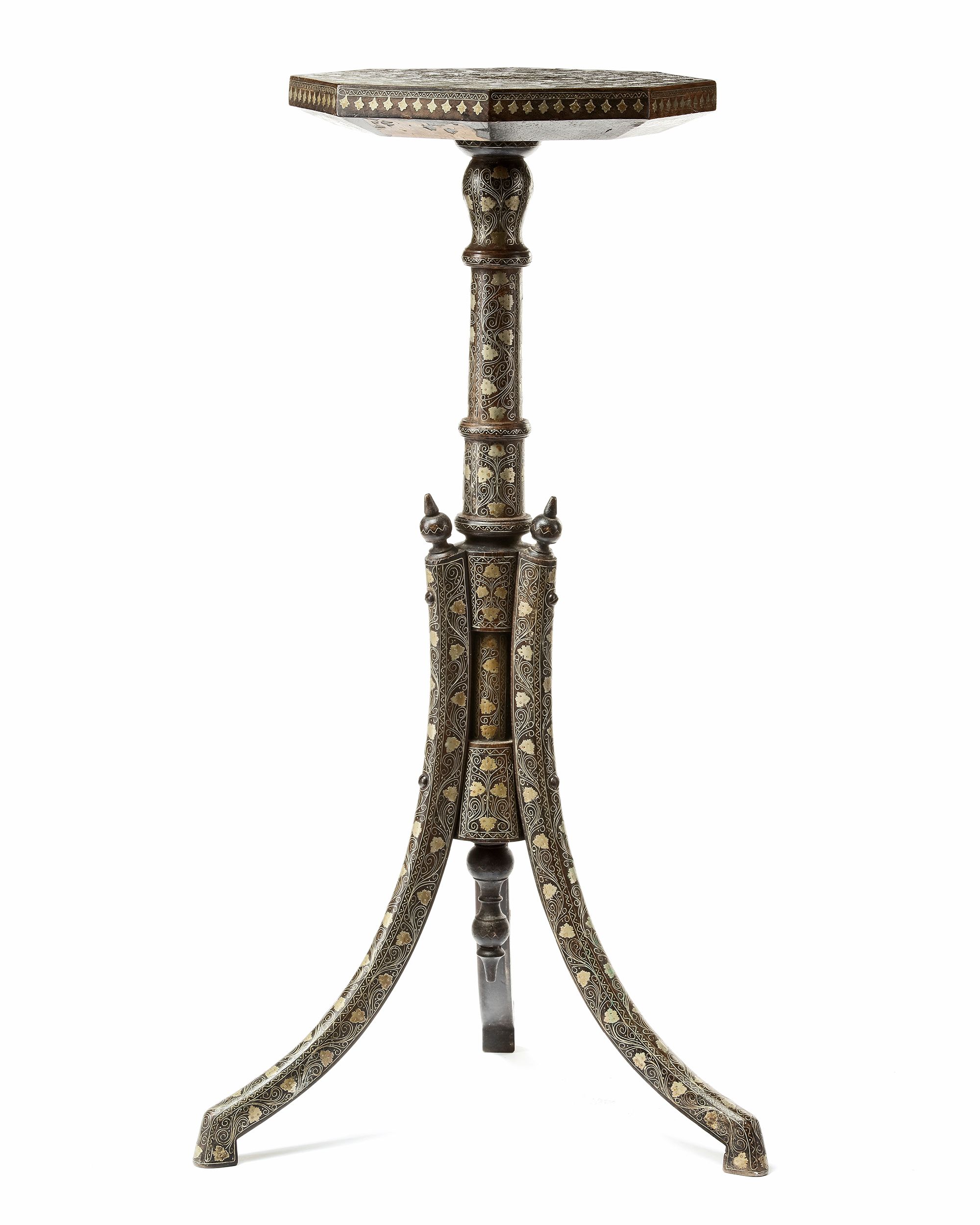 The top resting on a singular central column supported by three legs, all surfaces covered in a wire-inlaid floral design, the surface with floral motifs emanating from the centre comprising a vine leaf and grape design.