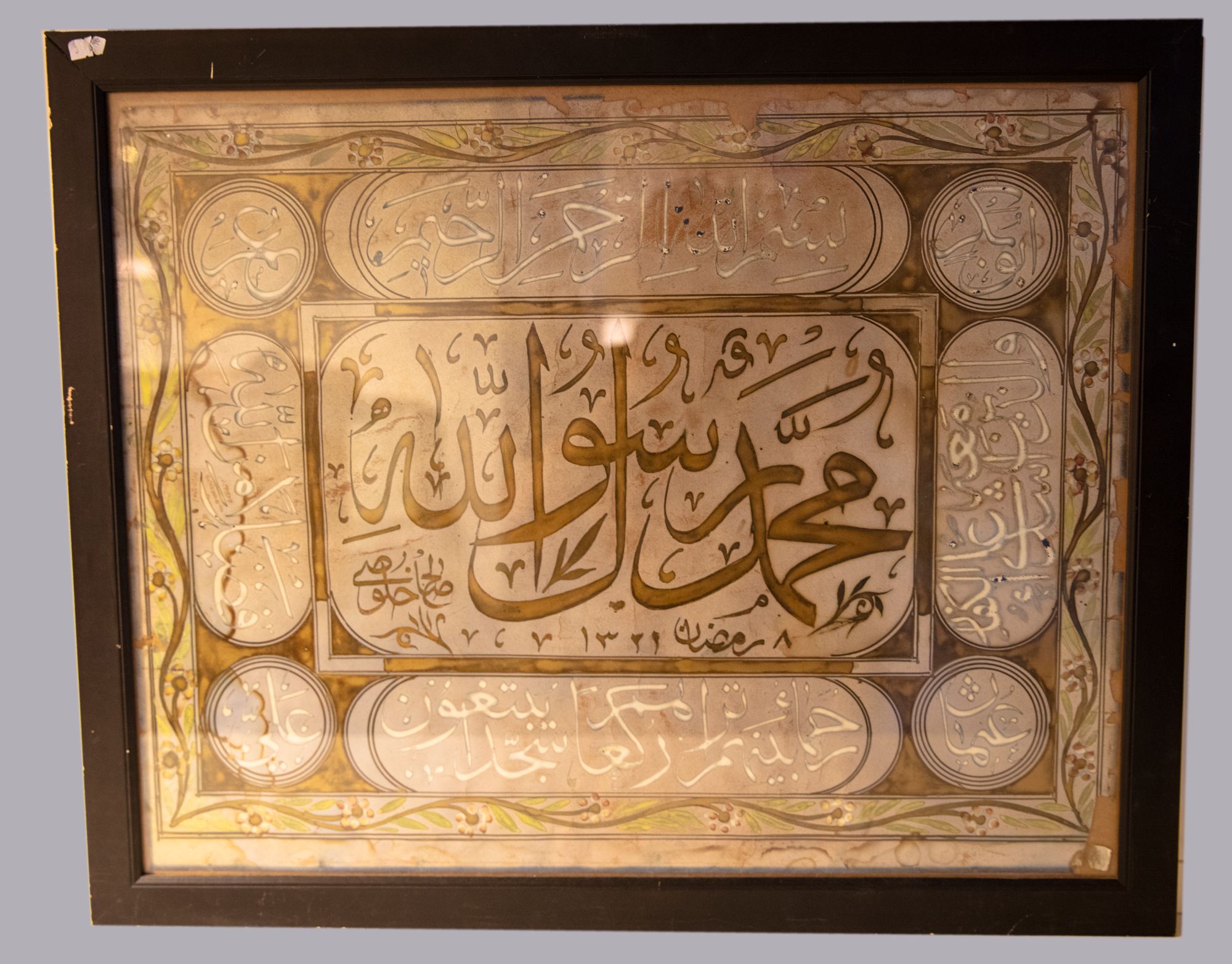 A large Ottoman calligraphic composition, Levhas. Written in white and gilt thuluth script, with verse 29 of the Sūrat al-Fatḥ (Arabic: سورة الفتح, "Victory, Triumph"). The exquisite description of the Prophet Muhammad, peace be upon him and his companions and followers.