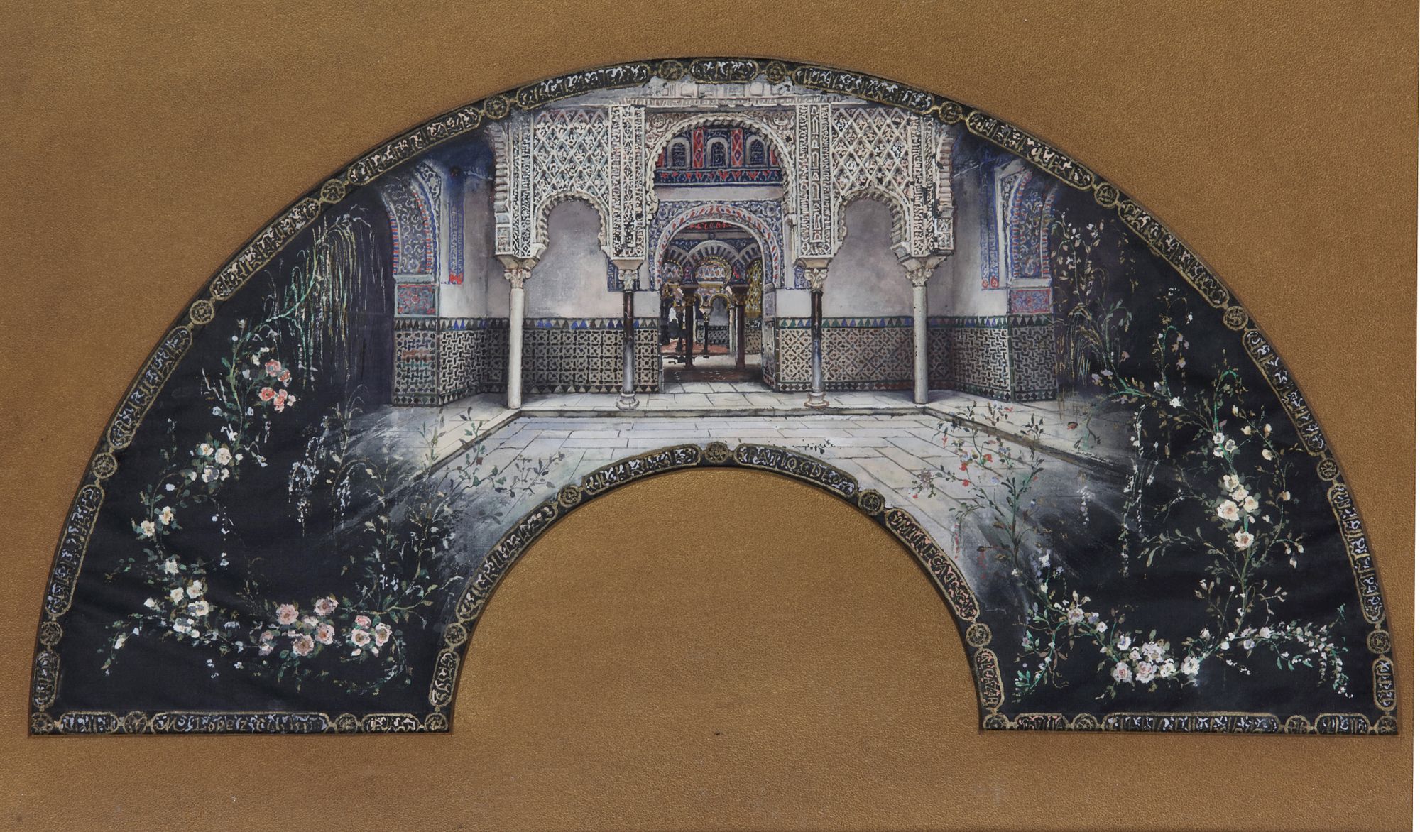 SPANISH SCHOOL ( XIXth Century) A Fan Design depicting; A Moorish patio (Sevilla ?) surrounded by flowers Bodycolour on paper.