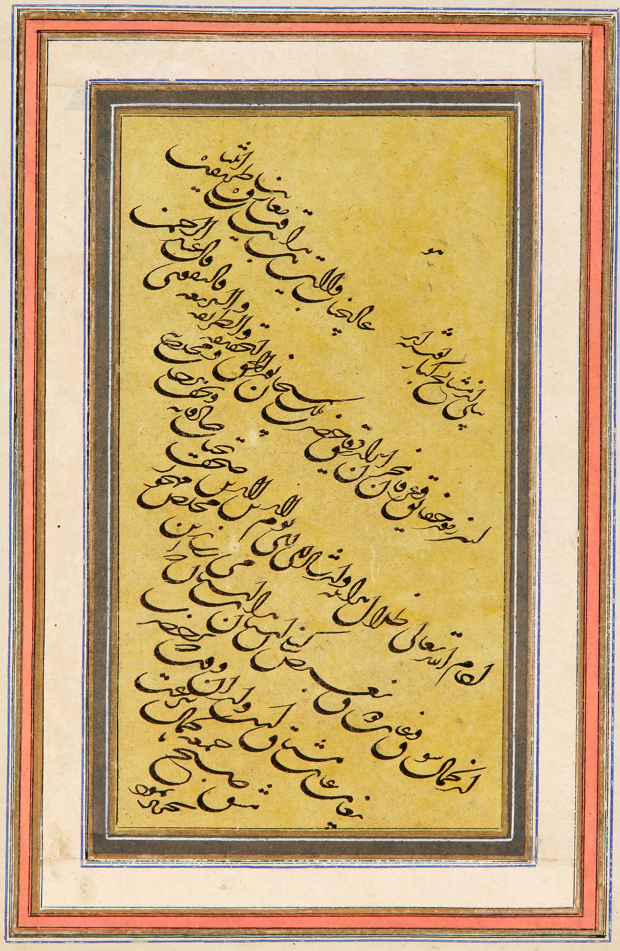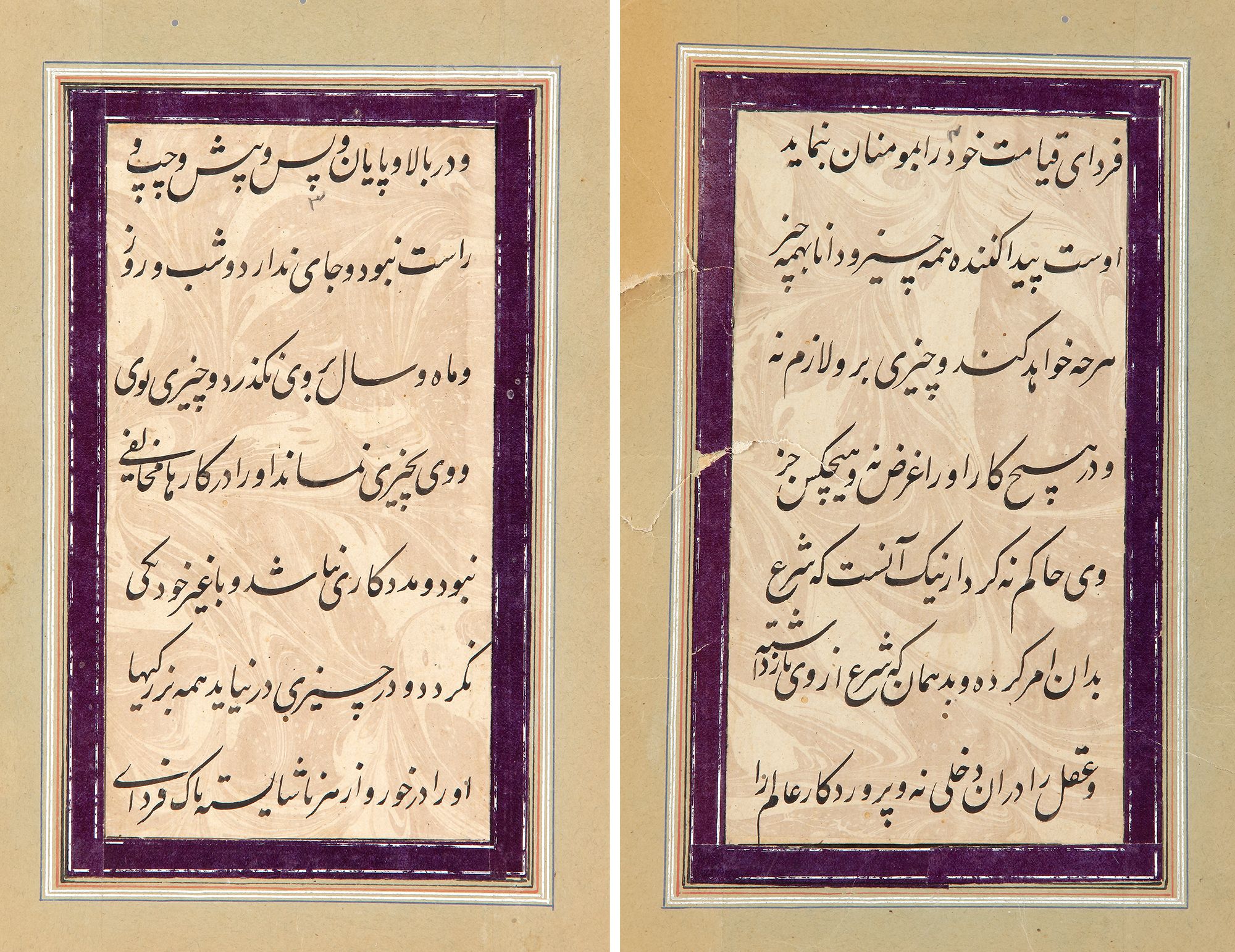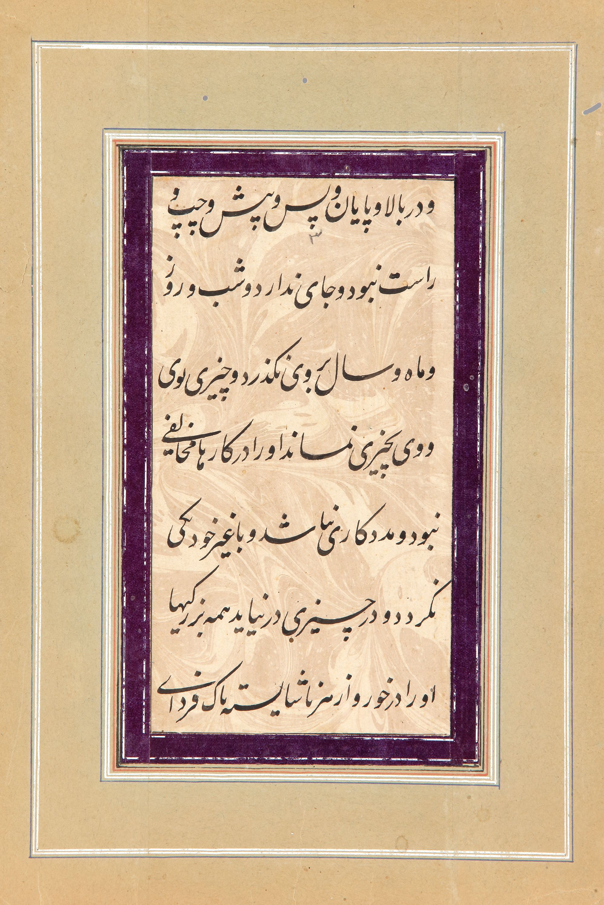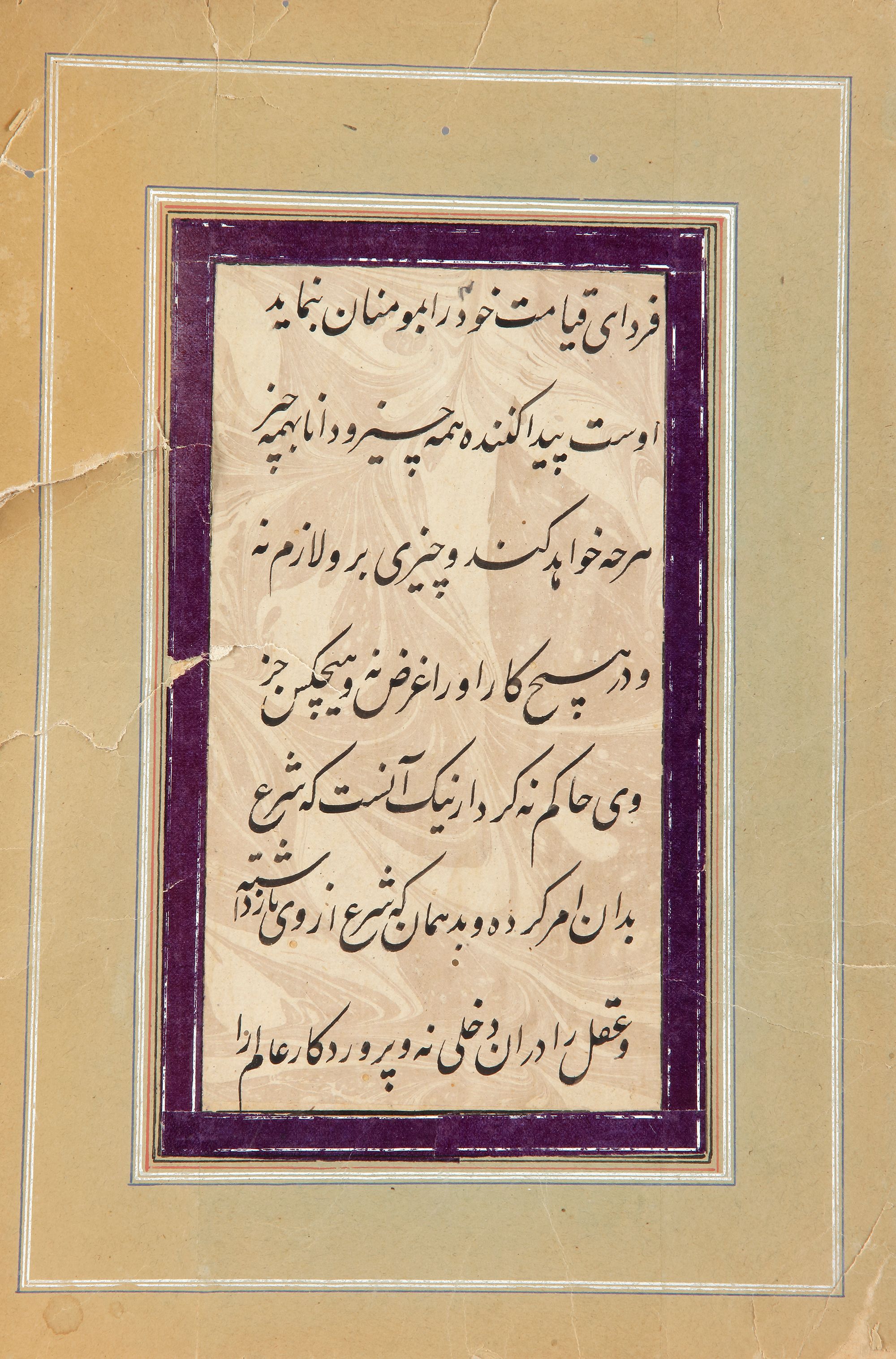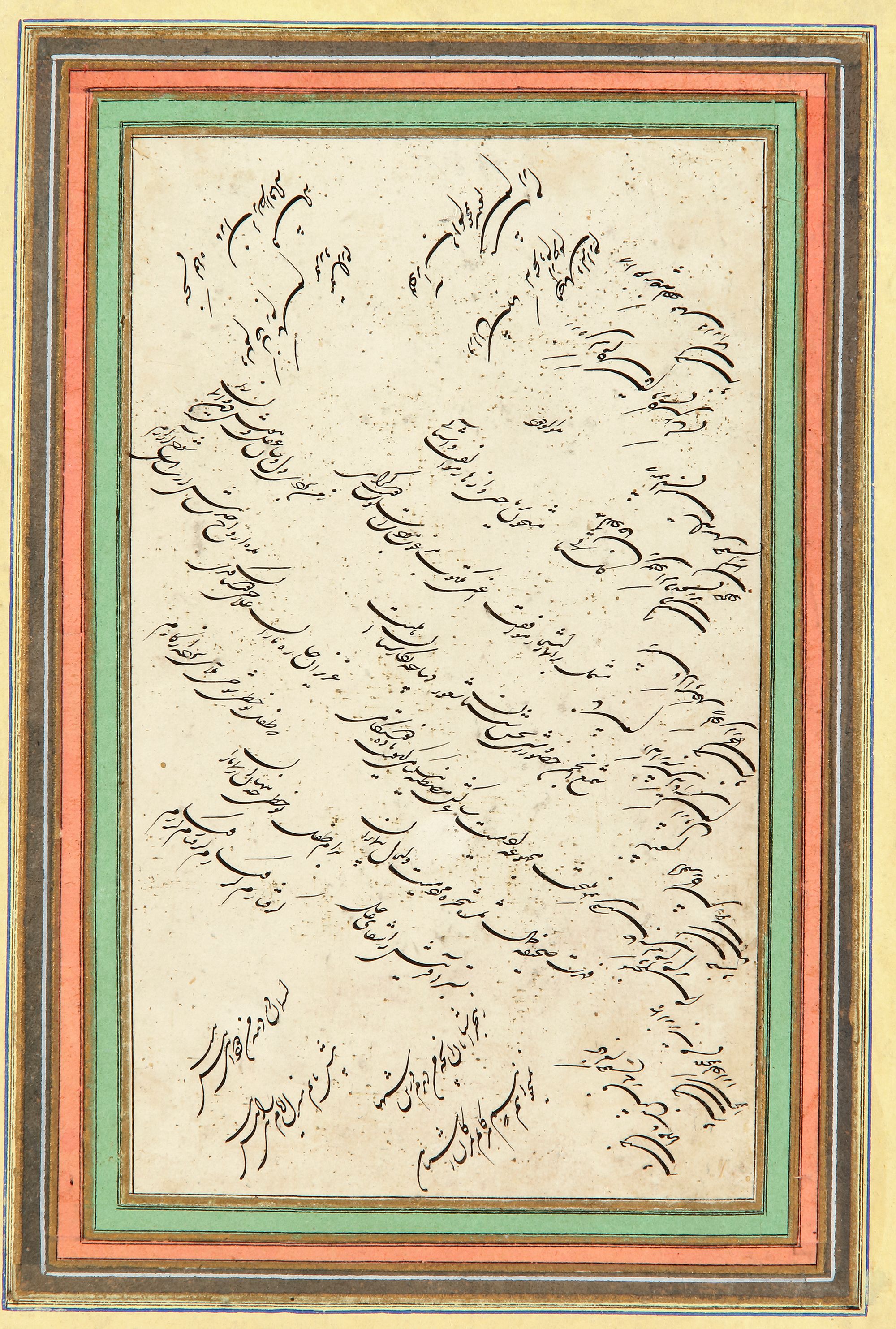 Persian manuscript on paper, laid down on album page, written in black nastaliq script, ruled ingest and polychrome borders. 12-14 cm. by 19-22 cm.