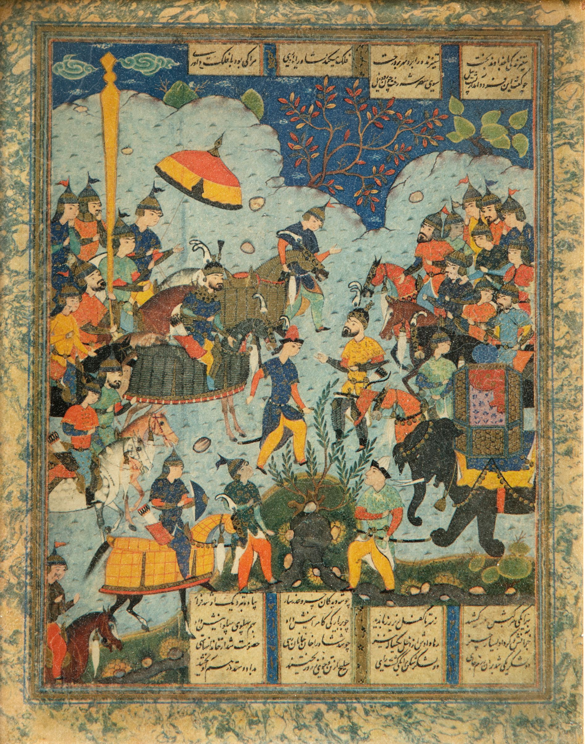 Persian manuscript on paper, with 4-5ll. of black nasta'liq script written in four columns, headings in red, catchwords, margins in blue, red, black and gold.