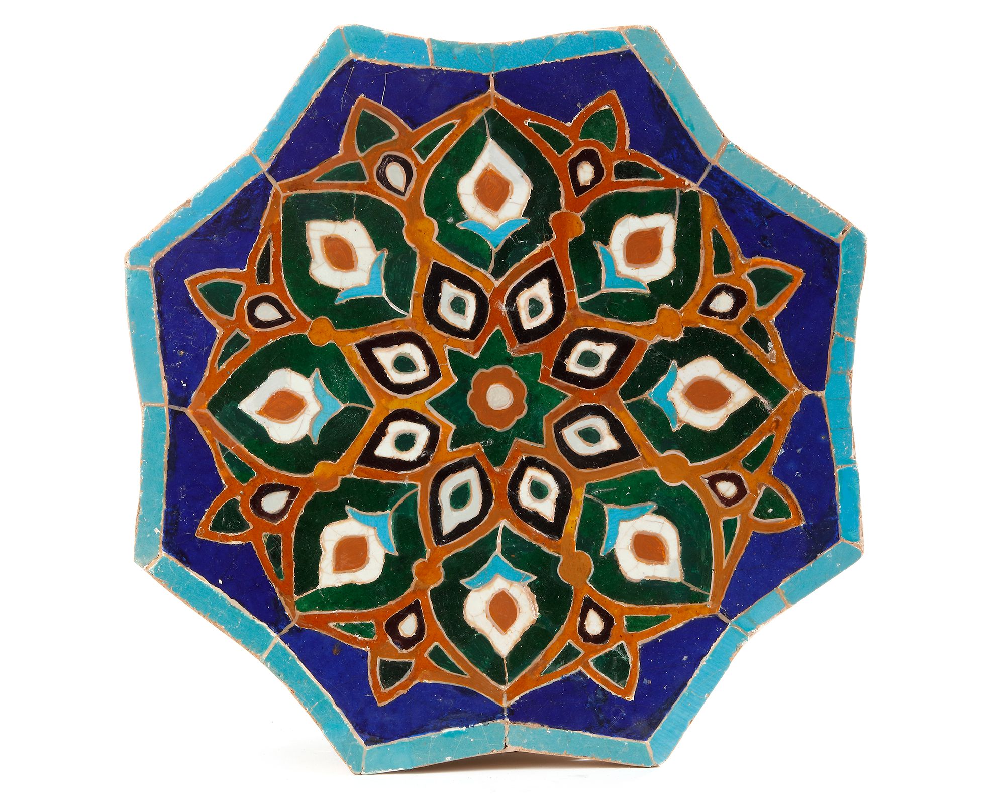 Related examples, each of stellar form with blue, turquoise, white, manganese and traces of gilding with a design combining stellar and naturalistic forms are in a number of Museum collections including the David Collection, Copenhagen, inv. no. 27/1967, The Victoria and Albert Museum, London, inv. no. C.747-1909, the British Museum, London, inv. no. G.486, and the Metropolitan Museum of Art, New York, inv. no. 17.143.1.