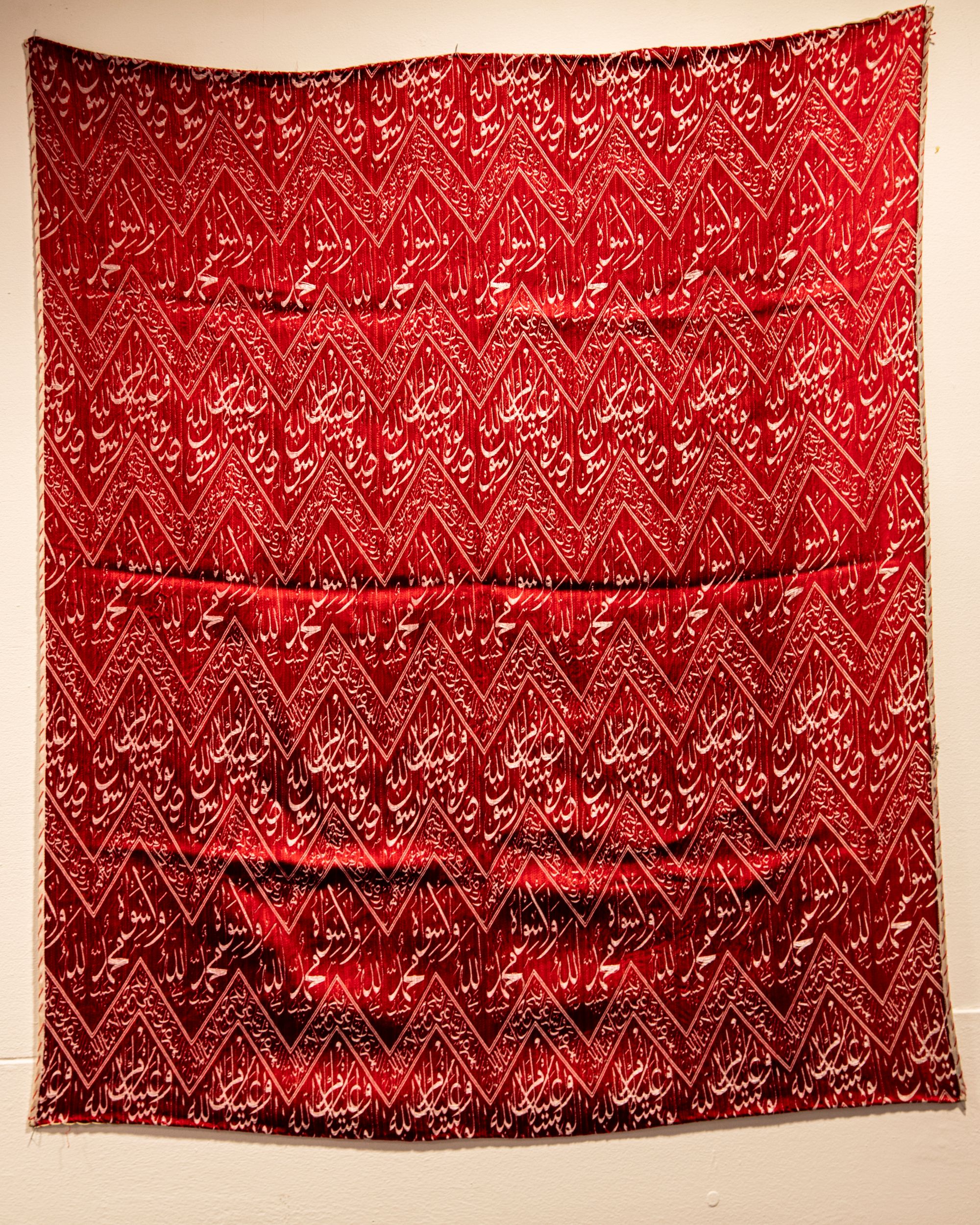 The design consists of invocations to God and the Profession of Faith woven into the fabric. These are composed in a style known as jali thuluth.