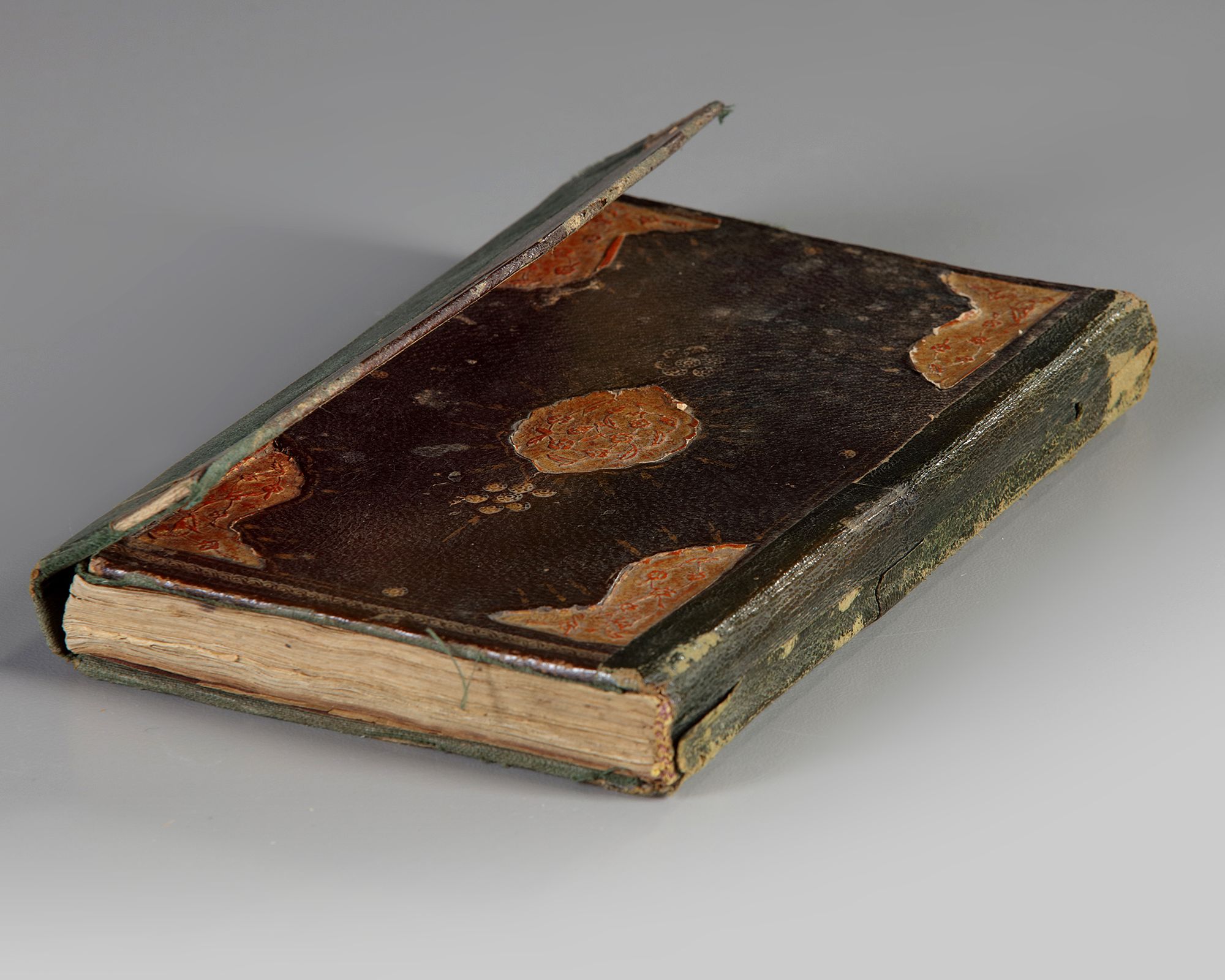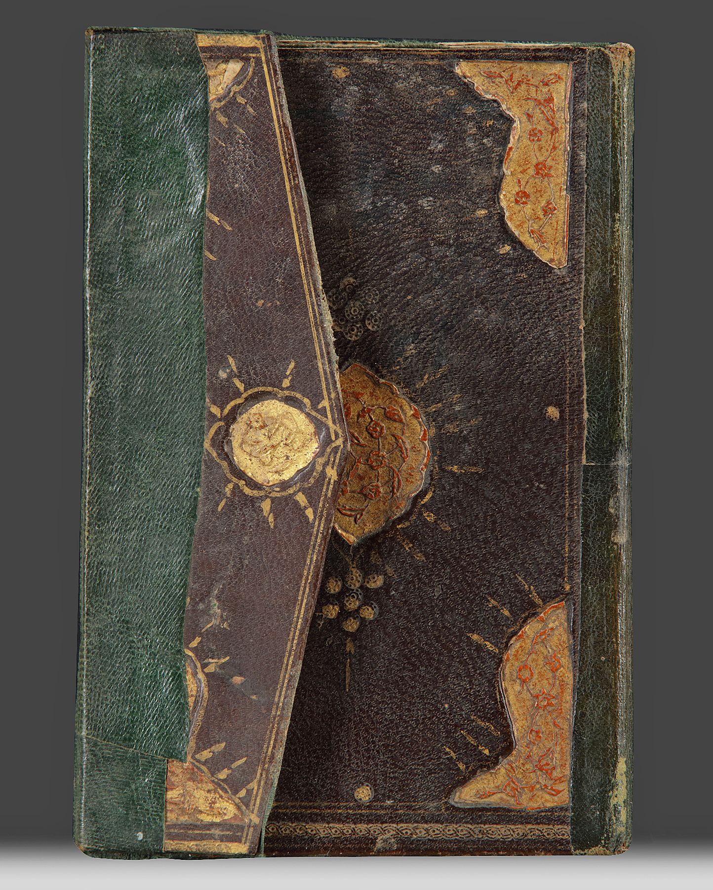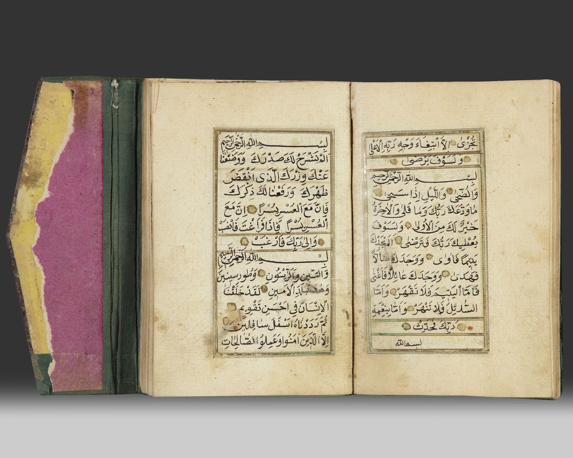 An Islamic Quran section, with multiple sura's with some interpretations in Persian an Arabic language. Arabic manuscript on paper, each folio with 11ll. of naskh in text gilt panels, opening bifolio with gold and polychrome illumination framing the text.