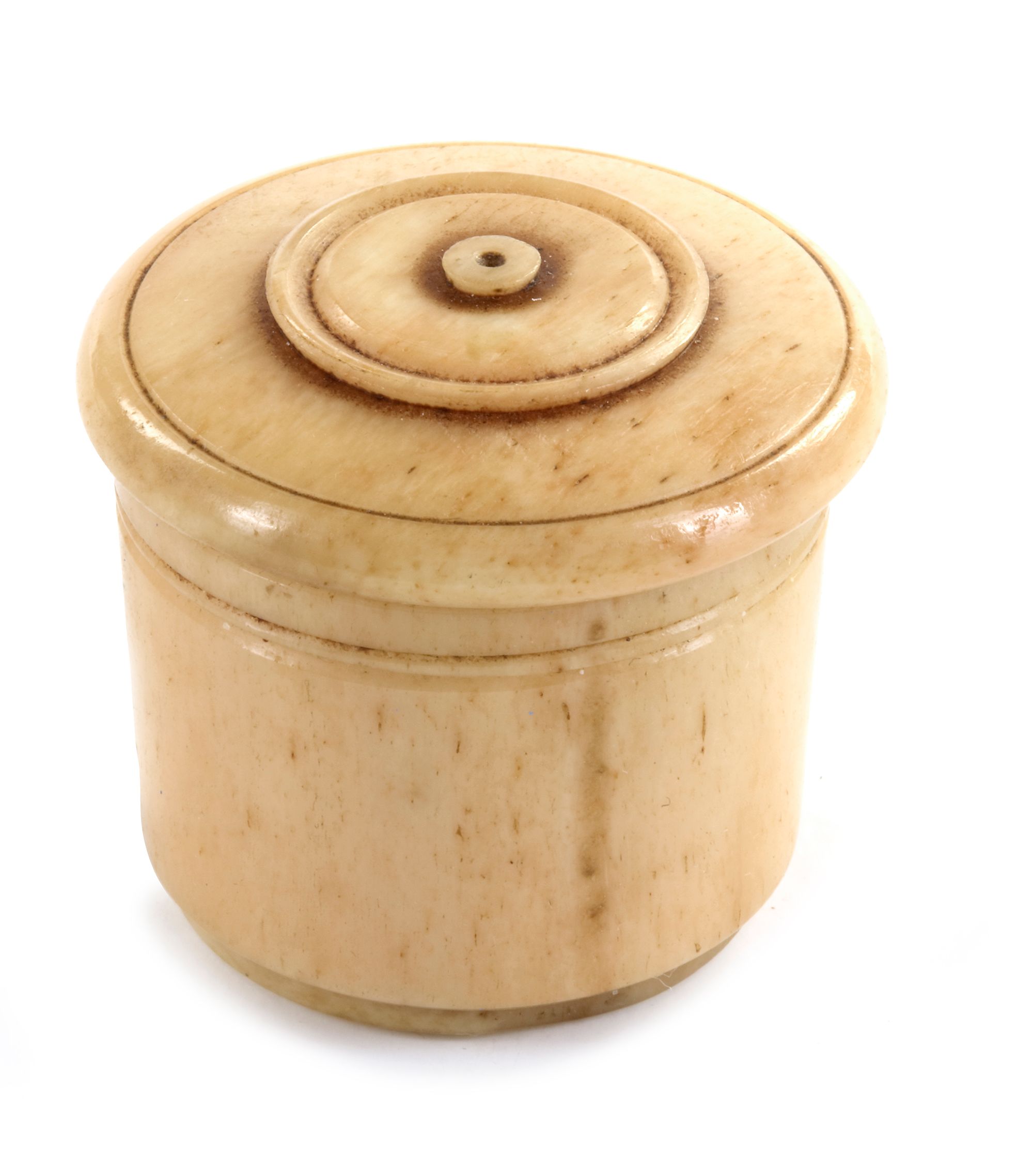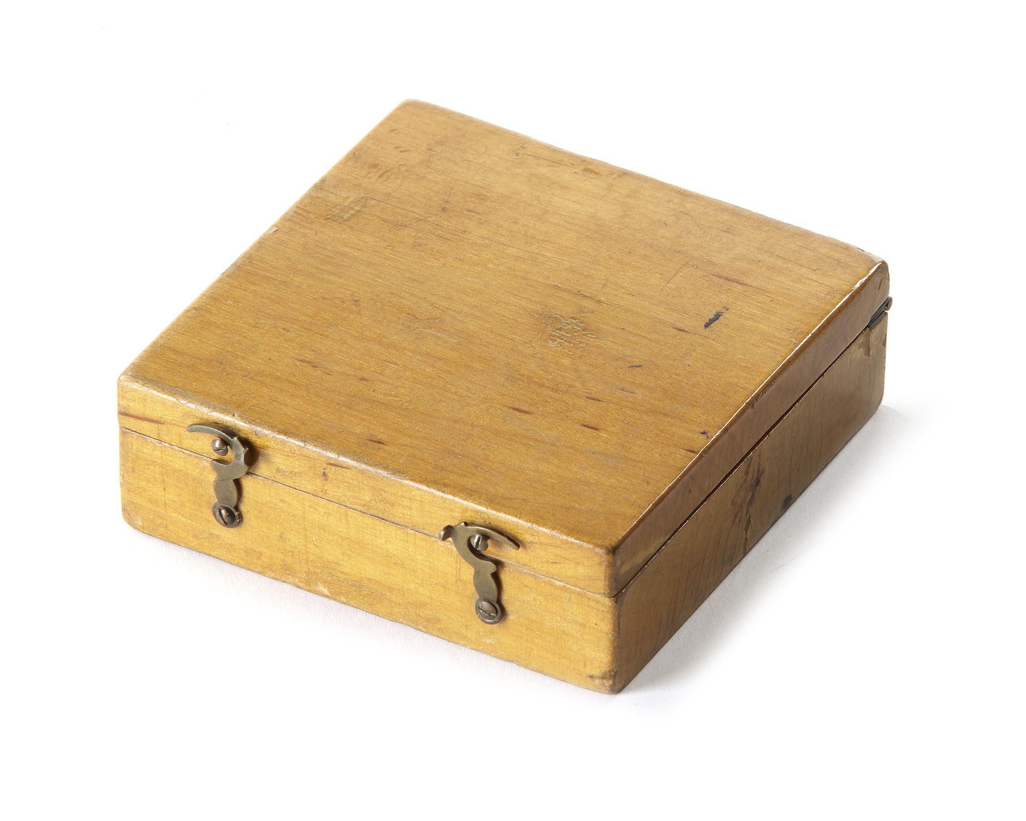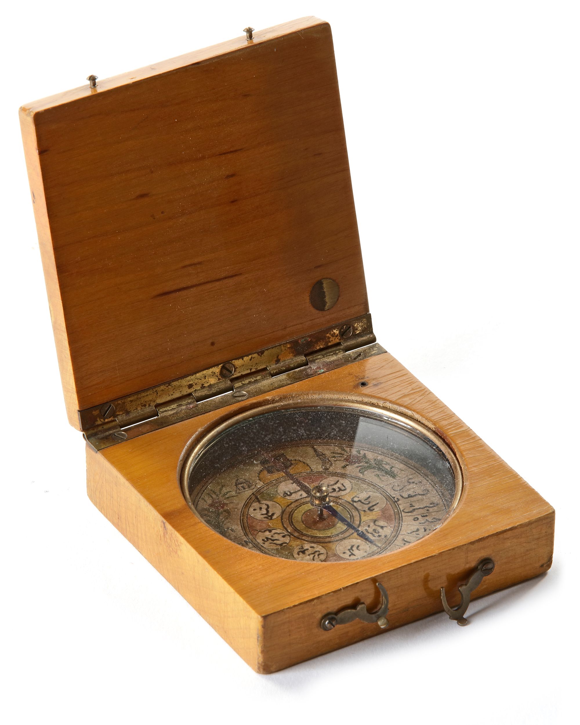 A MUGHAL BONE QIBLA INDICATOR 19TH CENTURY A small bone qibla indicator with a view of Al-masjid Al-haram to the interior of the cover, the base with a compass with cruciform steel needle and glazed cover. H: 2.8 cm A MUGHAL WOODEN QIBLA INDICATOR 19TH CENTURY the base with a compass with cruciform steel needle and glazed cover 8.5 by 8.5 cm