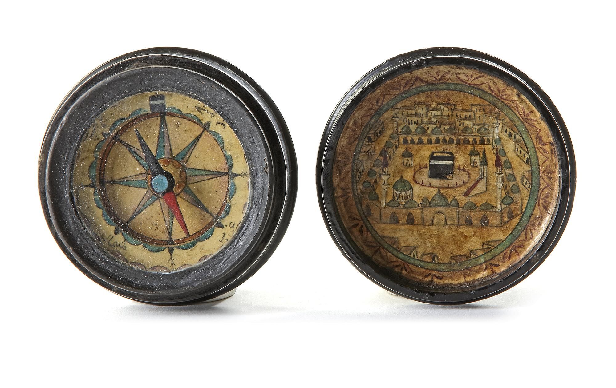 AN OTTOMAN BLACK QIBLA INDICATOR 19TH CENTURY The interior of the cover with the Kaaba at the centre surrounded by the maqams of the four Sunni schools of law with a view of Mecca. The base with a compass with cruciform steel needle and glazed cover. 2.5 by 5.5 cm