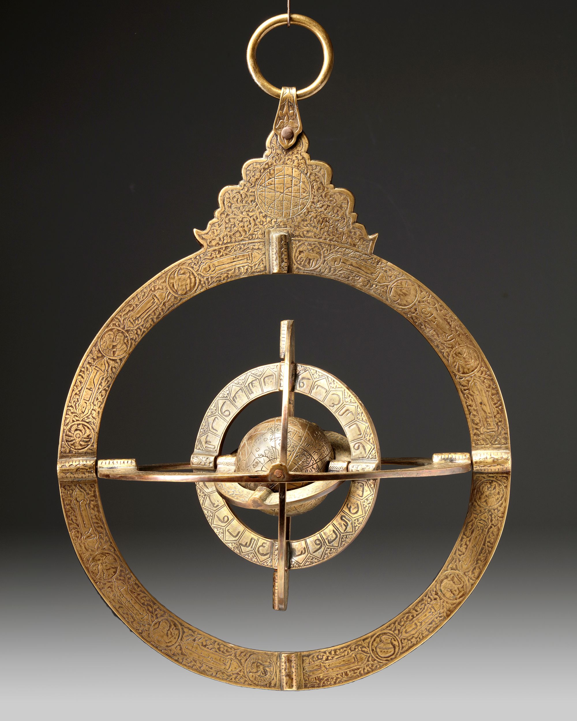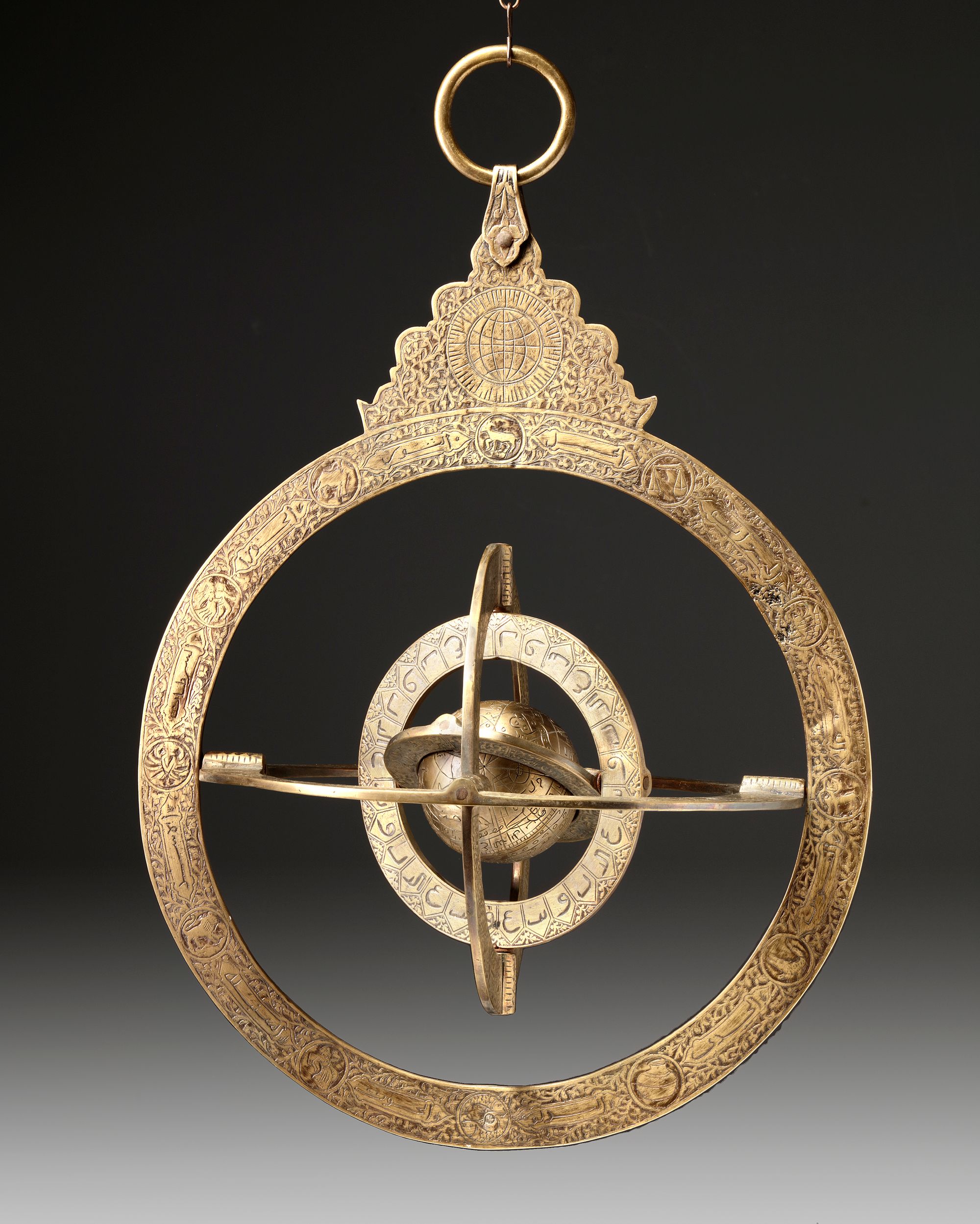 Consisting of a spherical framework of five rings, centred on Earth or the Sun, that represent lines of celestial longitude and latitude and other astronomically important features with Arabic letters on the secnd and the third ring, the planets on the fourth, the astrogical signs on the fifth ring.