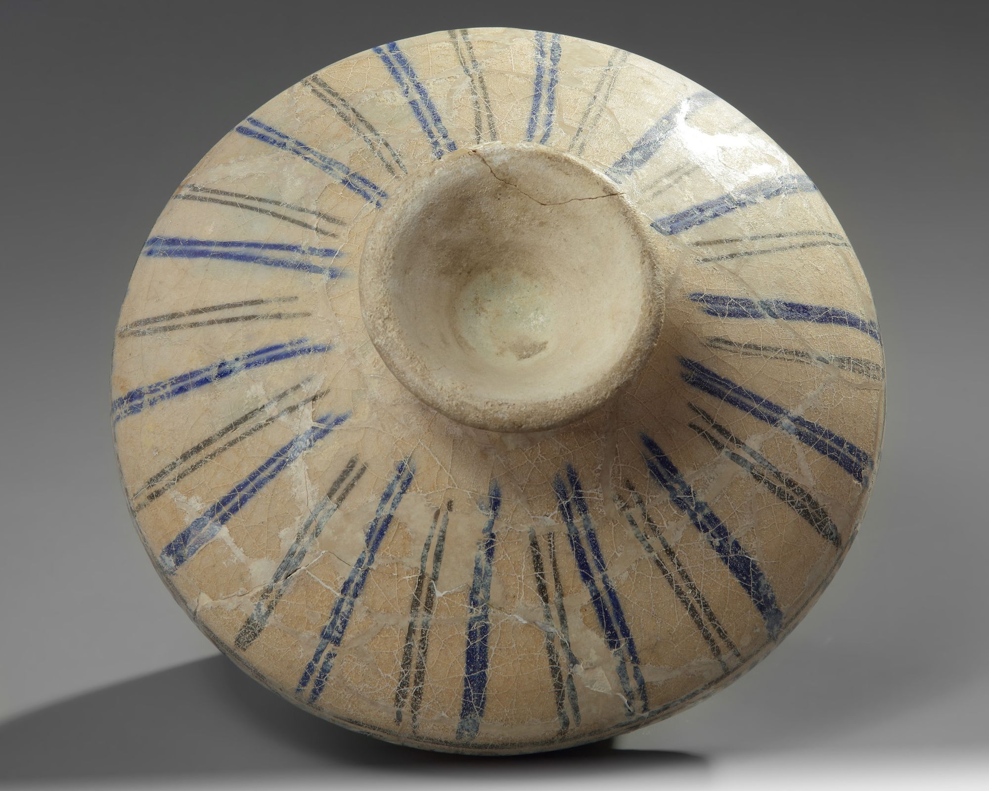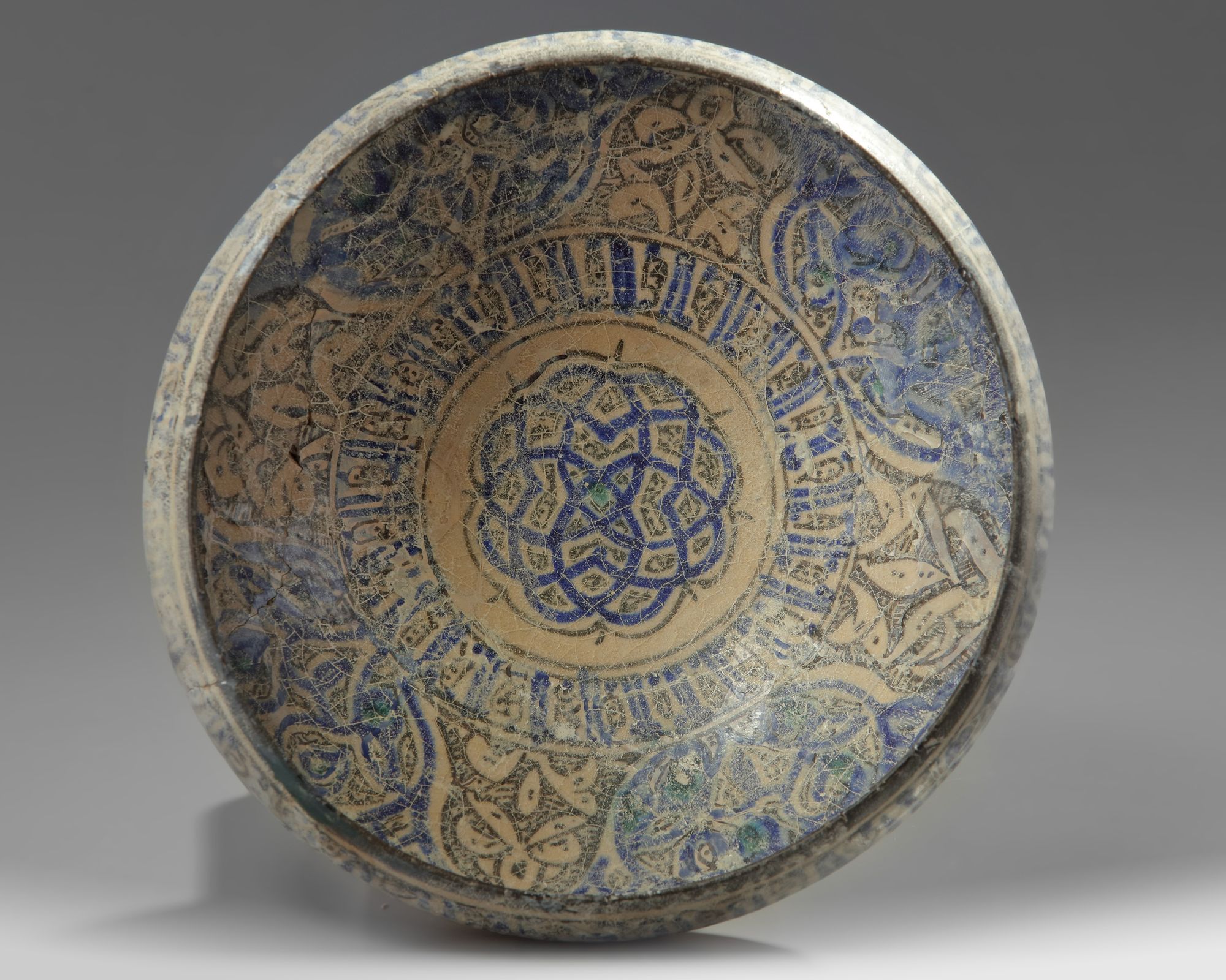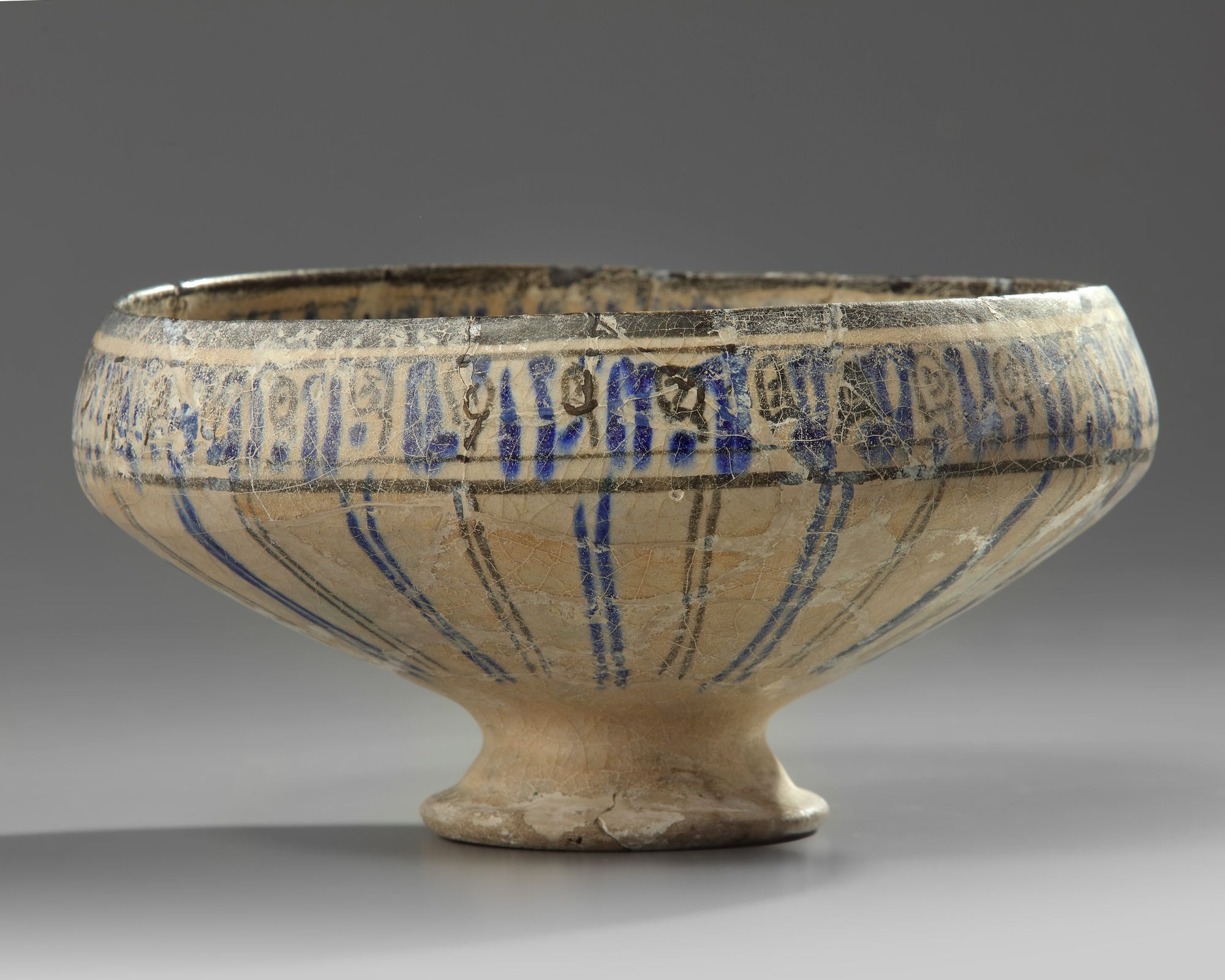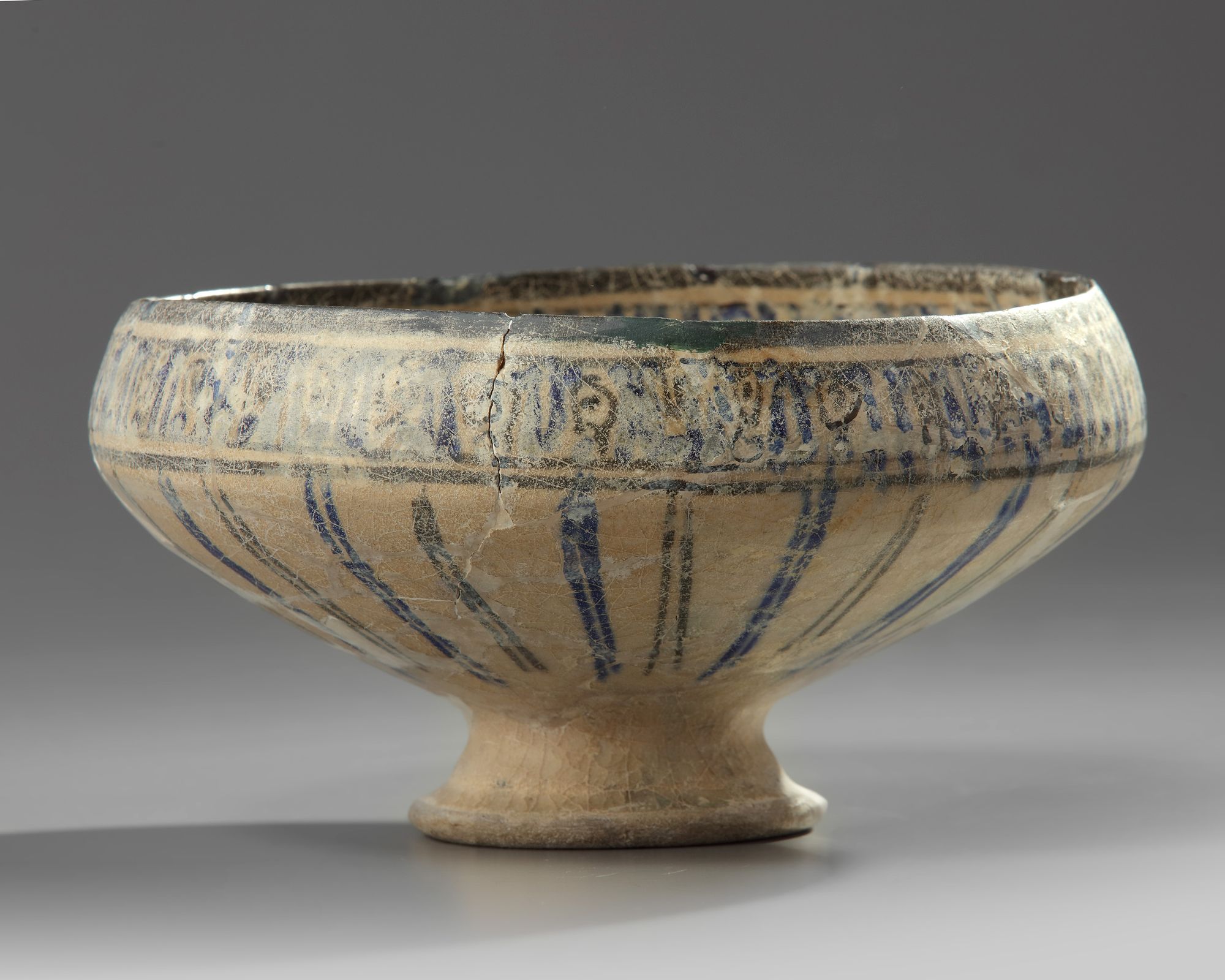The bowl rests on a narrow recessed foot, flared sides that rises to a conical rim, decorated in black and blue with a central roundel enclosing Arabesque pattern and a band of stripes. The sides further painted with stylised flower heads, foliage and stripes. Provenance: part of a private Belgian collection.