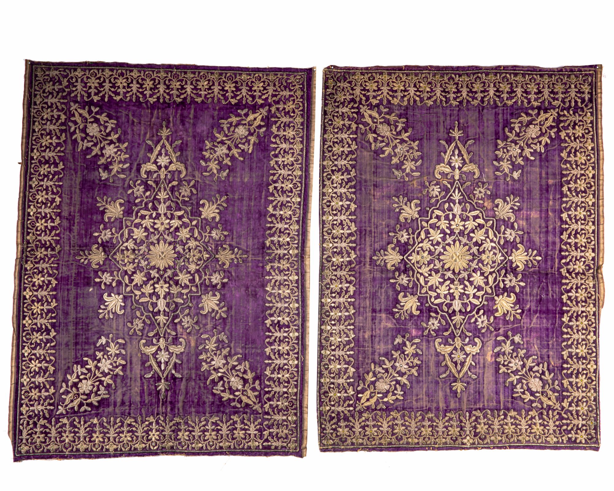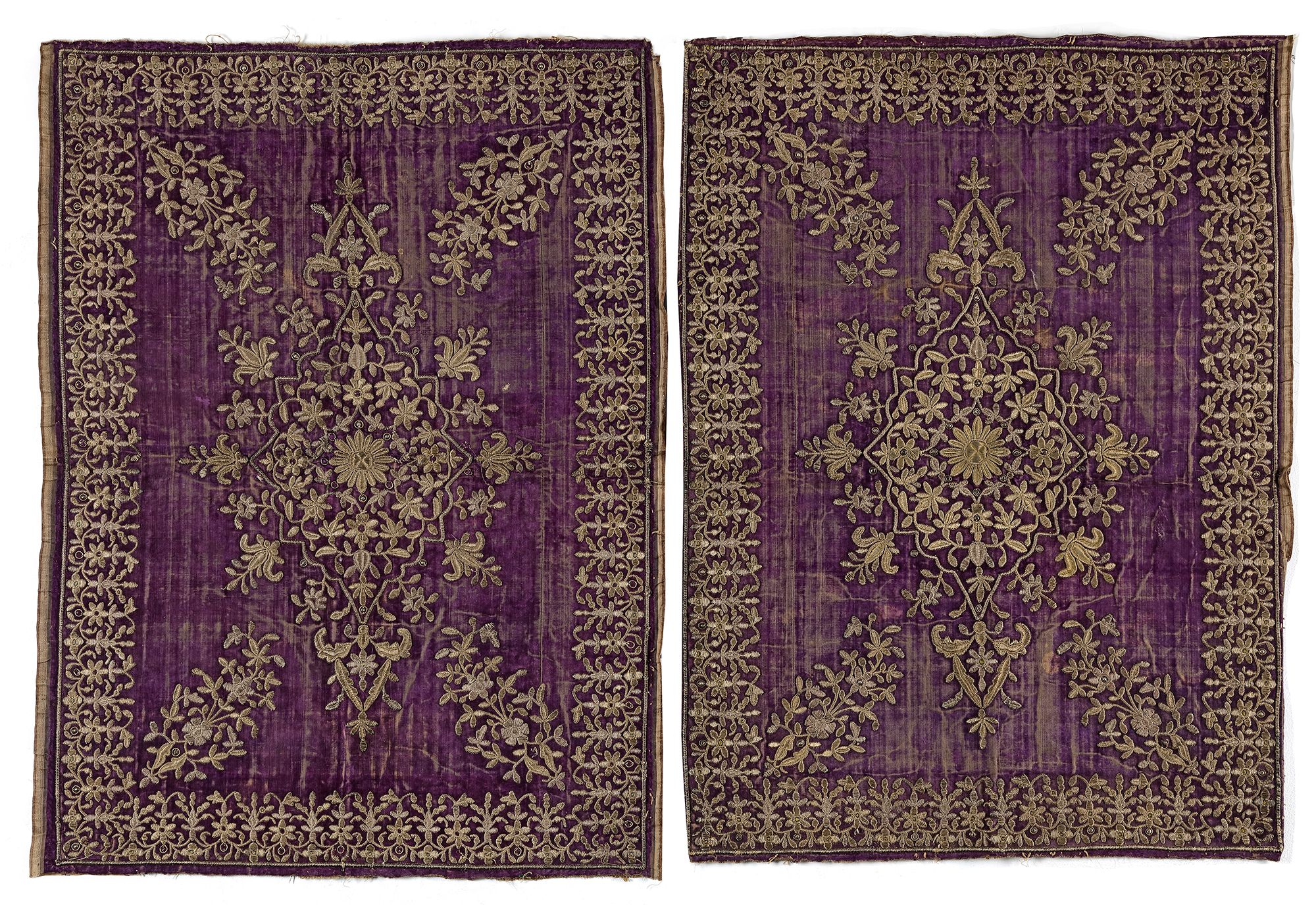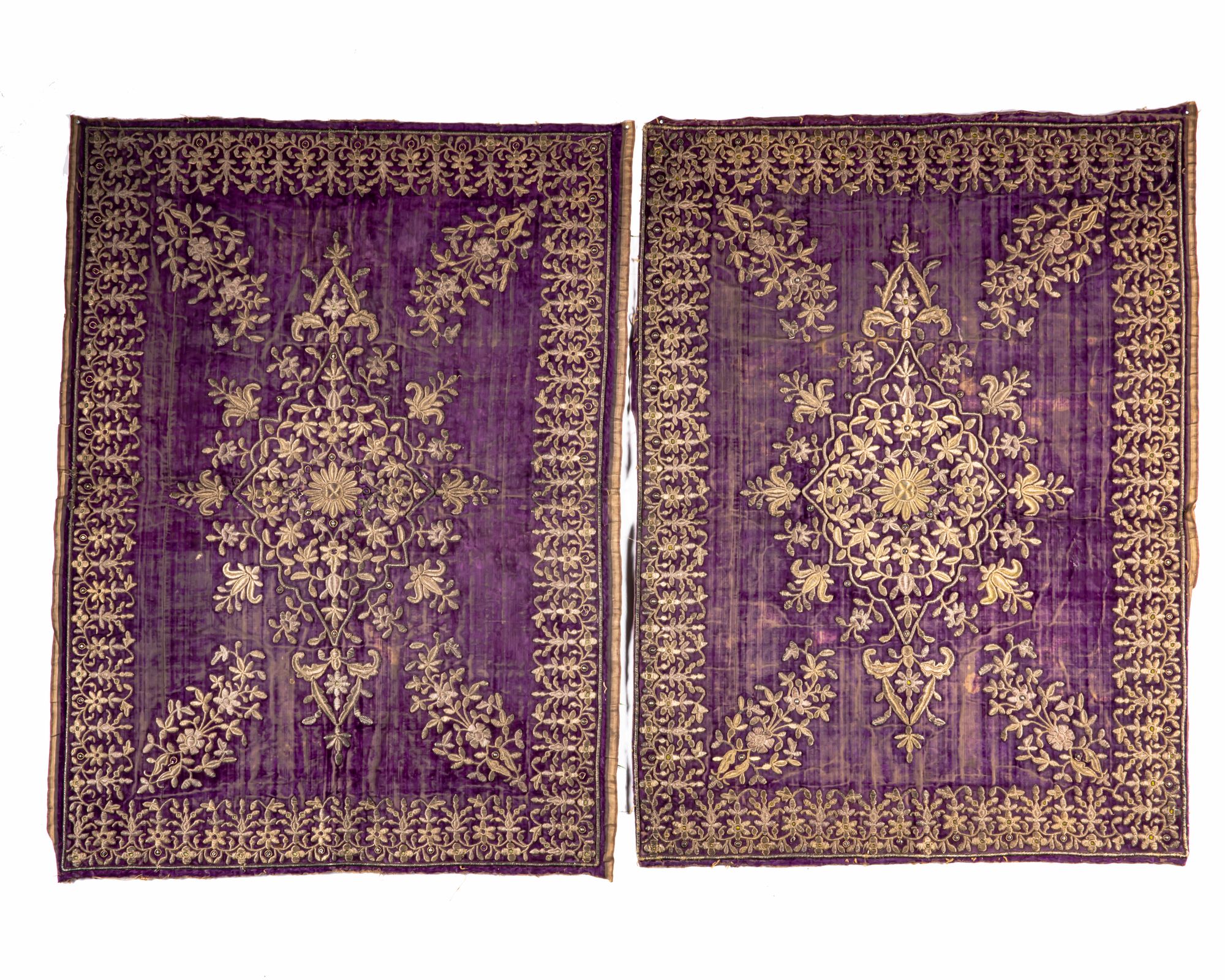 Two panels embroidered with golden and silver metallic threads on a velvet support. These panels were to be used to cover cushions, and serve as Yastik. A quite other use could be envisaged, it could perhaps be tops of bindings of document cases or large books. 76 by 55 cm.