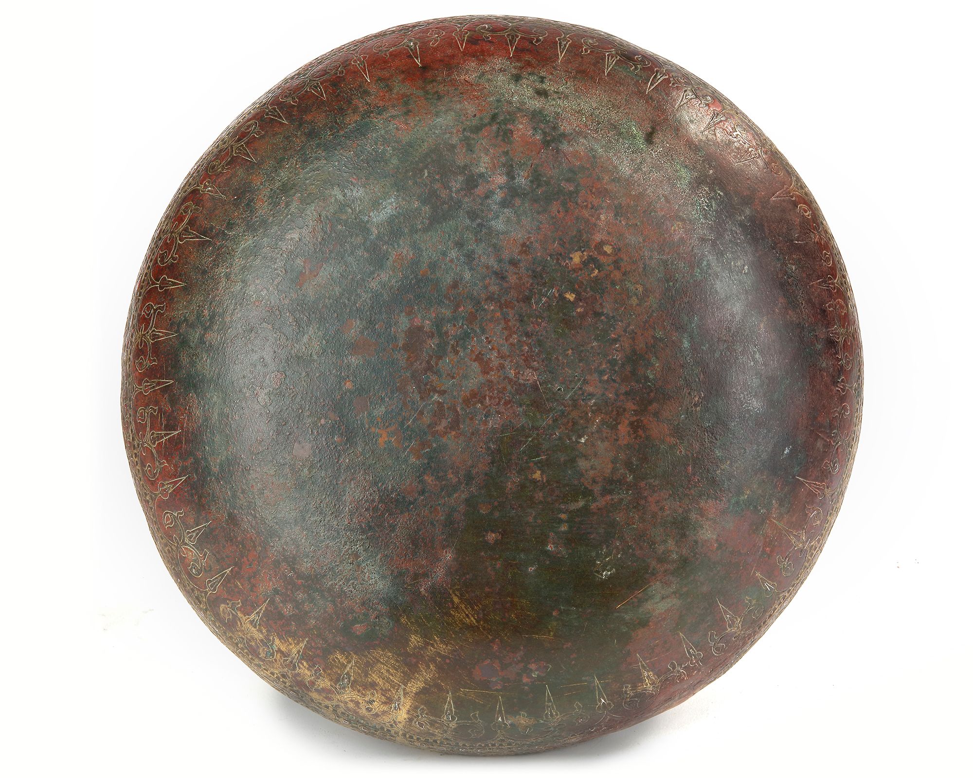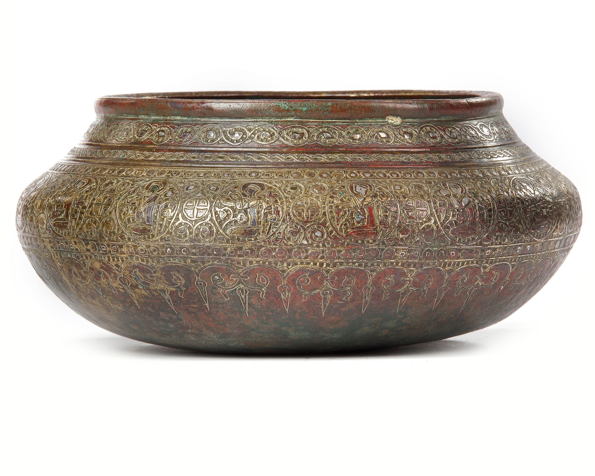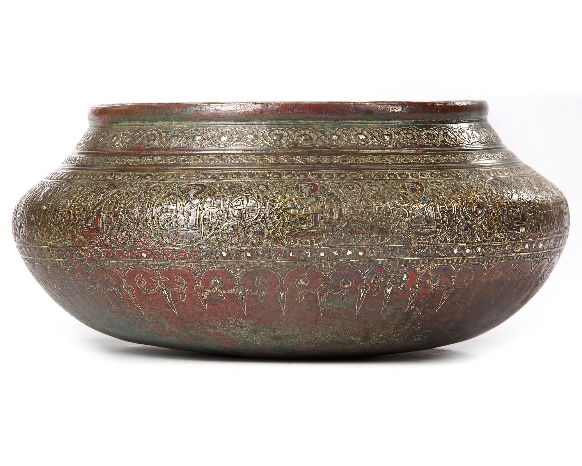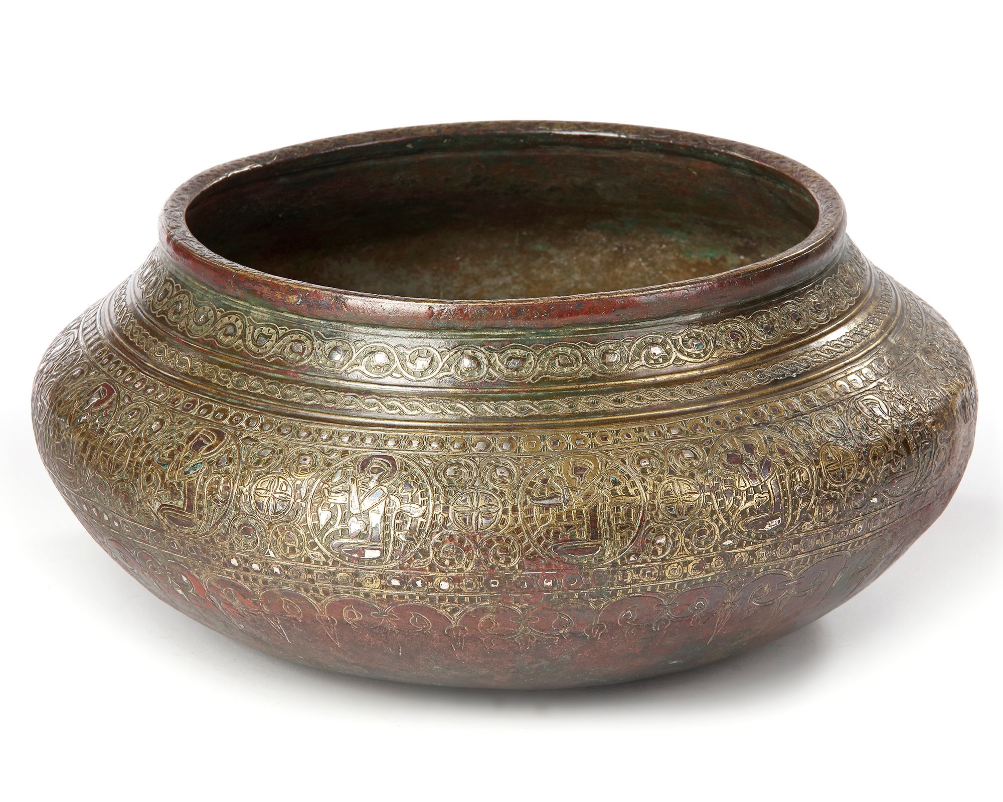 The basin is composed mainly of bronze, with inlay of copper, silver and brass. It is an elegant shape with a broad mouth that flows in to rounded shoulders, which narrow quickly to a rounded base containing particularly complex decoration. The entire exterior of the basin is almost completely covered with highly-detailed inlaid designs that swirls around the surface, enhancing the shape. At first glance, the design lends the surface of the object a silvery and ornate impression, but upon closer examination, a forest of ornament becomes apparent in bands of braids and vegetal borders. The central, widest register is filled with small roundels, interspersed with larger ones, within which figures sit in profile. Their arms are raised, and each holds an instrument. It is most likely that they are court musicians. 12 cm.height, 28 cm. diam .