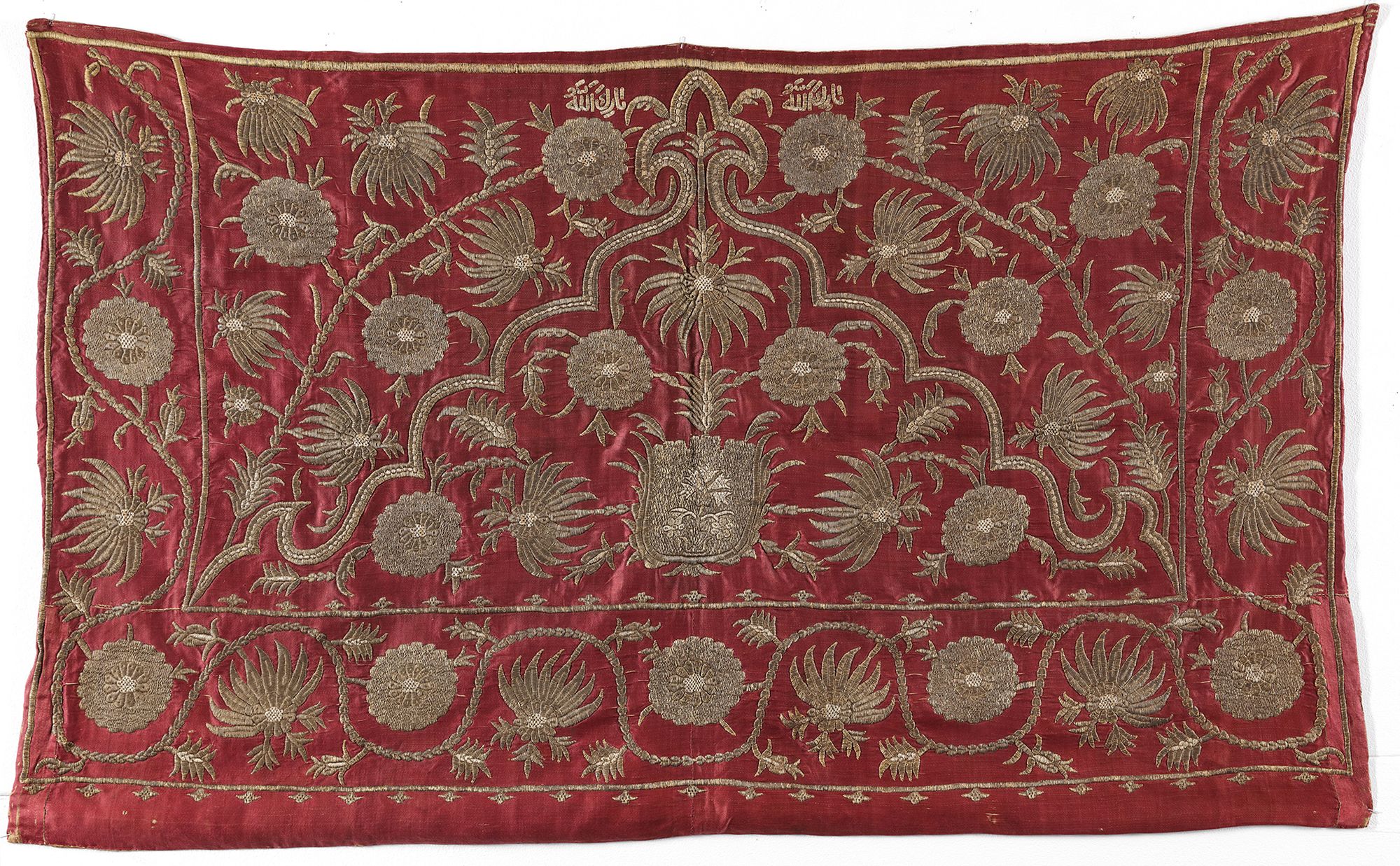 The red silk ground embroidered in gilt threads with a repeating design of large heads of chrysanthemums and morning lilies. 73 by 129 cm.