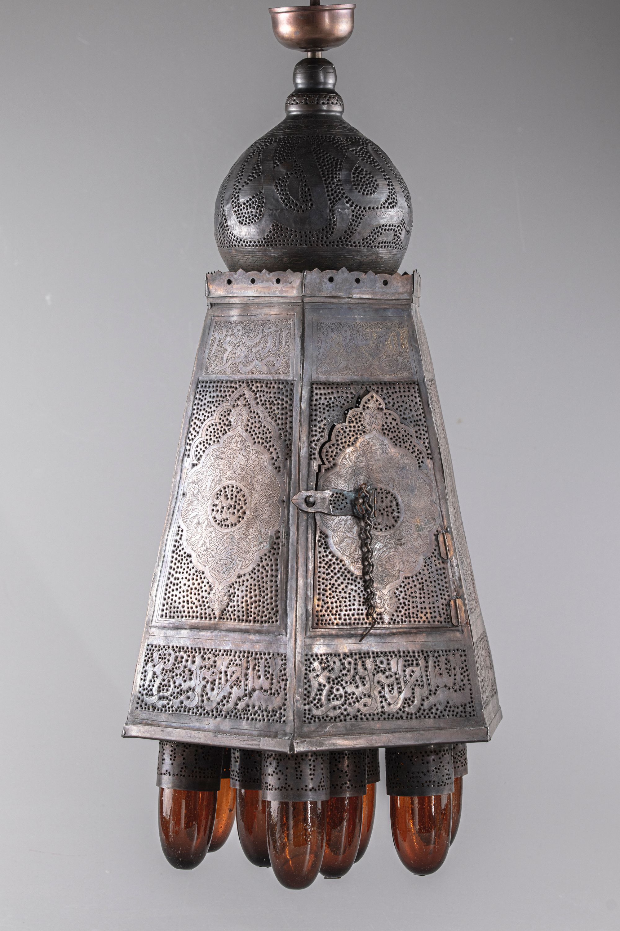 With hexagonal form ,decorated with Arabesque carvings on top, bottom and the holders of the glasses, and latticework in spiral pattern on body of lamp. With cylindrical glasses hanging from the base.