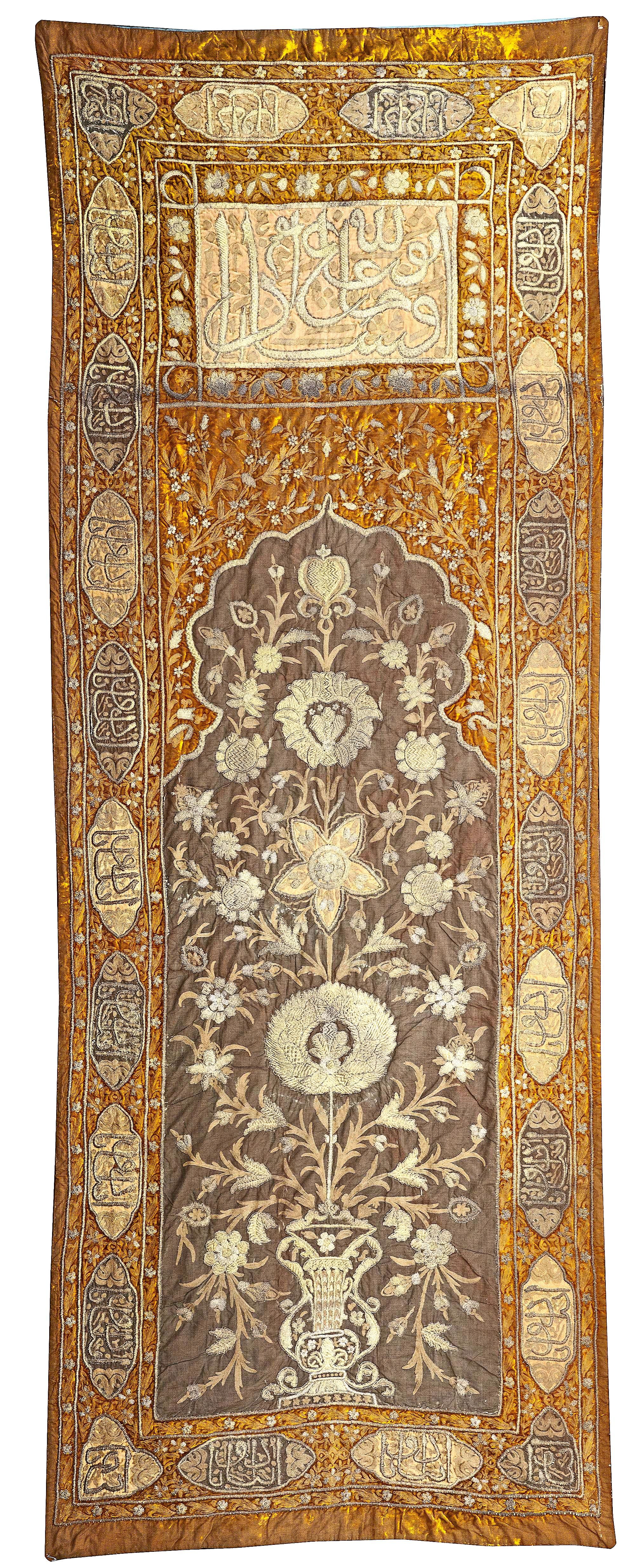 A large silk and velvet hanging panel, embroidered with gilt threads with mihraab shaped panel with a large vase issuing a large blossoming spray on a brown ground. The border with gilt thread embroidered cartouches enclosing Arabic inscriptions on a yellow velvet ground. 115 by 310 cm.