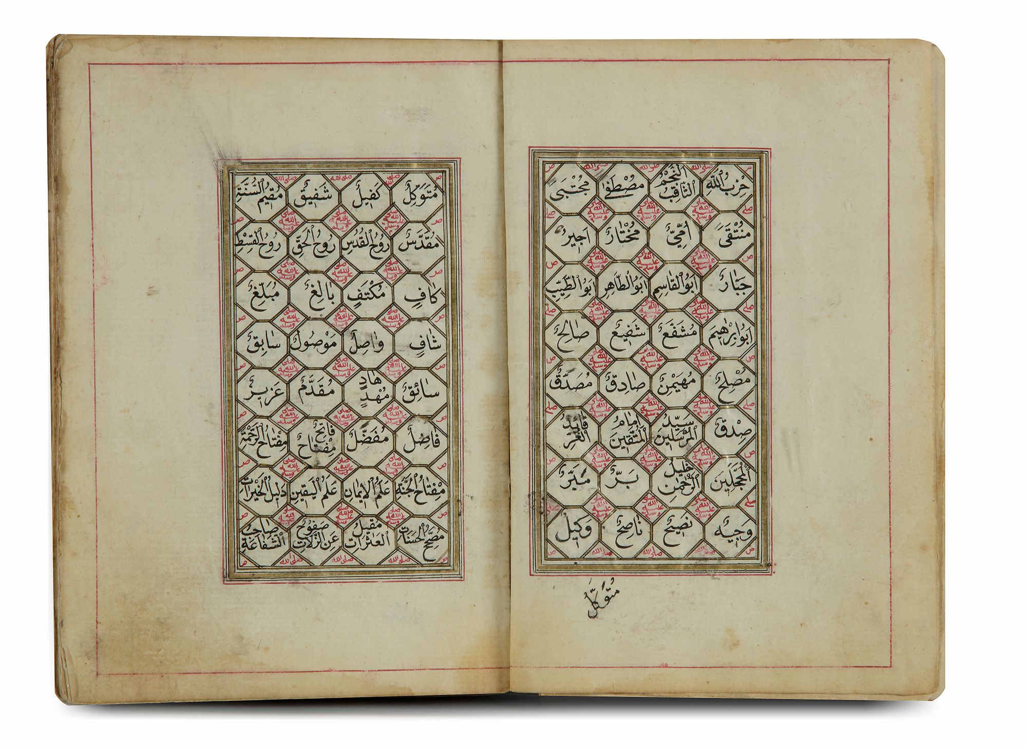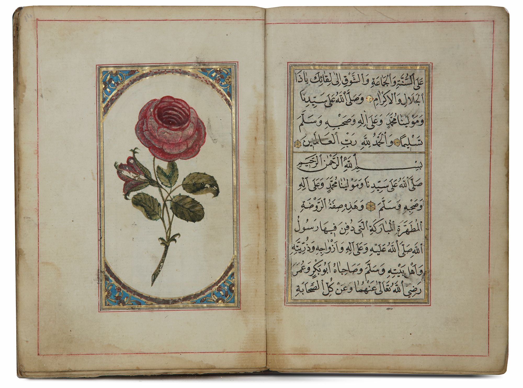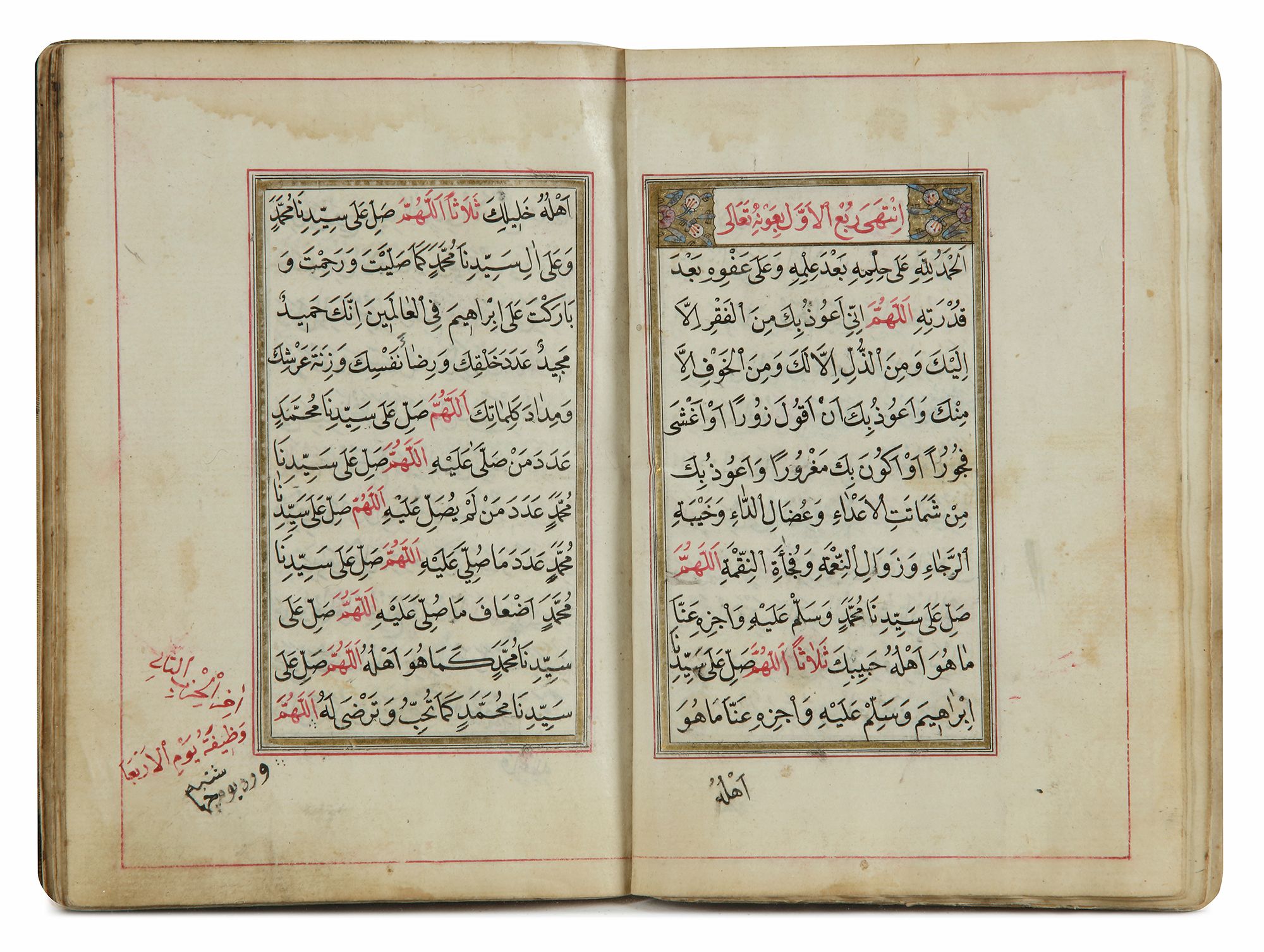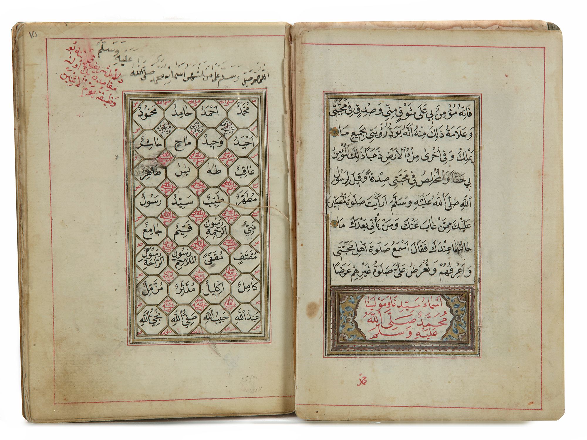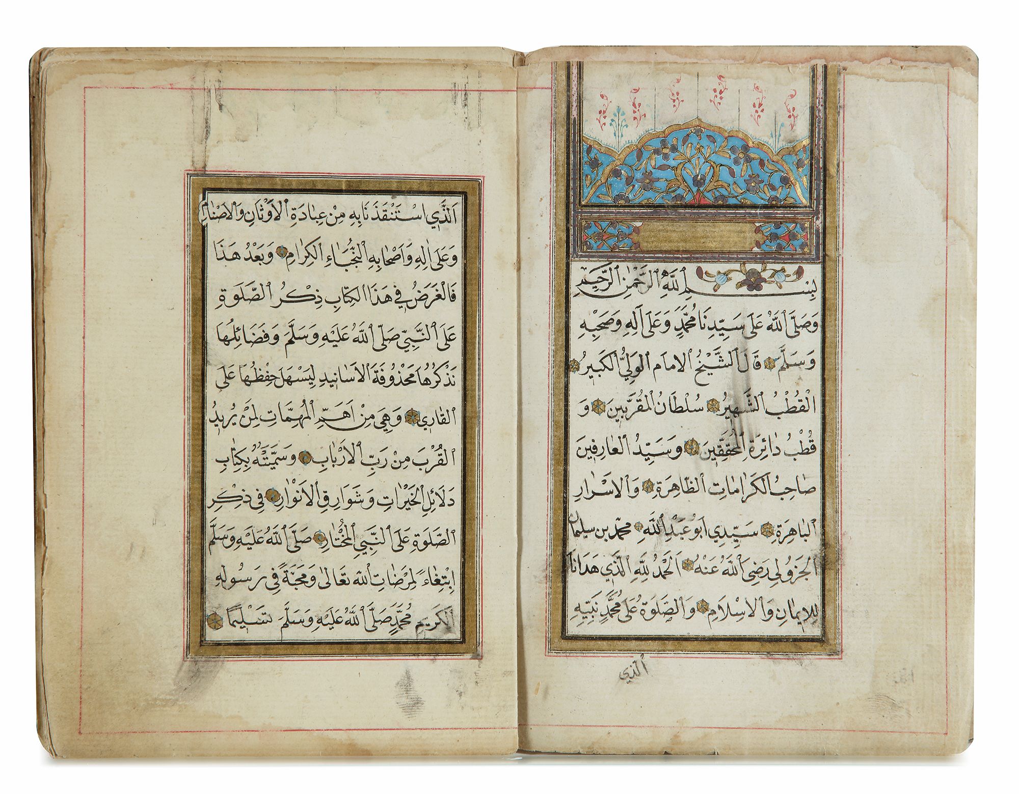 Arabic manuscript of 90 sheets of eleven lines per page in beautiful and regular black naskh with the first page with illuminated frontispiece, then the 'Asmâ 'sayyedina Muhammad' on 7 illuminated pages preceding the drawing of a rose (folio 14), followed by the two illuminated miniatures of Mecca and Medina, followed by numerous prayers.The colophon is signed: Mustafa al-Shukri b. 'Ali Birghusi in the year 1199 AH. Binding with flap in embossed and gilt morocco bun with floral decoration. 11 by 16 cm