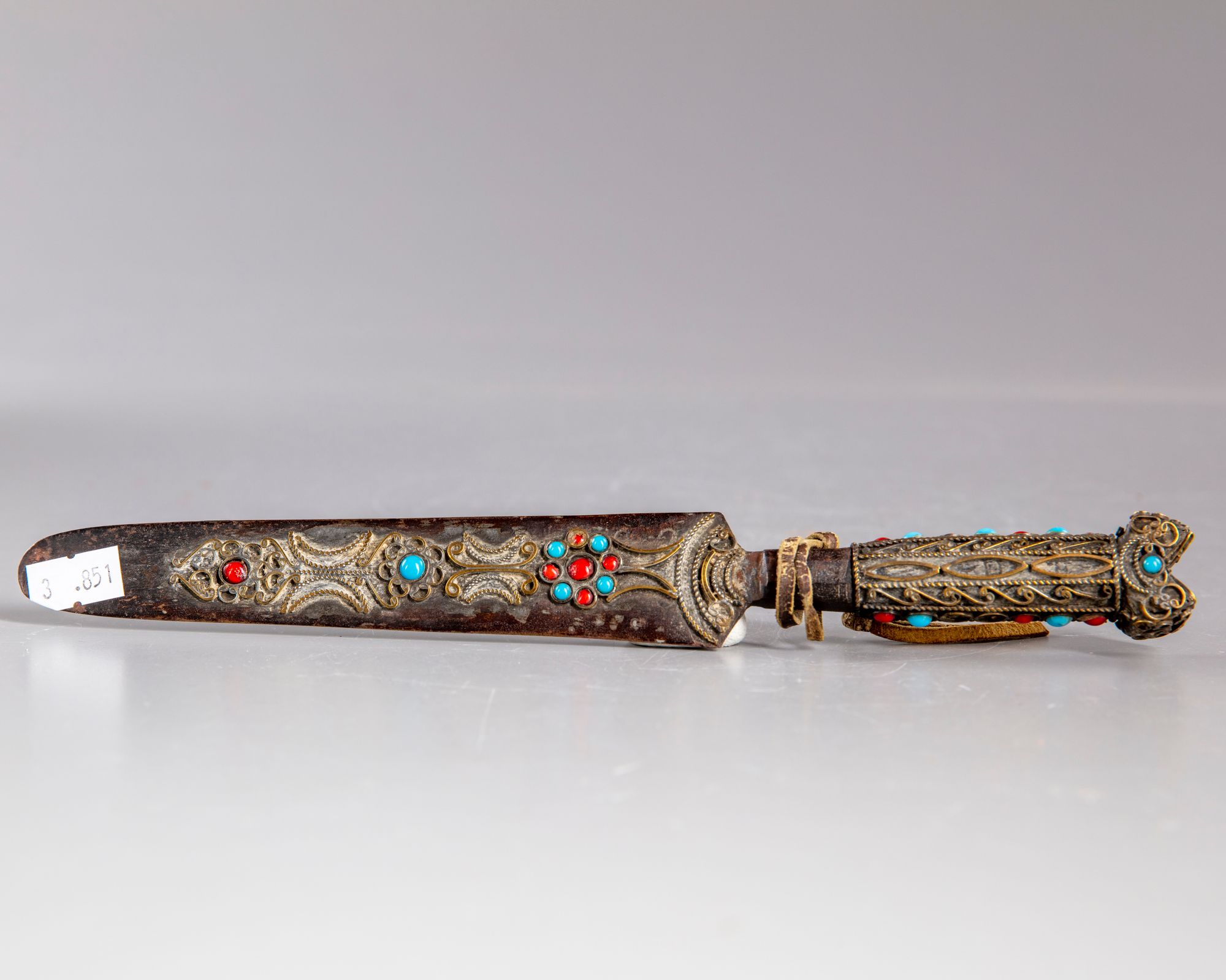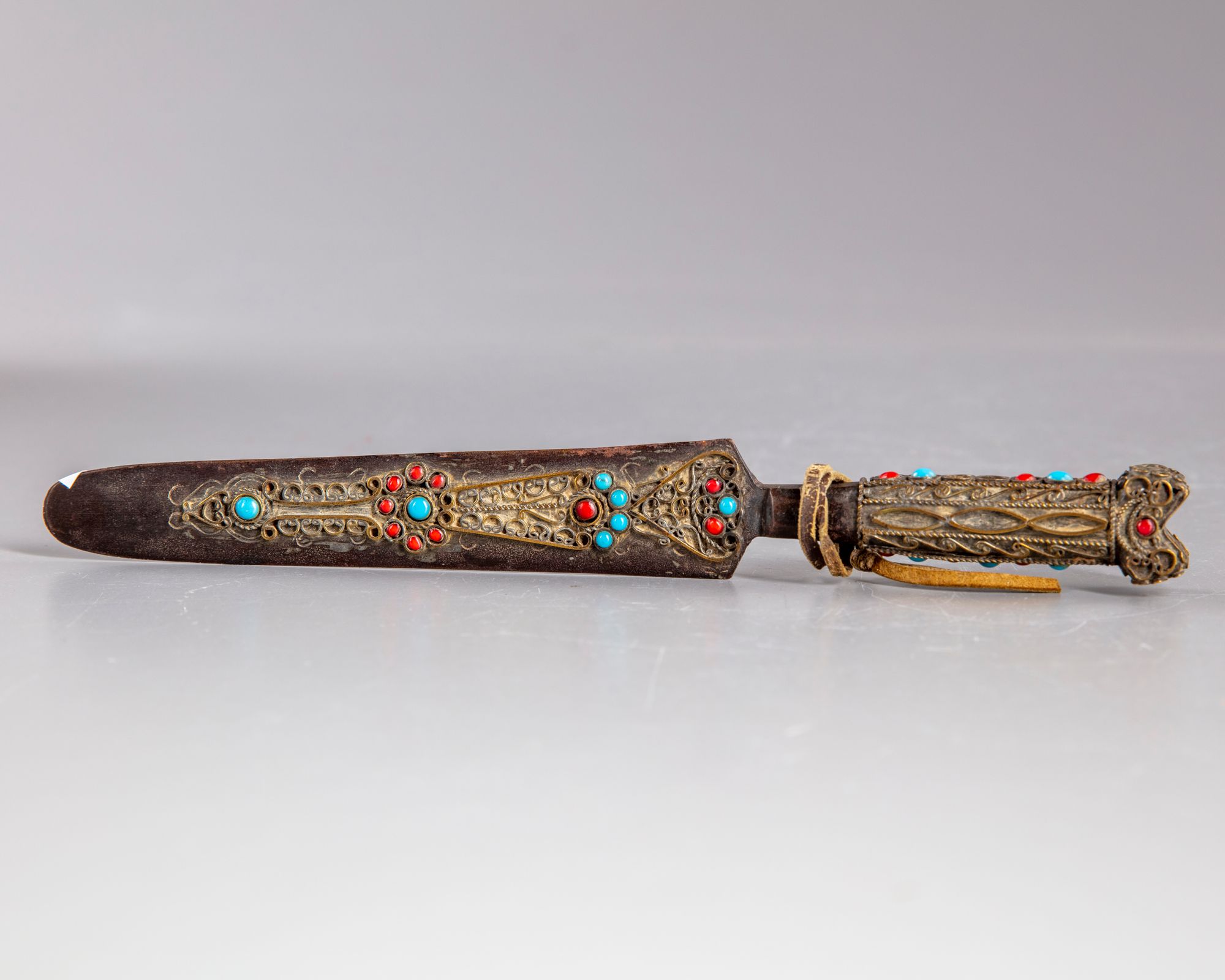 The double-edged watered steel blade of tapering form, the silver hilt of flaring form with domed pommel. The blade and the hills inset with turquoise and coral inlays.