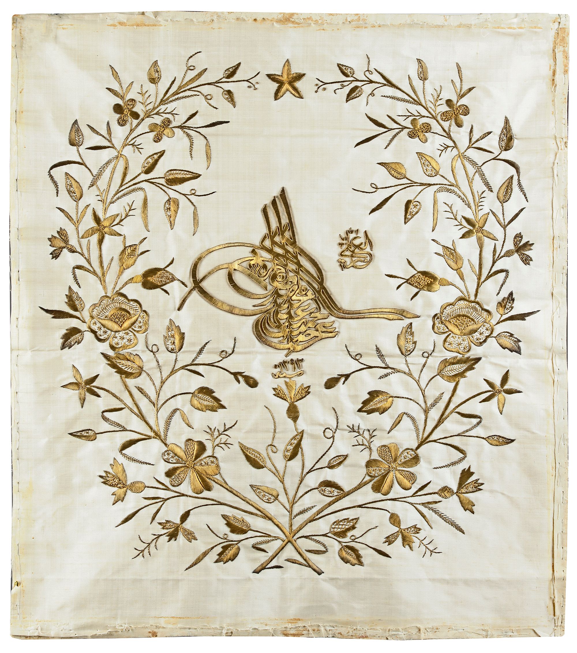 Of square shape, embroidered in gilt wires to the centre with the tughra of Abdul Hamid II ( re. 31 August 1876 – 27 April 1909 with the dating of 1293 AH, surrounded by two large flower sprays with foliage. All on a white cream linen ground. 55 by 61 cm.