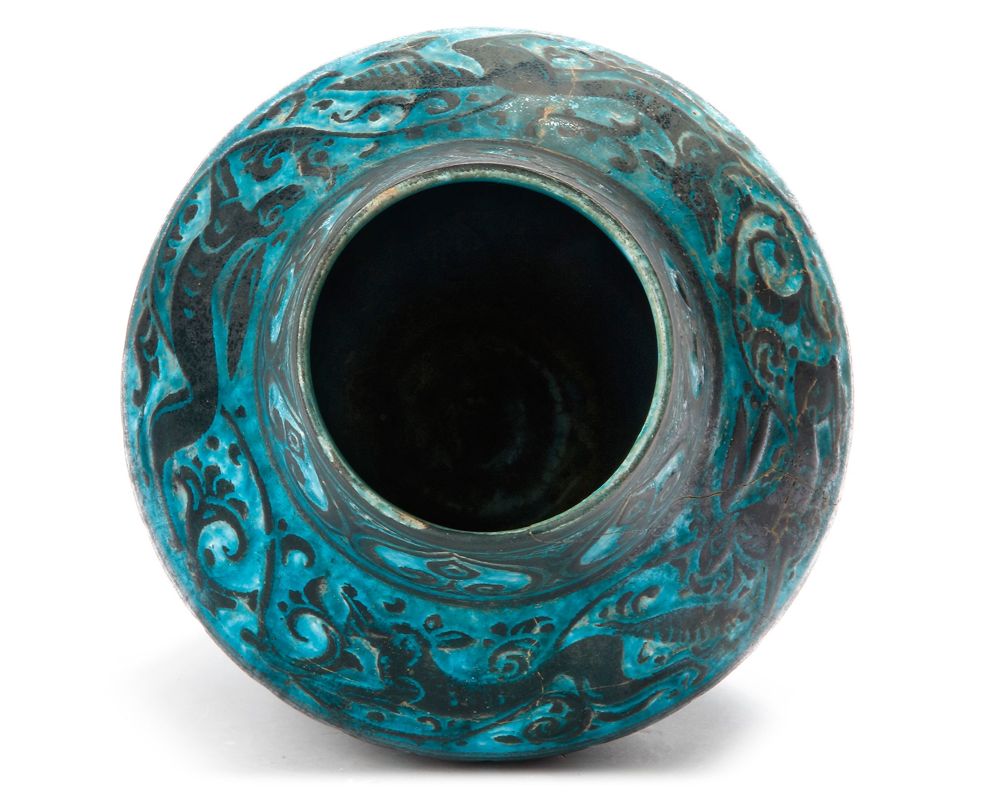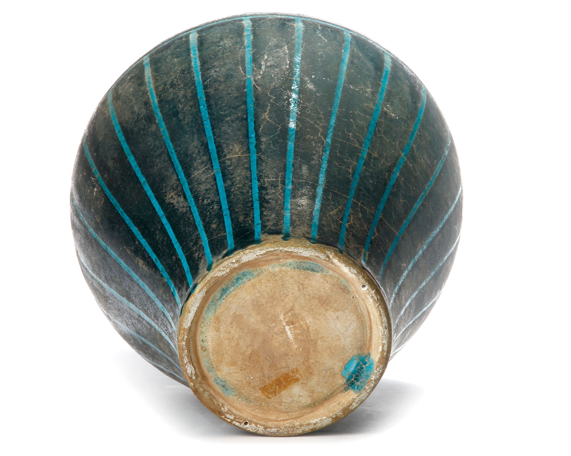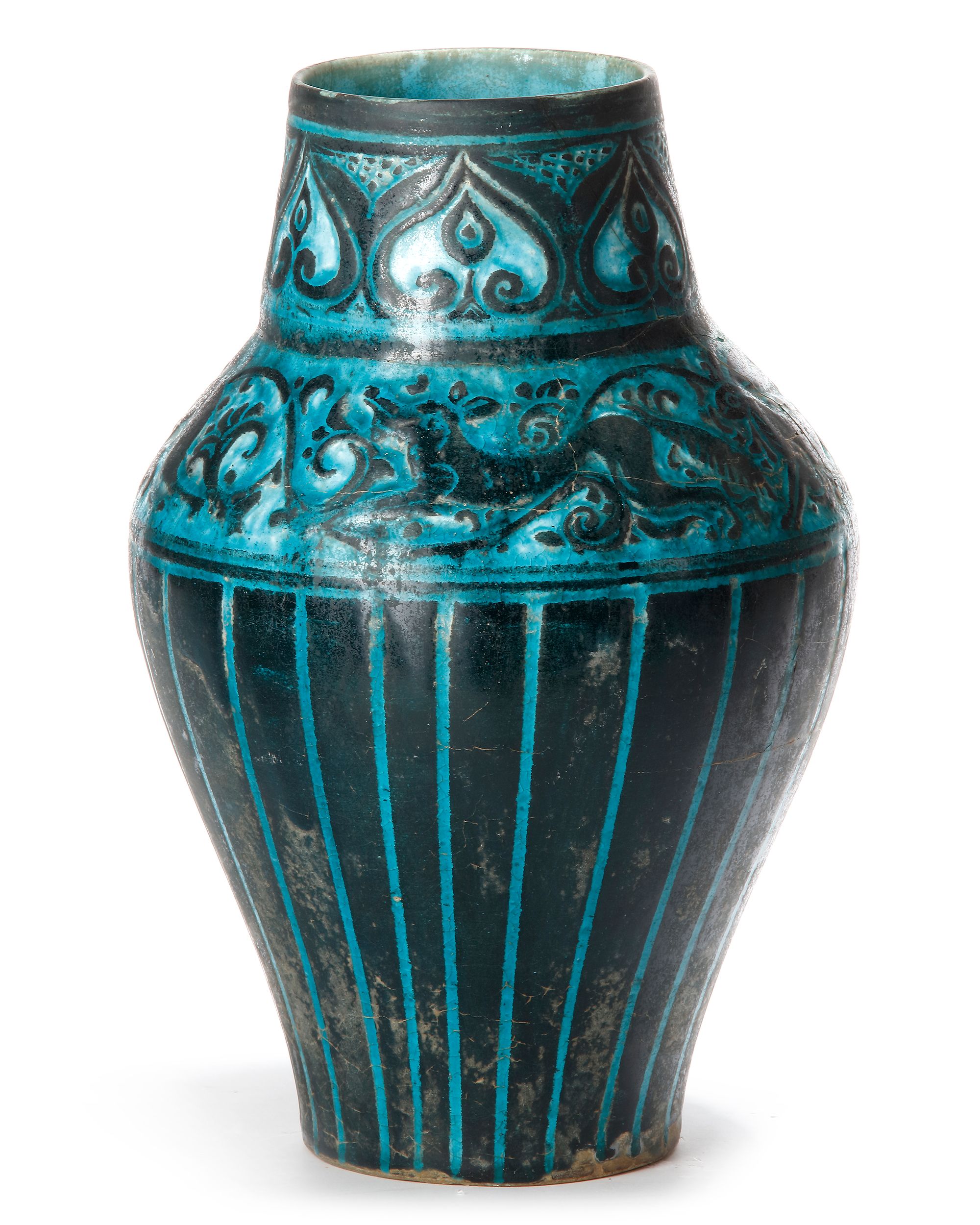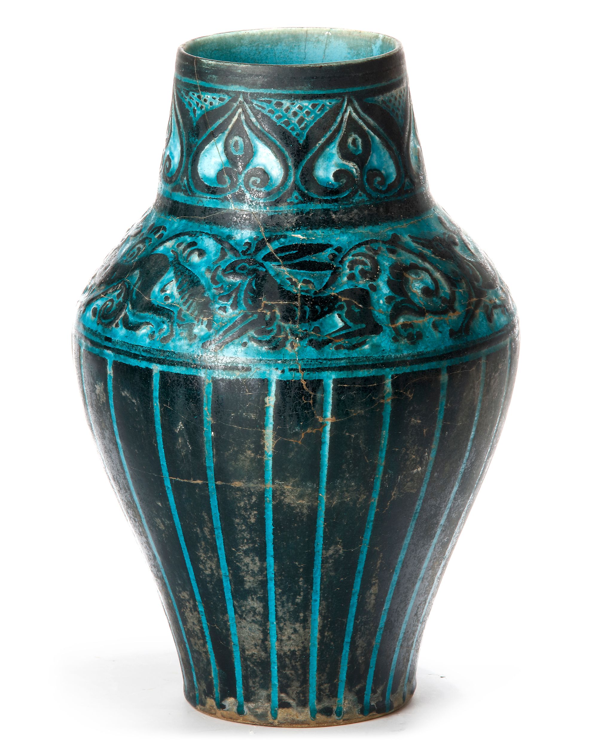 Of baluster form with tapering neck, moulded and decorated in turquoise and black, the shoulder with a band of hares and foxes running on a ground of undulating tendrils terminating in split-palmettes, the neck with a band of palmette motifs on a ground. Of lattice design, the body with a series of panels radiating from the foot.