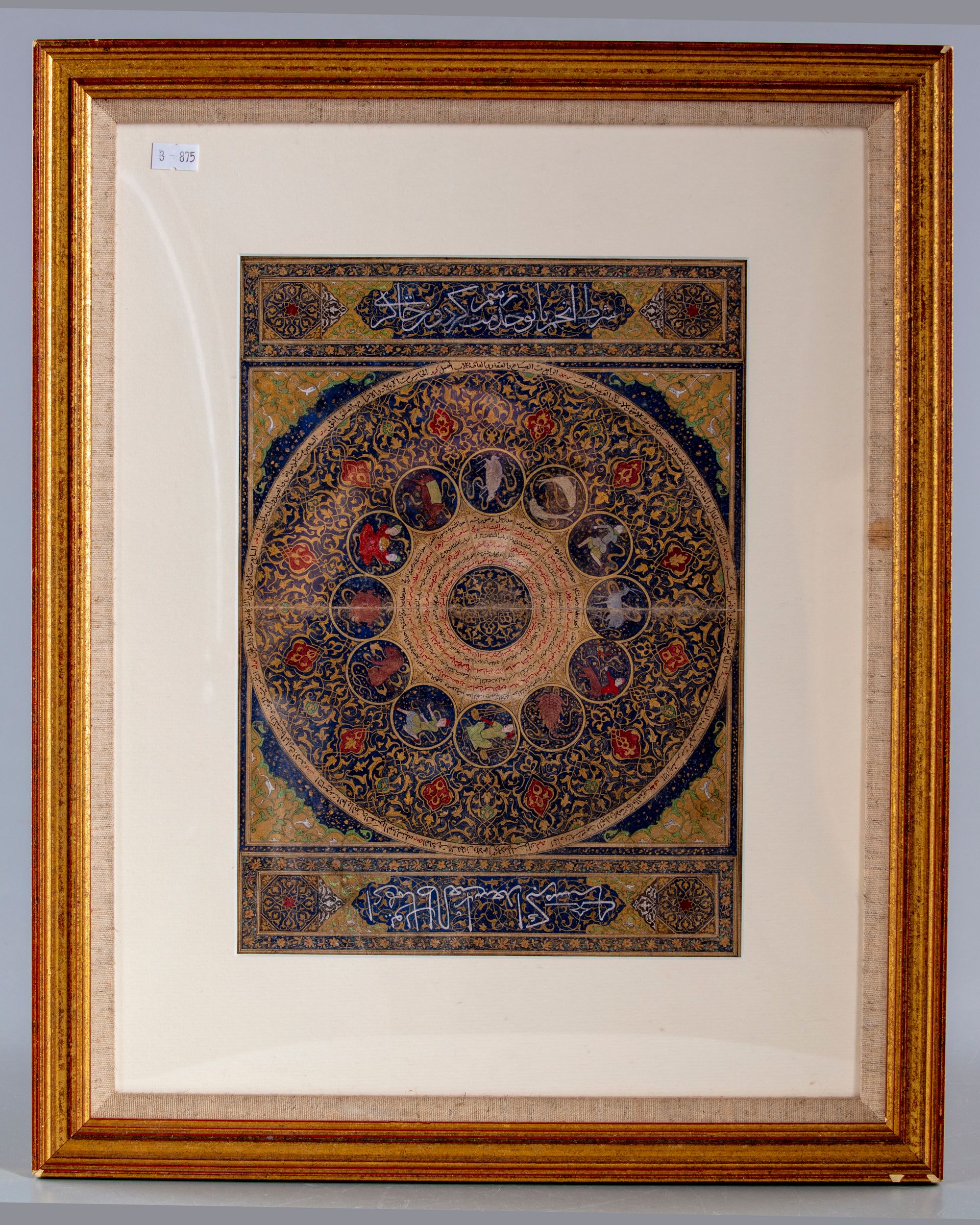 A Persian miniature painting, natural pigments and gold on paper. Depicting astrological signs with Persian inscriptions amongst flowers and scrolls.