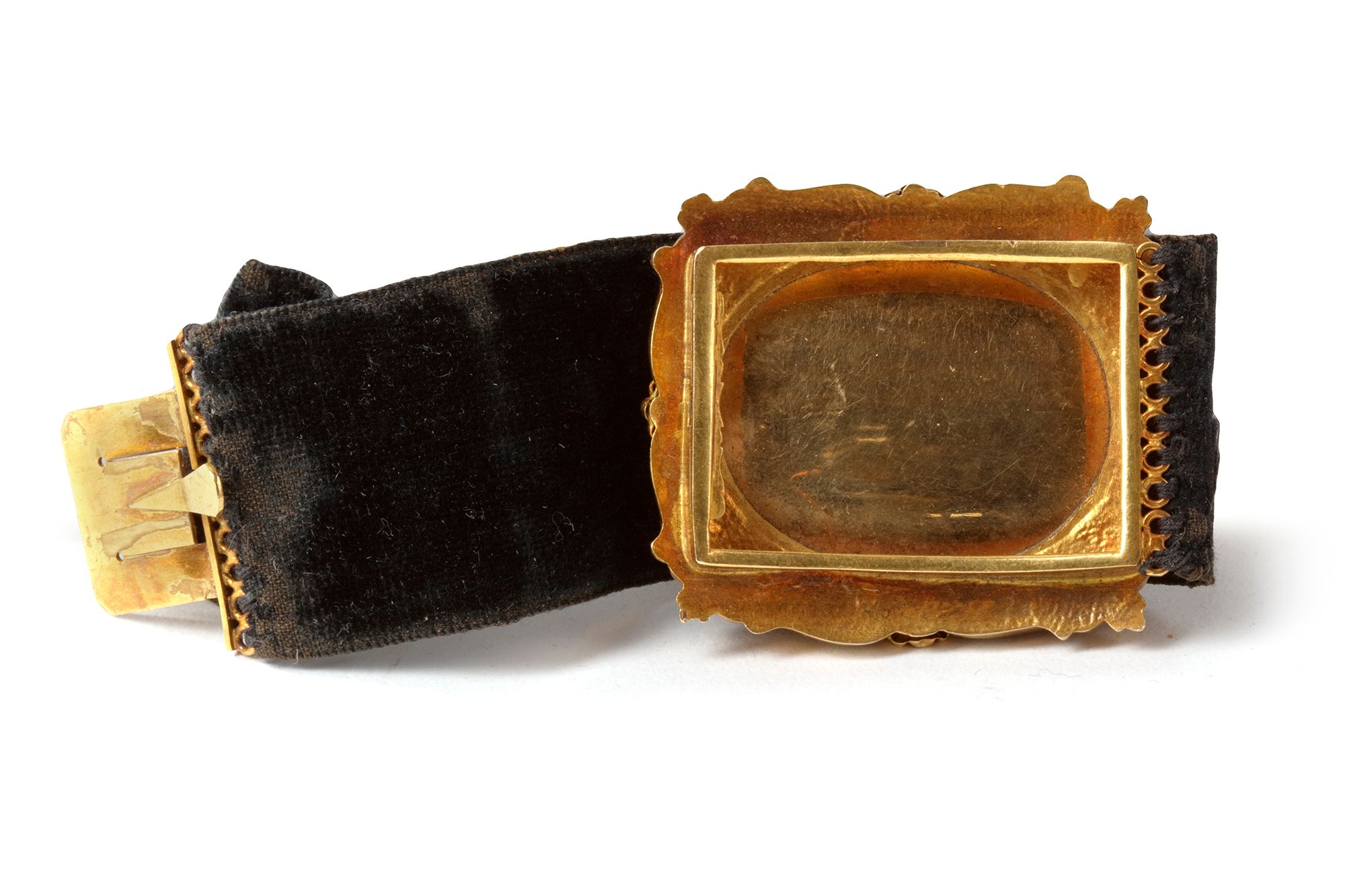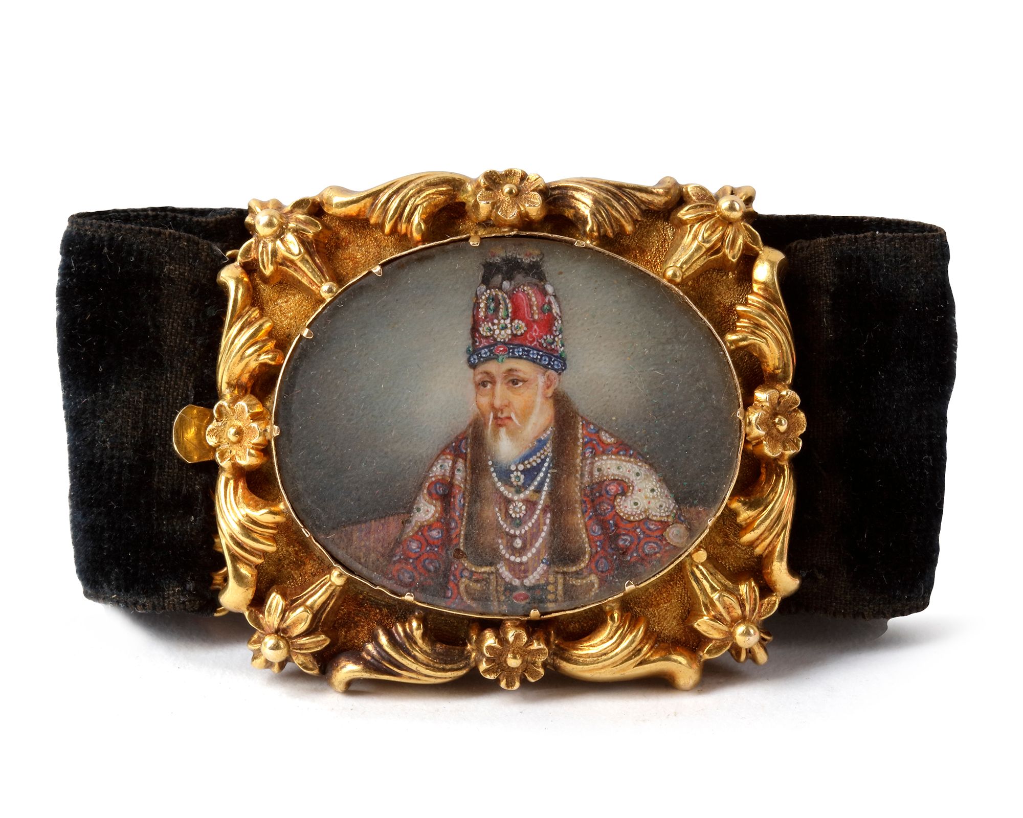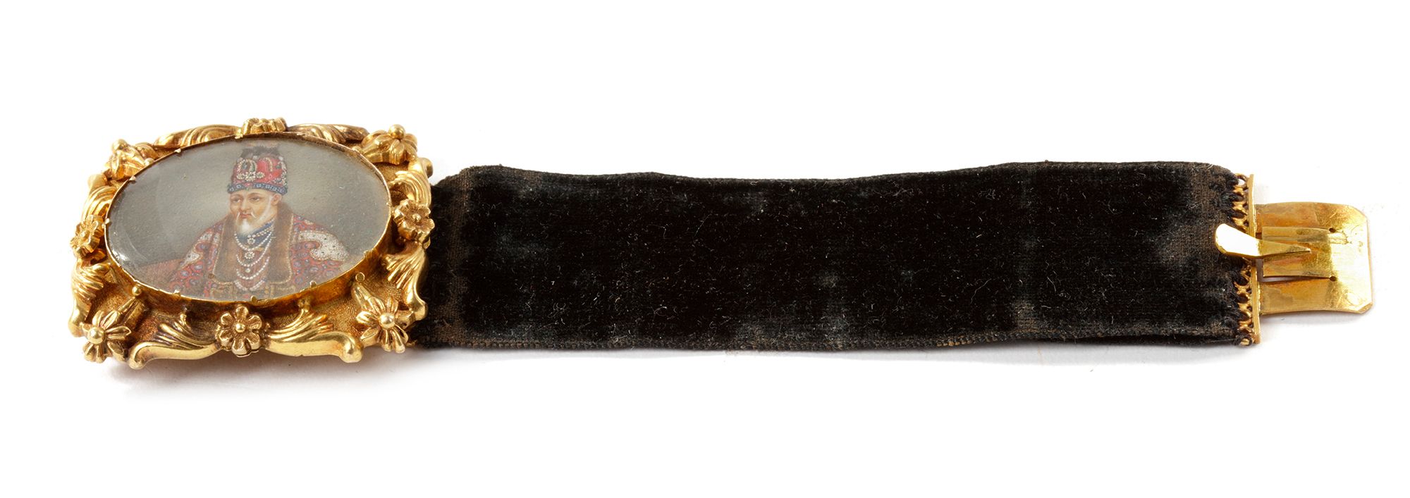 A gilt Mughal belt buckle of flower sprigs enclosing a small miniature portrait of Akbar Shah II (22 April 1760 – 28 September 1837)